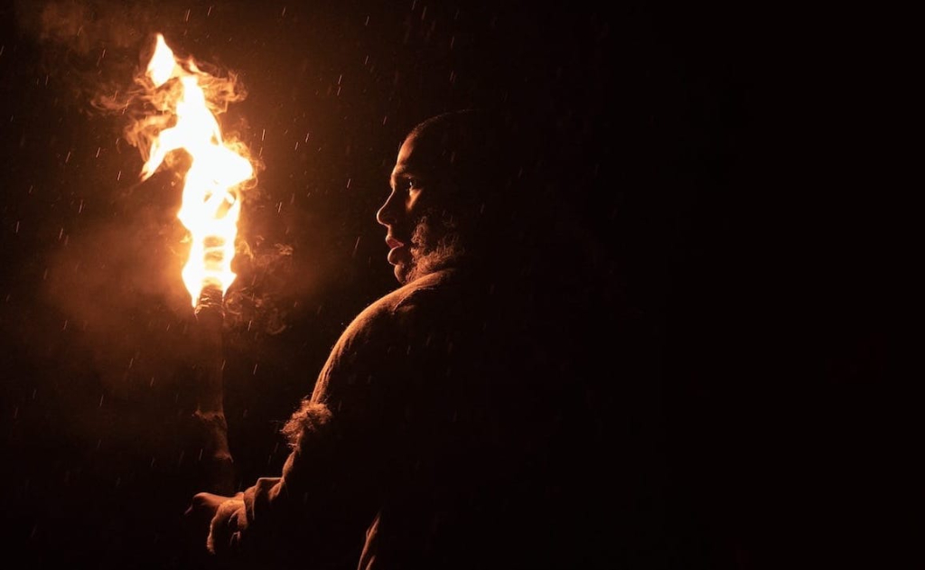 Familiar horror preoccupations are transposed to the unfamiliar cinematic landscape of the palaeolithic age in Andrew Cumming’s intriguing, atmospheric debut. Out of Darkness opens with the scene of a small, close-knit, stone-age tribe huddled around the campfire, with its elder, Odal (Arno Luenig), telling stories of odysseys characterised by hardship and futility. Here is the first thread that connects this prehistoric family to the audience of a film whose philosophy ruminates on the paranoia, brutality and tribalism that is as inherent in us now as it was 45,000 years ago; like tribe leader Adem (Chuku Mudu), his pregnant partner Ave (Iola Evans), Gierr (Kit Young), adoptee of the group, Beyah (Safia Oakley-Green) and Adem’s son, Heron (played by female actor Luna Mwezi), we are huddled together, basking in the power of storytelling, a power which has not diminished since the dawn of time.