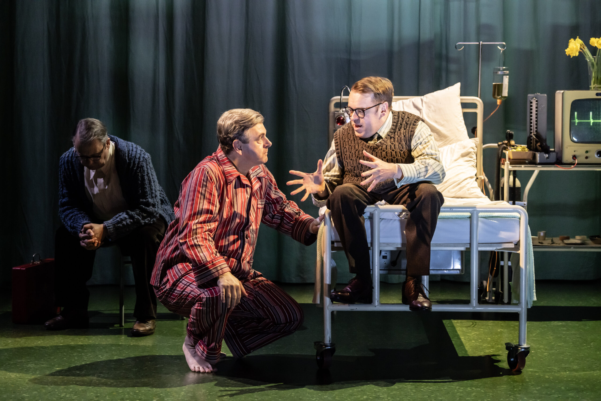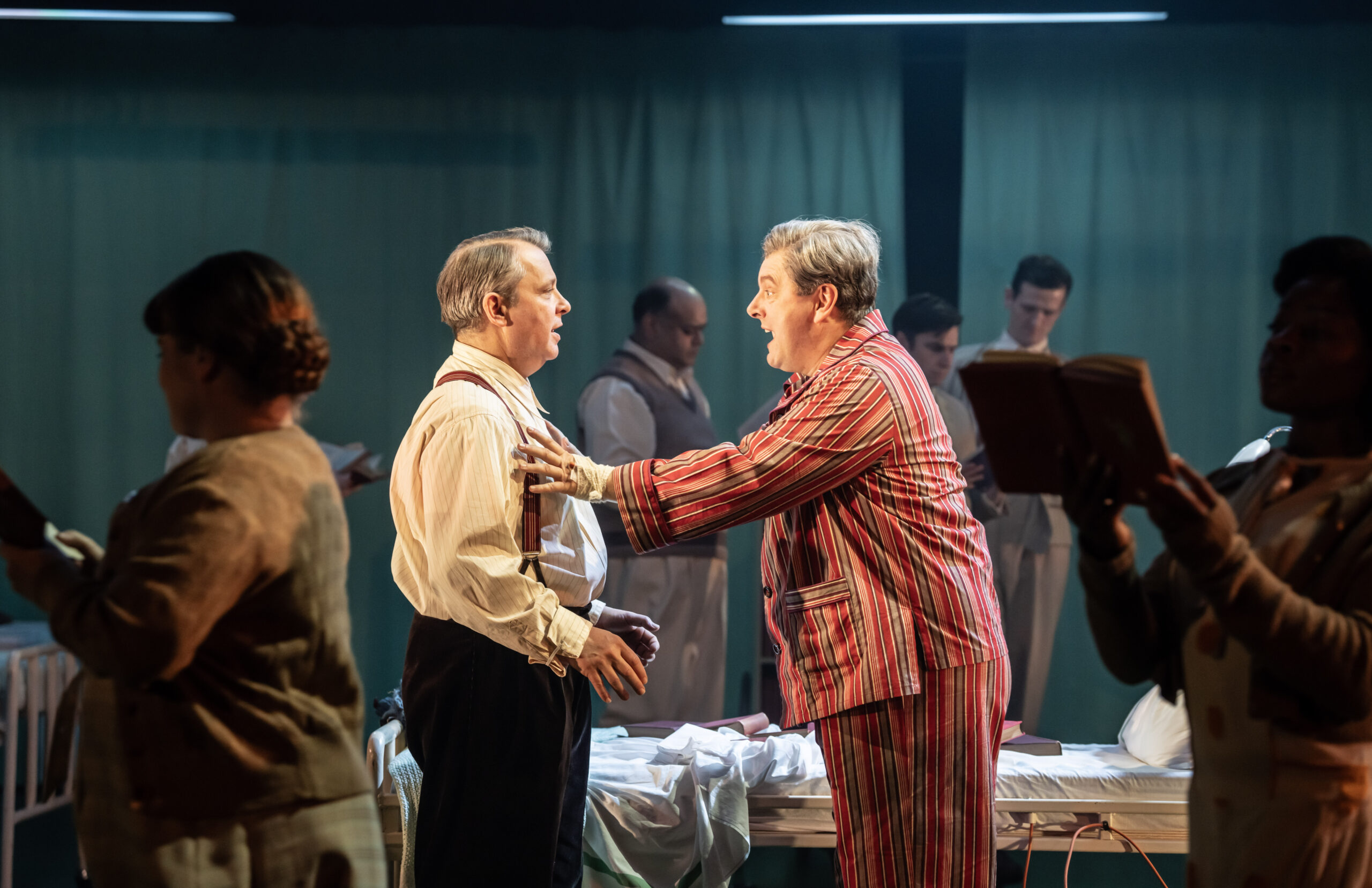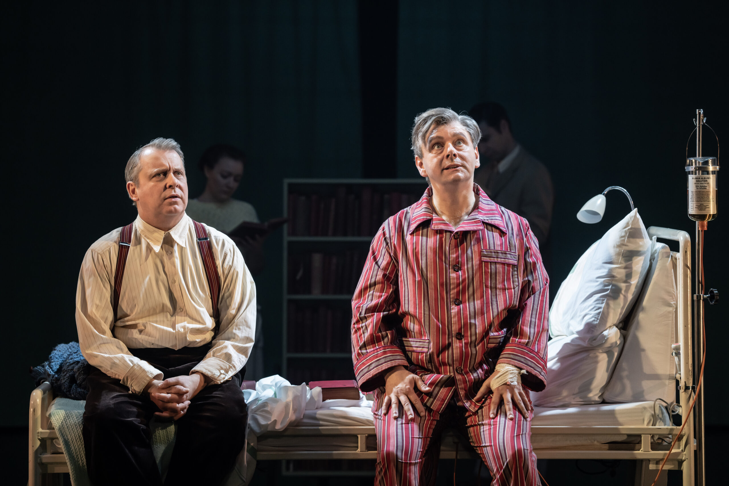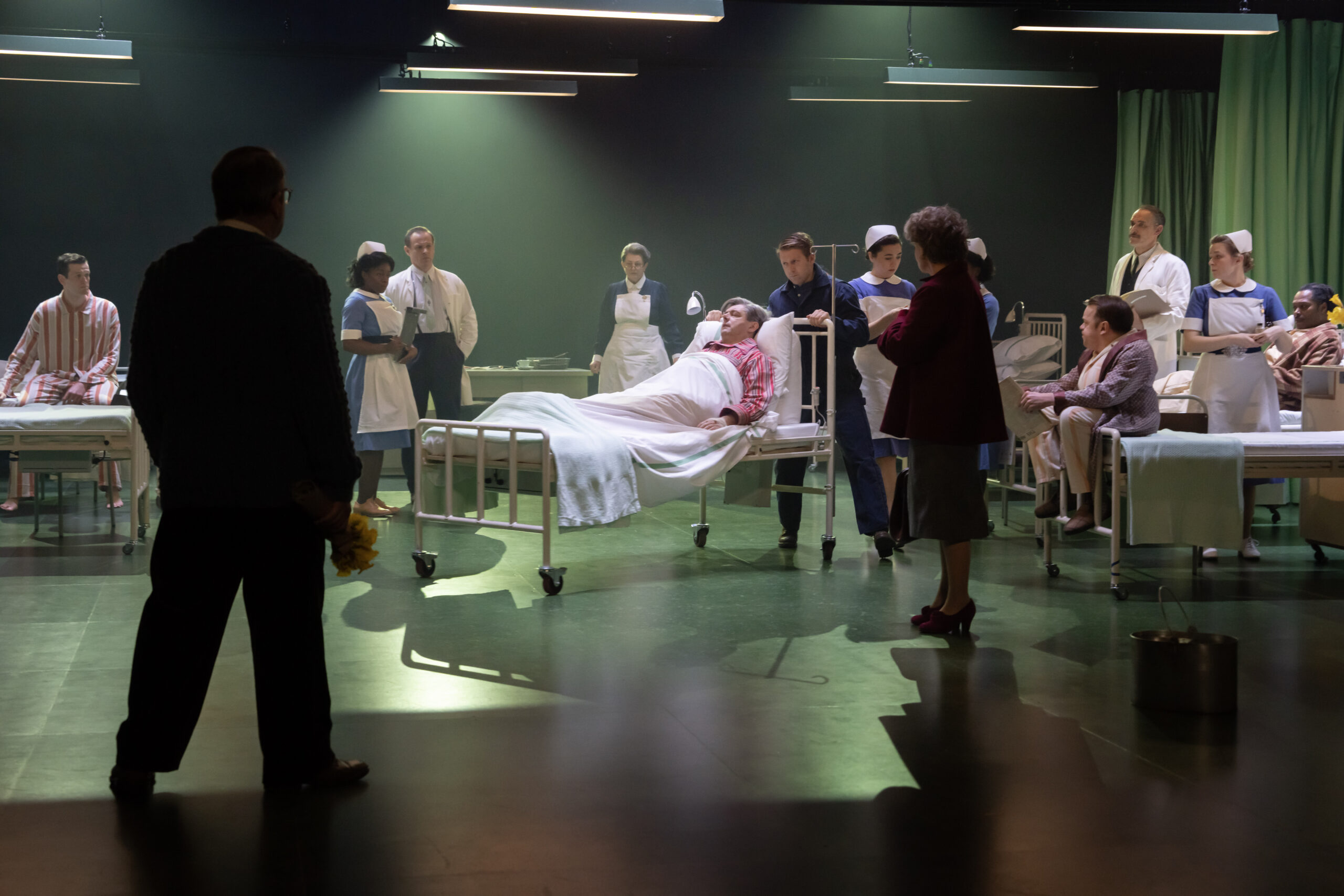 The play opens at the ends of Aneurin’s life, as he lies on his deathbed in a hospital, succumbing to stomach cancer. Nearing his end, he is besieged by recollections. Visions of his youth as a coal miner’s son in Wales emerge. In one moment, he is punished by a cruel teacher for his stutter; in another, we are taken to his time as a union representative for miners, his confrontations in parliament and a pivotal wartime exchange with Churchill. We follow his ascent from local council politics to the zenith of the House of Commons and a position as Minister of Health under Clement Attlee, portrayed wonderfully by Stephanie Jacob, as a witty, somewhat menacing figure.