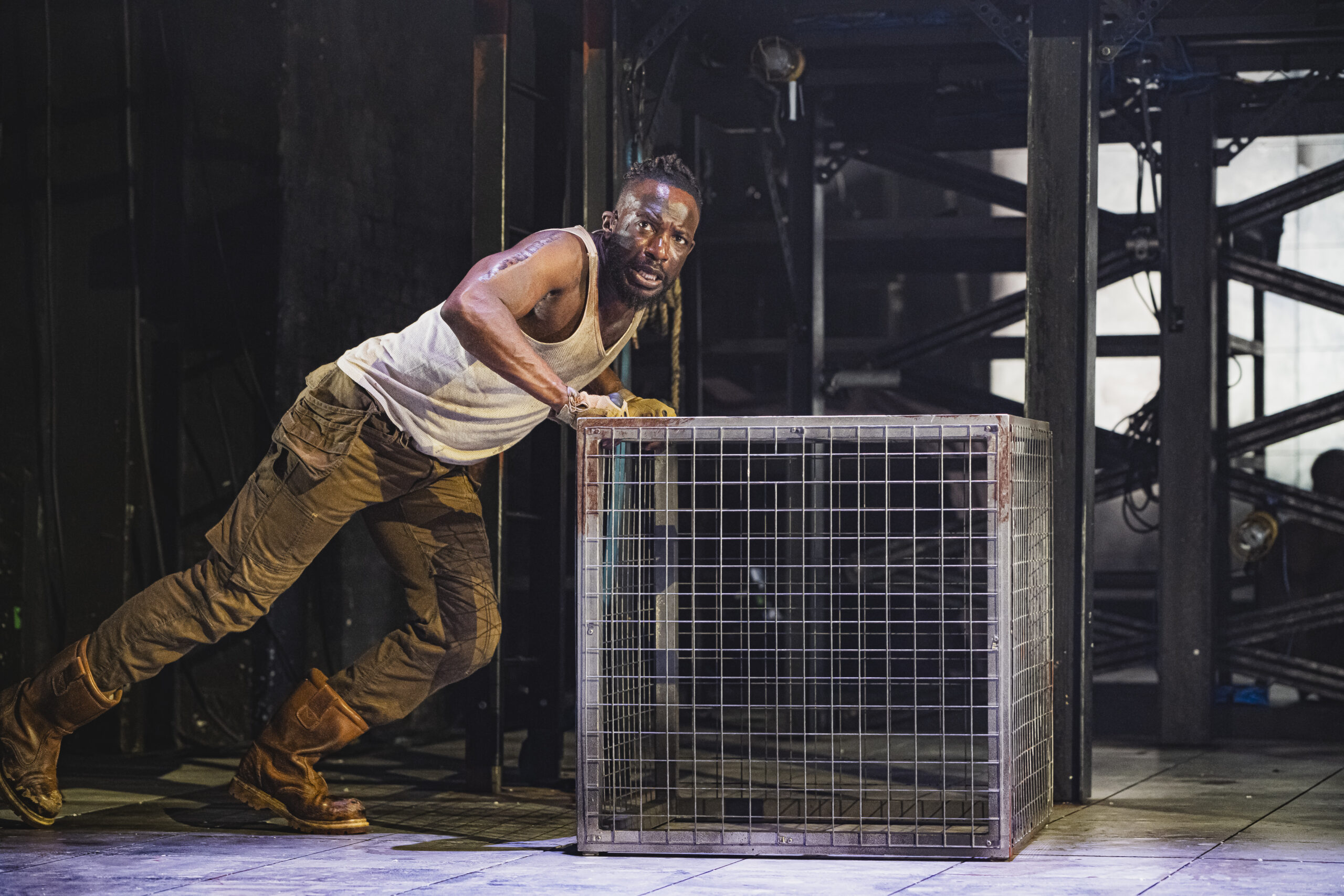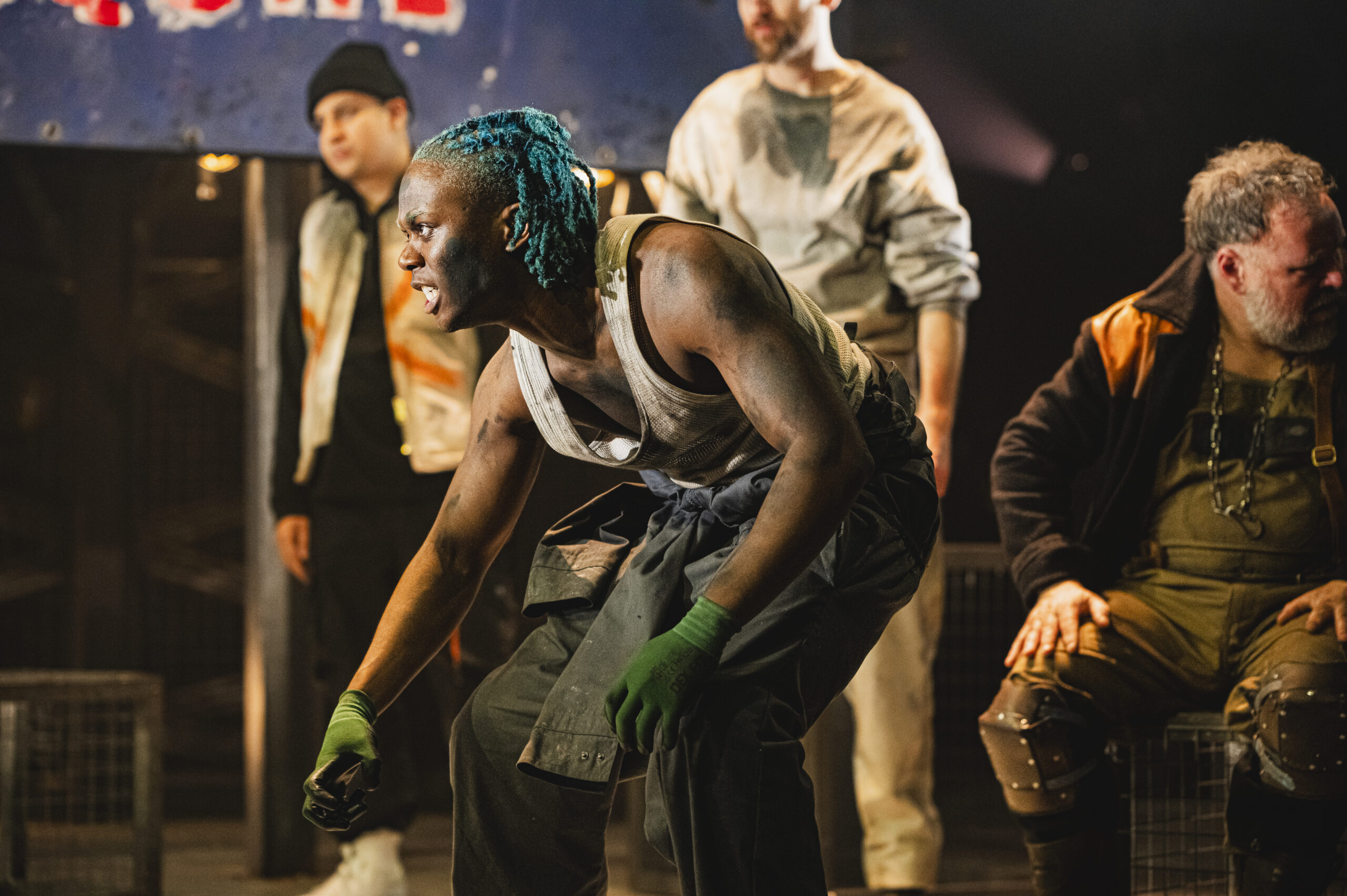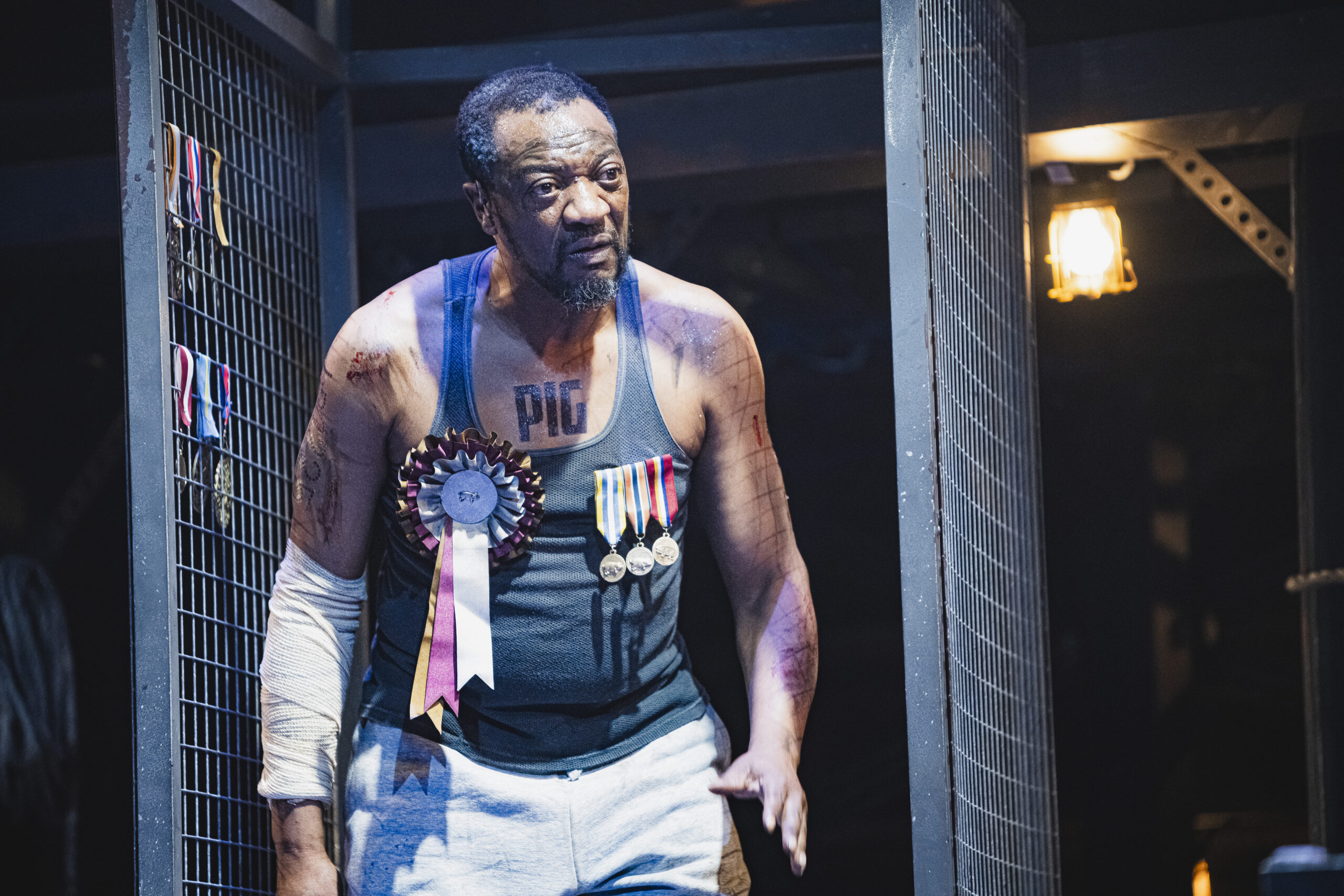 There are no fun and wondrous animal puppets. There are no prosthetics, masks or fluffy costumes. And it’s all the more brilliant for it. The costume design (by Hayley Grindle) is visionary. It couldn’t be more simple but it’s incredibly powerful in its purity, showing the deprivation and the poverty that these characters have suffered. In particular, the pigs’ dirty wife beaters frame their branded flesh perfectly.