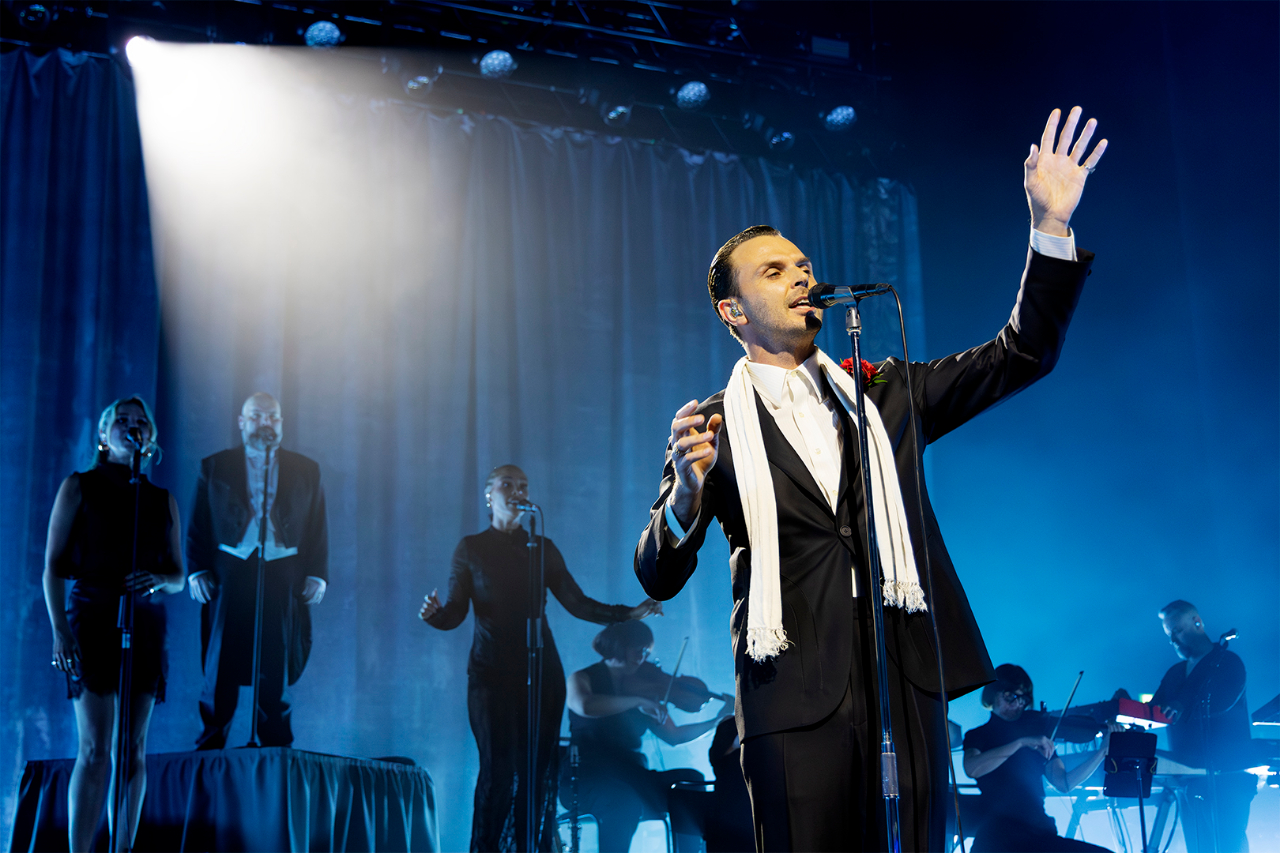 Known for bringing the drama to their music, the show fittingly begins with a boom and a flash of lights. One by one, musicians take their places – strings, keys, drums, guitar, backing vocalists – all dressed glamorously in black. Then Hutchcraft strides on to thunderous applause, his sharp black suit and white scarf draped stylishly around his neck, looking equally at home at the opera or a formal dinner… then again, tonight is a very special night.