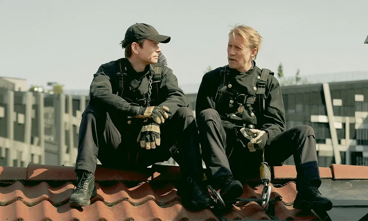 The men are revealed to be chimney sweeps, supposedly living and breathing good luck charms to those crossing their path, but through their profession, the audience is permanently confronted with different types of infrastructure. Staircases, balconies and construction sites are central visual motifs, but the cinematography equally makes use of interior designs of their respective homes. Immovables are the polar opposite to the humans traversing these spaces, who are governed by fluidity and instability.