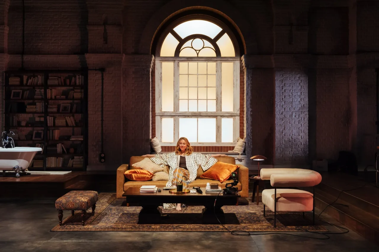 Hughes captures Katya’s assertiveness well, immediately correcting Pierre’s definition of her from actress to actor and redirecting the conversation several times. She darts around the apartment – pouring wine, trying on designer accessories and dancing to music, clearly attempting to project a confident, dynamic persona. Despite this energy, the character often feels contrived and somewhat caricatured, with some lines landing with such scripted blatancy that one felt jolted out of the naturalistic setup of the apartment and back into the theatre setting. Katya’s face is frequently projected onto the brick wall at the back of the space through livestream and recorded video clips, but this device feels more like a visual cue rather than a significant commentary on or fresh observation of influencer culture.