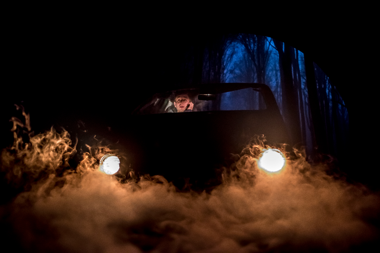 Arguably, the best of the three stories comes from Simon Rifkind (Preston Nyman), who is driving back from a party when he crashes into something…or someone. As he frantically tries to get his car to start, while calling his parents, the atmosphere intensifies with the mist; credit to set and costume designer Jon Bausor.