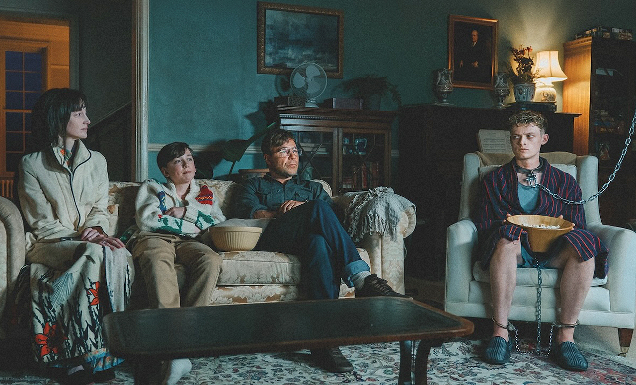 The approach to production heightens the suspense in the picture. There’s a sense of calm that dominates the visuals and audio after that opening sequence. That sharp distinction emphasises the before and after of Tommy’s life of being kidnapped. It highlights the person he was – cruel and mean with no regard for other people – and the journey he goes through in becoming kinder and more considerate. There’s a disturbing dichotomy in his progress and the terrible, awful things he goes through. The classical music amplifies the absurdity of the film, creating normalcy in Tommy’s chained figure, while the cinematography marvels in the use of reflections and transparent surfaces. Scenes of Tommy looking through the mirror and the use of the TV showing videos of his nights out symbolise an internalisation of the person he was and the life he left behind. The presence of doors, windows and arches visually showcases his role as an outsider in this newfound family.