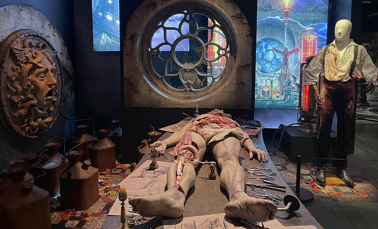 Perhaps the most striking piece is the floor sticker that connects one section of a room to the next, marking the important statistics that set the framework of the love and effort poured into every aspect of the feature. It covers the 23 Ontario locations where Frankenstein was shot; the 2830 days it took to build the lab; the 42 prosthetic silicone pieces used to transform Jacob Elordi into the creature; and more. There’s something quite astounding about seeing the sheer number of statistics involved in the creation of Frankenstein. However, displaying it on the floor is an odd choice given that guests have to step over these numbers to move onto a new section. It does feel a little like trampling over people’s hard work.