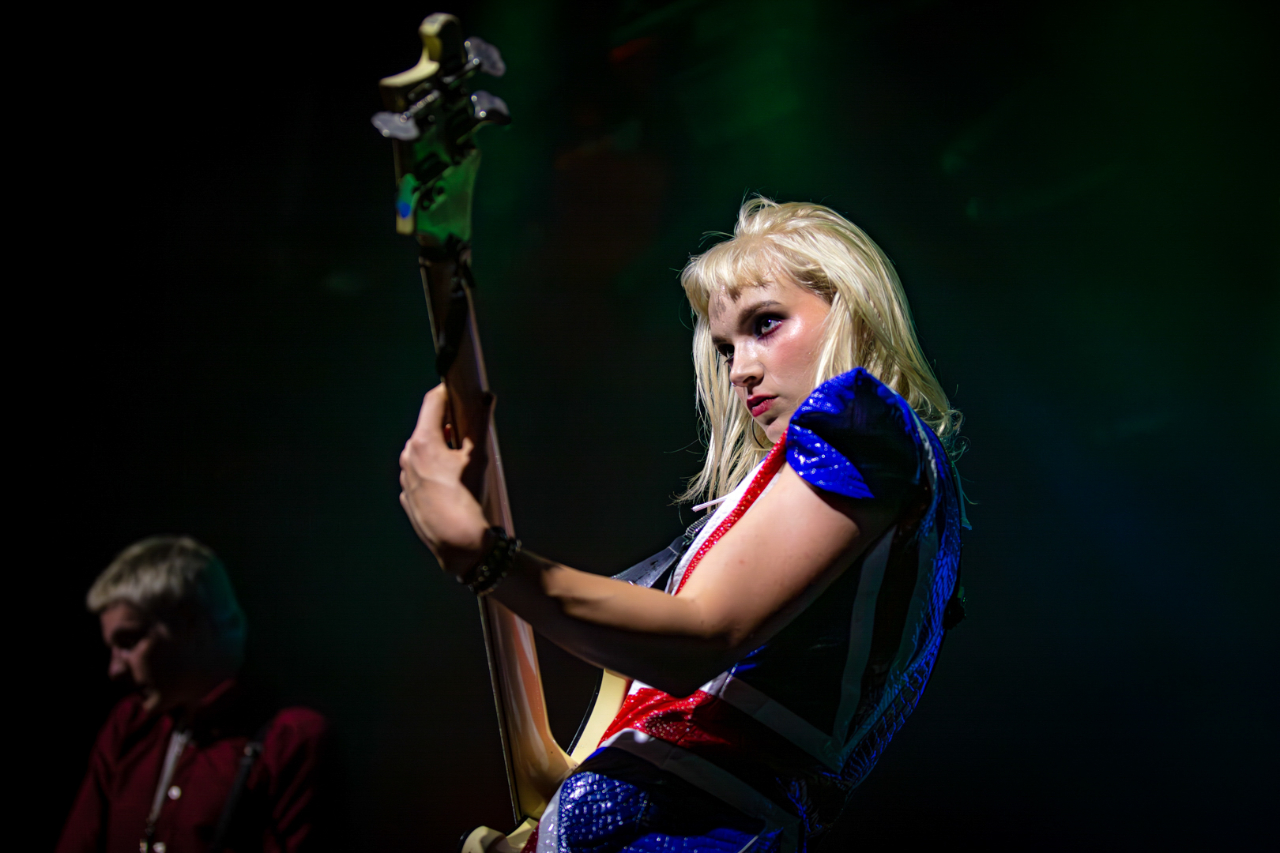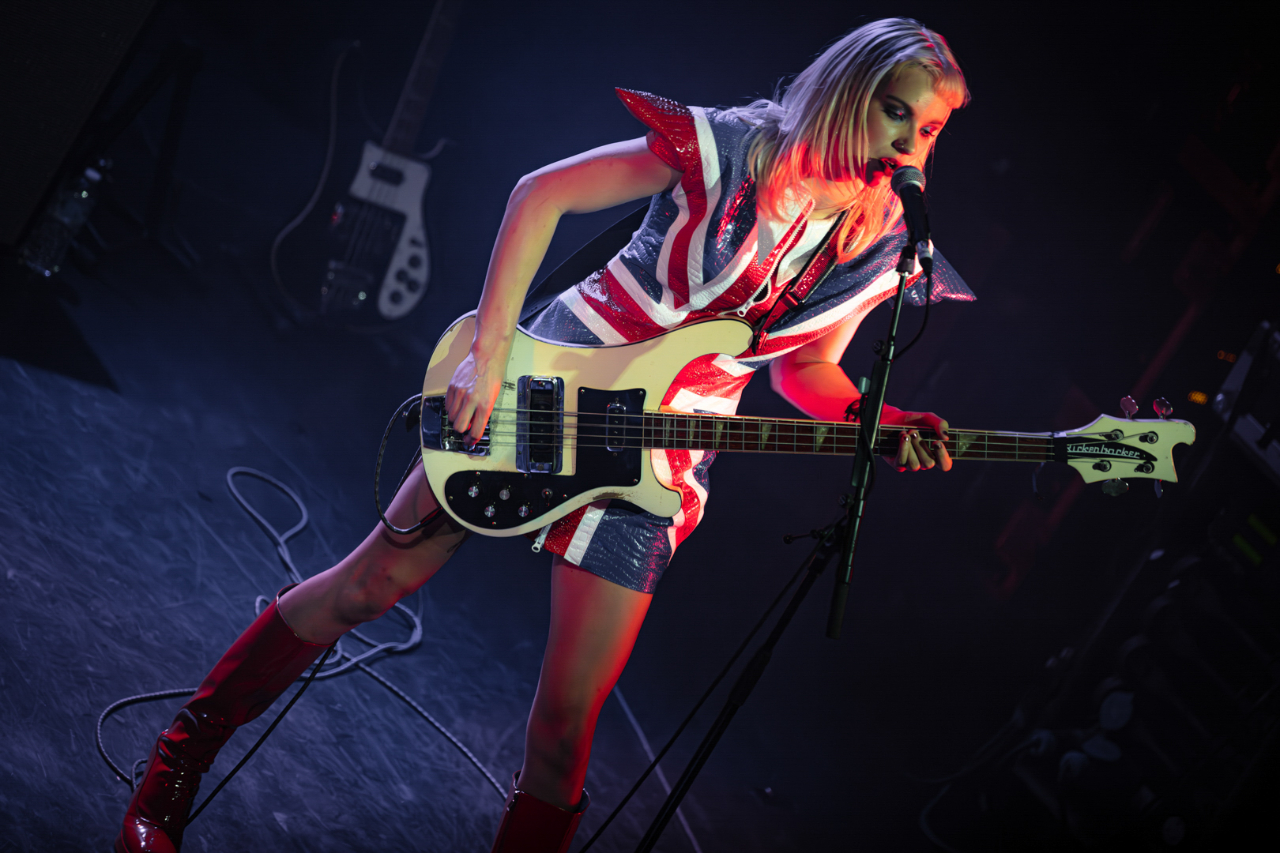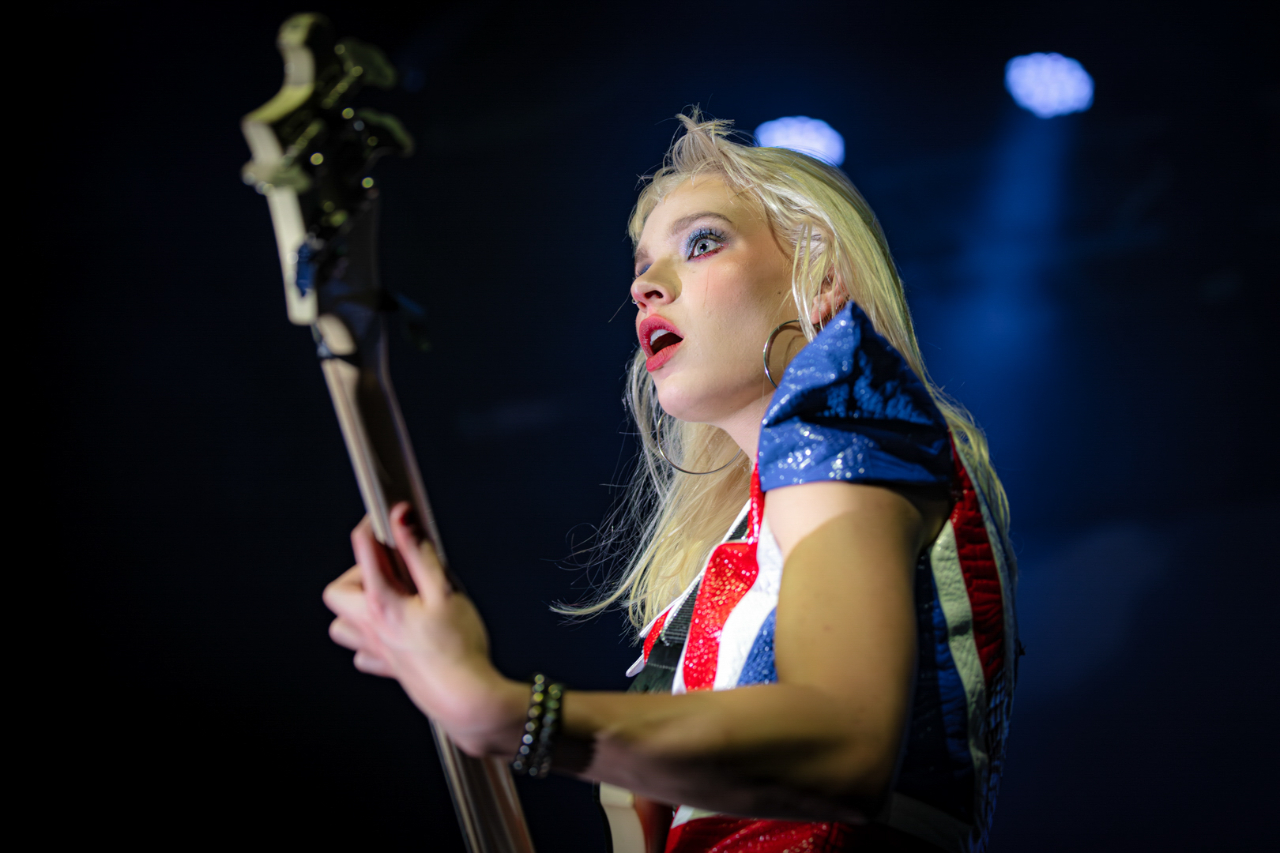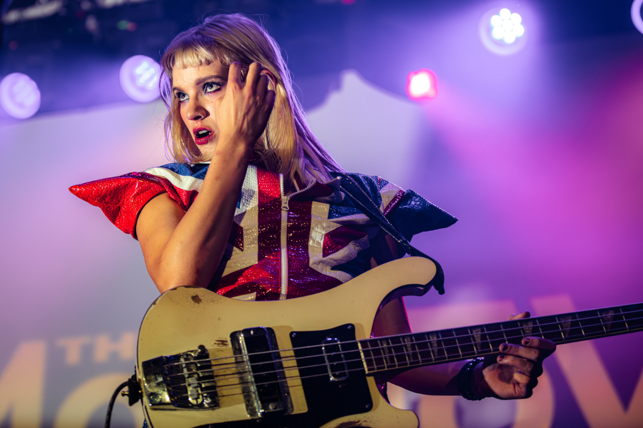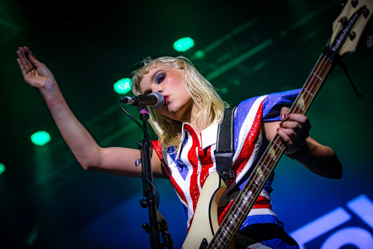 They open with Urbia, followed by Newsflash, and within seconds, the pit turns into a mass of movement. Their sound is urgent and carries tension; chaos meeting control. One can sense their street-performer roots in the way they handle a crowd: no hesitation, and no fear in feeding off their audience’s energy. There’s an element of theatricality which feels deliberate but not artificial: Issey will occasionally lock eyes with the crowd as if looking into a mirror, flicking her hair mid-riff, pouting. The audience picks up on it, reciprocates, jumping up and down, and raising fists during set highlights like Johnny Don’t be Scared. The physical connection between band and audience is both rough and communal; alive.