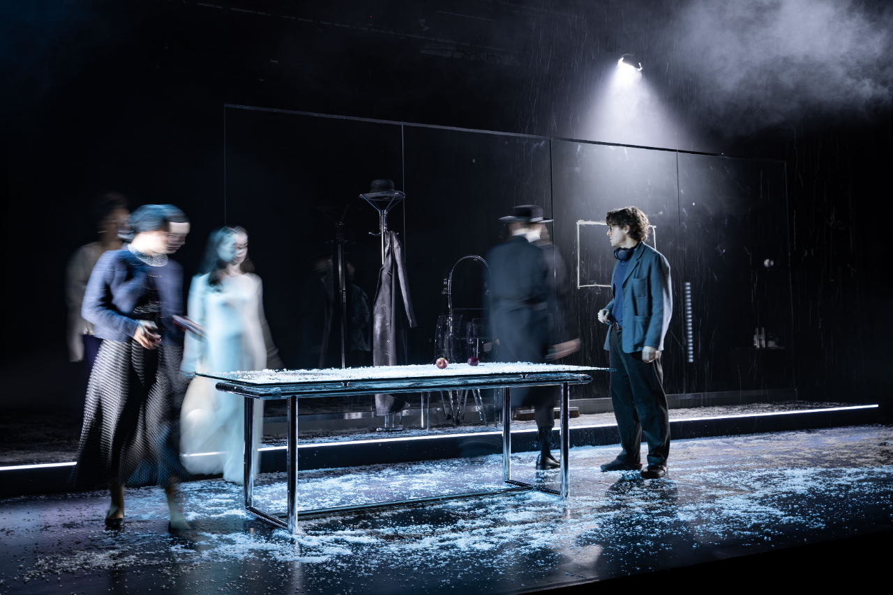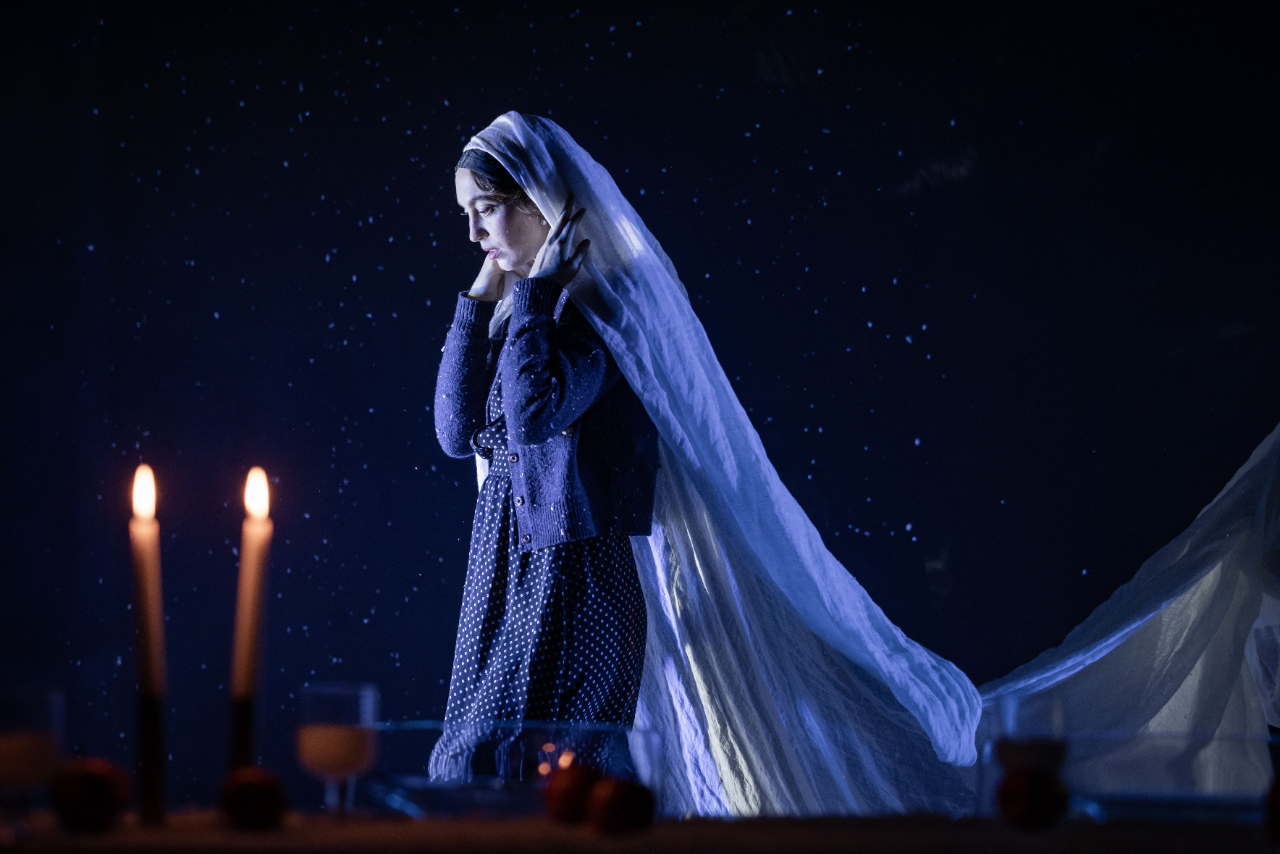 Set designer Jan Pappelbaum creates a dark and minimalist stage, where snow and a white sheet represent many things. Sometimes it’s a dinner tablecloth; at other times, a wedding veil. The snow itself symbolises hope and tragedy throughout the play.