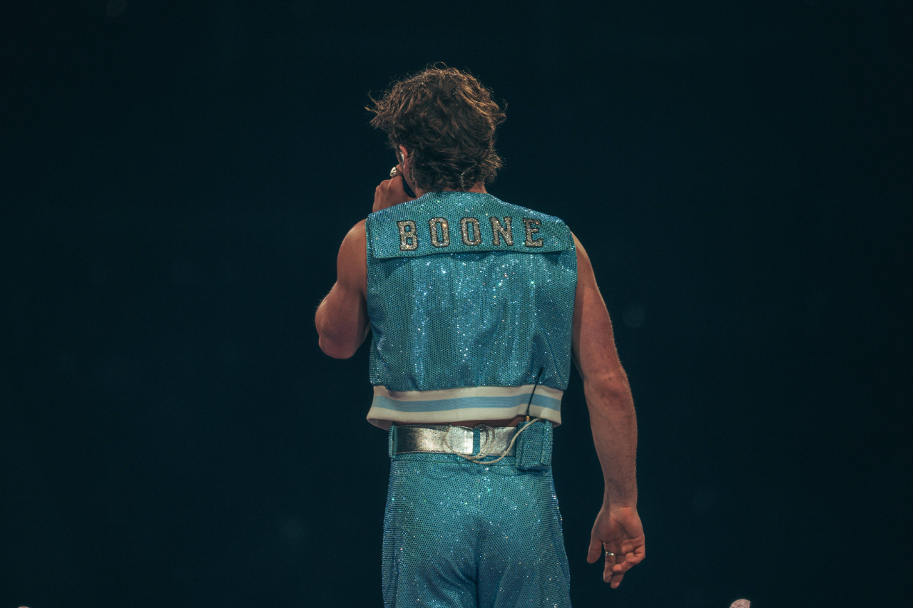 Gliding back and forth along the walkway, Boone commands the space, holding the room’s attention with every movement, and when he steps up to the piano to perform the crowd favourite Slow It Down, they echo every line in unison, torches twinkling across the floor and up to the nosebleed seats.