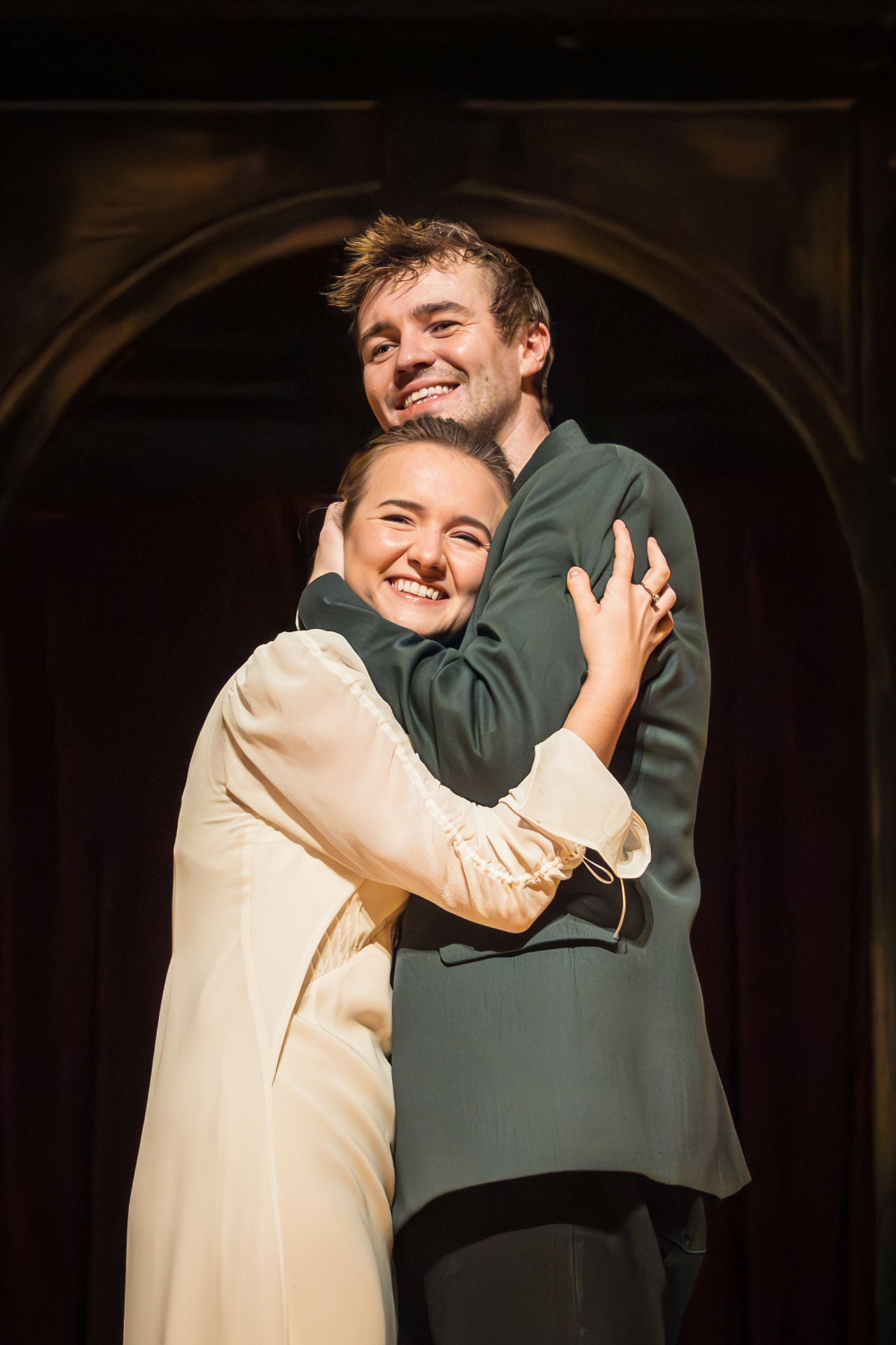 The chemistry between Isabella Colby Browne’s Juliet and Steffan Cennydd’s Romeo is palpable and believable. Their performances bring a playful edge to the love story: Juliet is resolute, witty, and at times pedantic, while Romeo is suave yet impulsive. They behave as young lovers often do: yearning, consumed by passion, and blind to everything beyond each other. This production does a great job of conveying that all-encompassing young love, taking it seriously – and serious it is – while also showcasing its acerbic quality.
