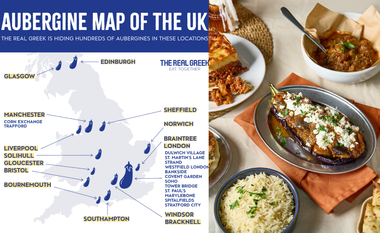 UK-based restaurant chain The Real Greek will be launching a nationwide scavenger hunt from 19th to 25th November to mark the introduction of their updated winter menu. The event, which involves hiding hundreds of aubergines across the country, will take place within a half-mile radius of each of the chain’s 28 restaurants, including locations in London, Liverpool, Brighton and Birmingham. Participants who find a tagged aubergine can exchange it at a nearby restaurant for a complimentary Smoky Aubergine Grill Plate, valid for dine-in customers only during the campaign period. One specially tagged golden aubergine will also be hidden, with the person who finds it winning a free dish every week for life.