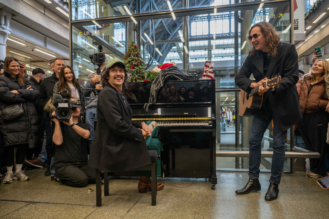 Frontman Justin Hawkins and guitarist Dan Hawkins took to the station’s famous public piano, treating an unsuspecting lunchtime crowd to festive favourites and hits from their back catalogue. The set included a rendition of Christmas Time (Don’t Let the Bells End), Cliff Richard’s Mistletoe and Wine, and classics such as I Believe in a Thing Called Love and Friday Night, drawing cheers and sing-alongs from delighted passersby.