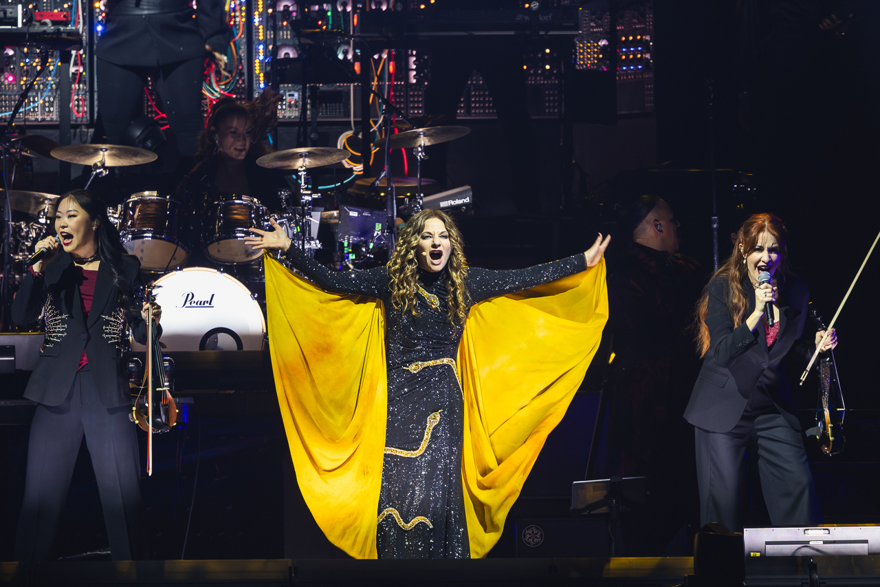 Cellist Mariko Muranaka descends from above in a vast red gown, surrounded by a candlelit choir for a piece from Hannibal before playing Chevaliers de Sangreal from The Da Vinci Code – one of the night’s most theatrical moments.