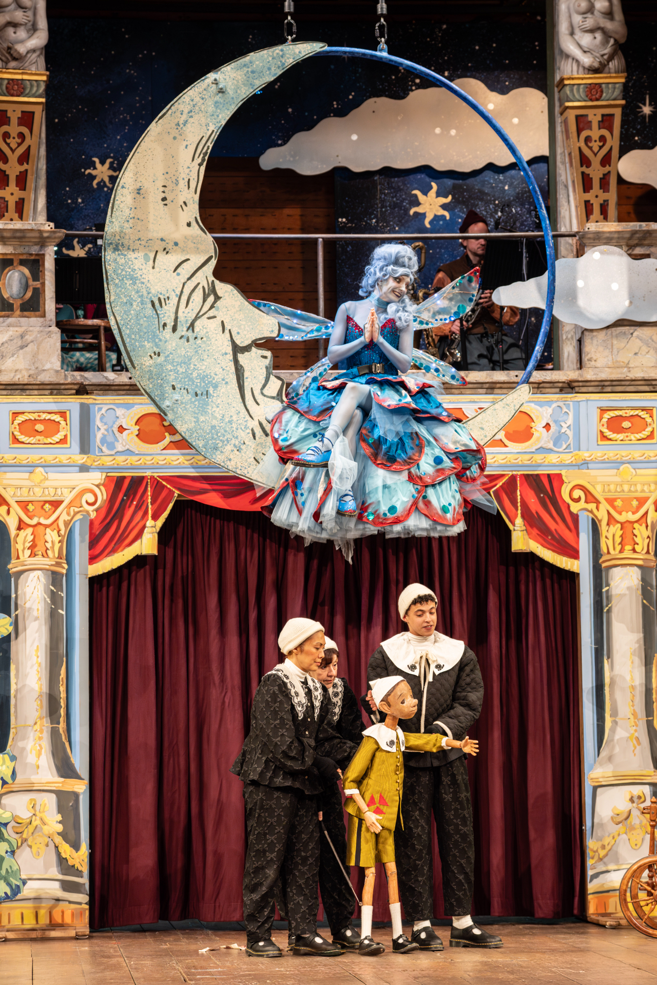 While designer Grace Smart’s baroque-rococo aesthetic, Victorian toy-theatre layered set, and Megan Rarity’s commedia dell’arte costumes appear to tease a conventional production, Pinocchio is a thoroughly modern rendering that combines irreverence with unabashed heart. The titular star feels very appropriate for today’s audience: a magic puppet with attention-deficit disorder that drives his insatiable curiosity. Sublime puppeteering from Braithwaite, Stan Middleton, Aya Nakamura and Andrea Sadler not only create life-like movements but also embody his loud, impulsive nature. He’s an eye-trap for the children, and sufficiently noisy and domineering at times to keep them fully engaged.