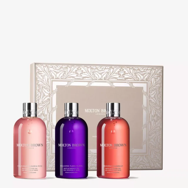Molton Brown’s elegant floral trio offers a sensorial journey through some of the brand’s most beloved scents. Featuring Delicious Rhubarb & Rose, Relaxing Ylang-Ylang and Heavenly Gingerlily body washes, this refined set brings uplifting, calming and exotic notes together for a luxurious daily ritual.