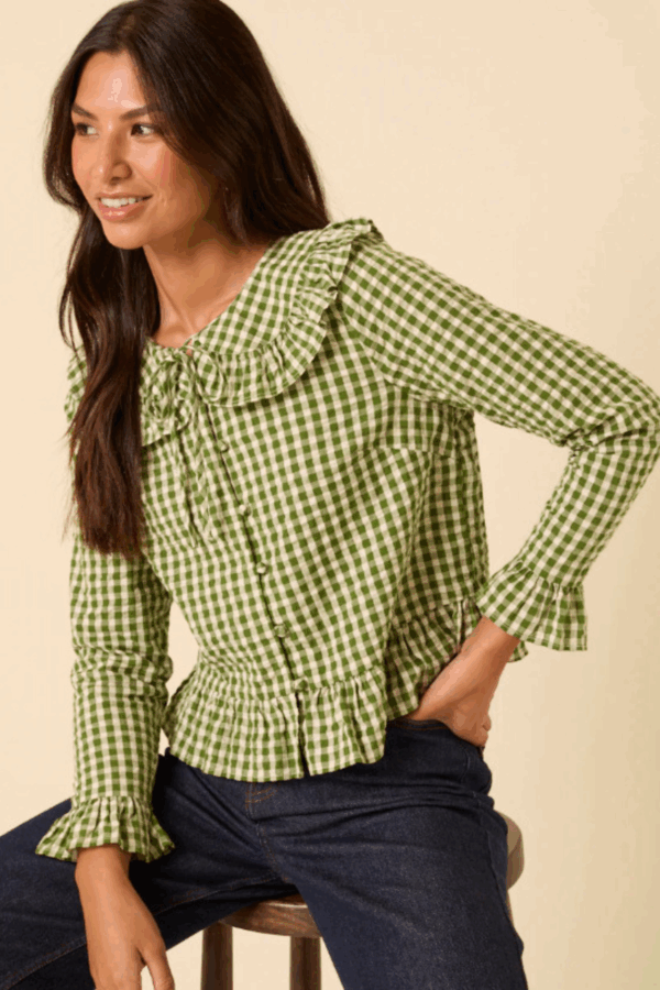Green gingham ruffle blouse, £33, Nobody’s Child