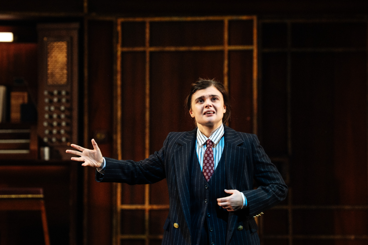 The first thing one may note is the absence of the aforementioned colour, in favour of the monochromatic, even severe pallor of James Cotterill’s set and costume design, with the majority of the cast decked out in the rigid formality of suits and ties. Such presentation may no doubt befit the station in which shipwrecked Viola (Gwyneth Keyworth) finds herself, adopting the guise of page boy Cesario to do the bidding of foolish, lovelorn Duke Orsino (Daniel Monks). What can be accounted for with less clarity is the sombre hush that hangs over Prasanna Puwanarajah’s production. As Feste – an alternatingly clownish and ghostly presence throughout – haunts the play’s fringes, singing his sad songs, one is left in little doubt that an exactingly specific aesthetic vision has been well and fully realised, with performers who never falter throughout. Still, one is often compelled to ask, not least in the especially stiff-backed first act of the new Twelfth Night, “To what purpose?”