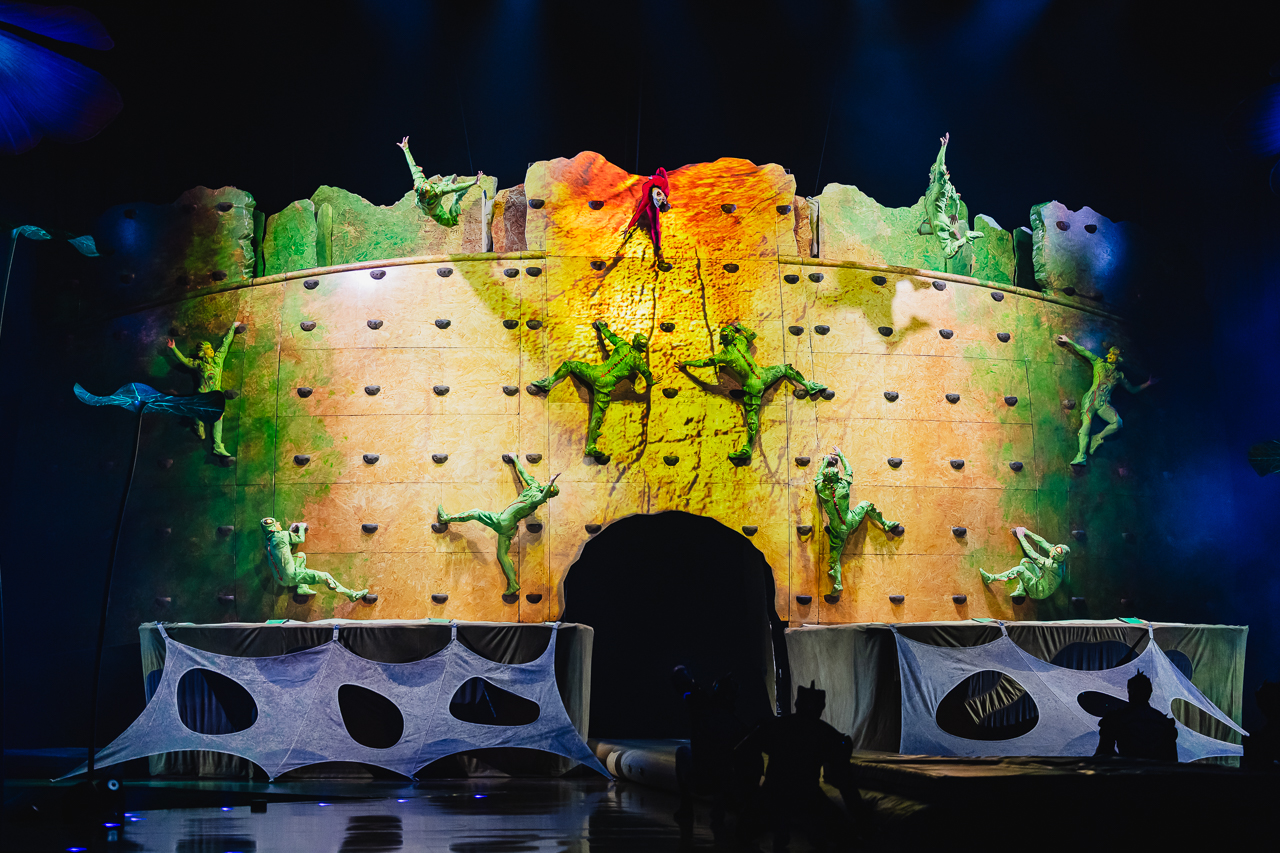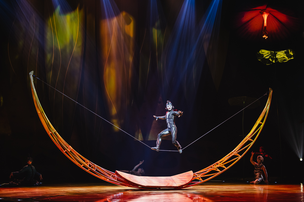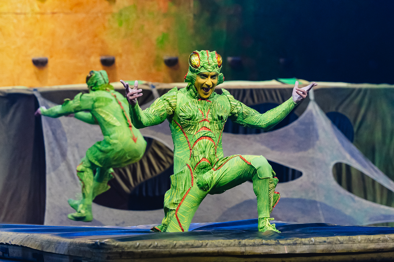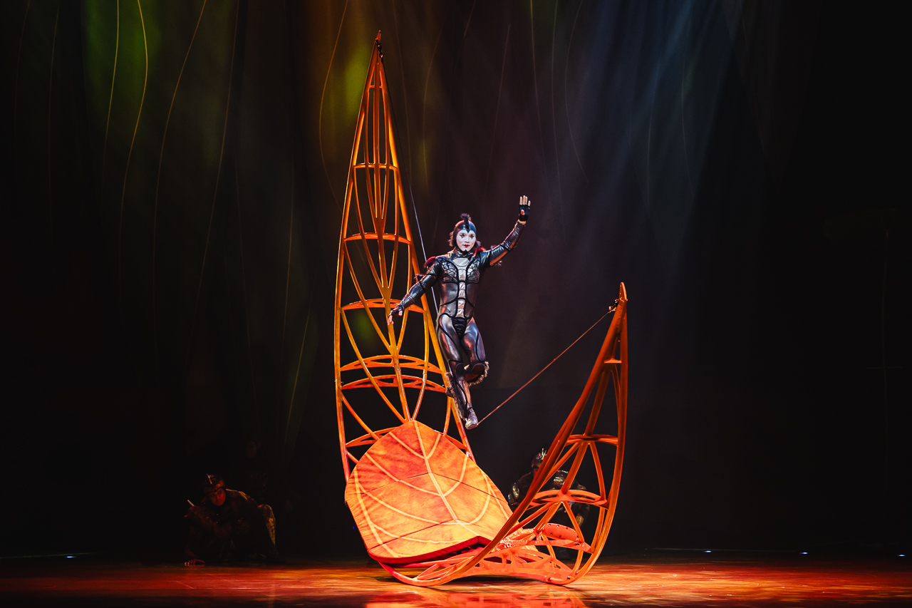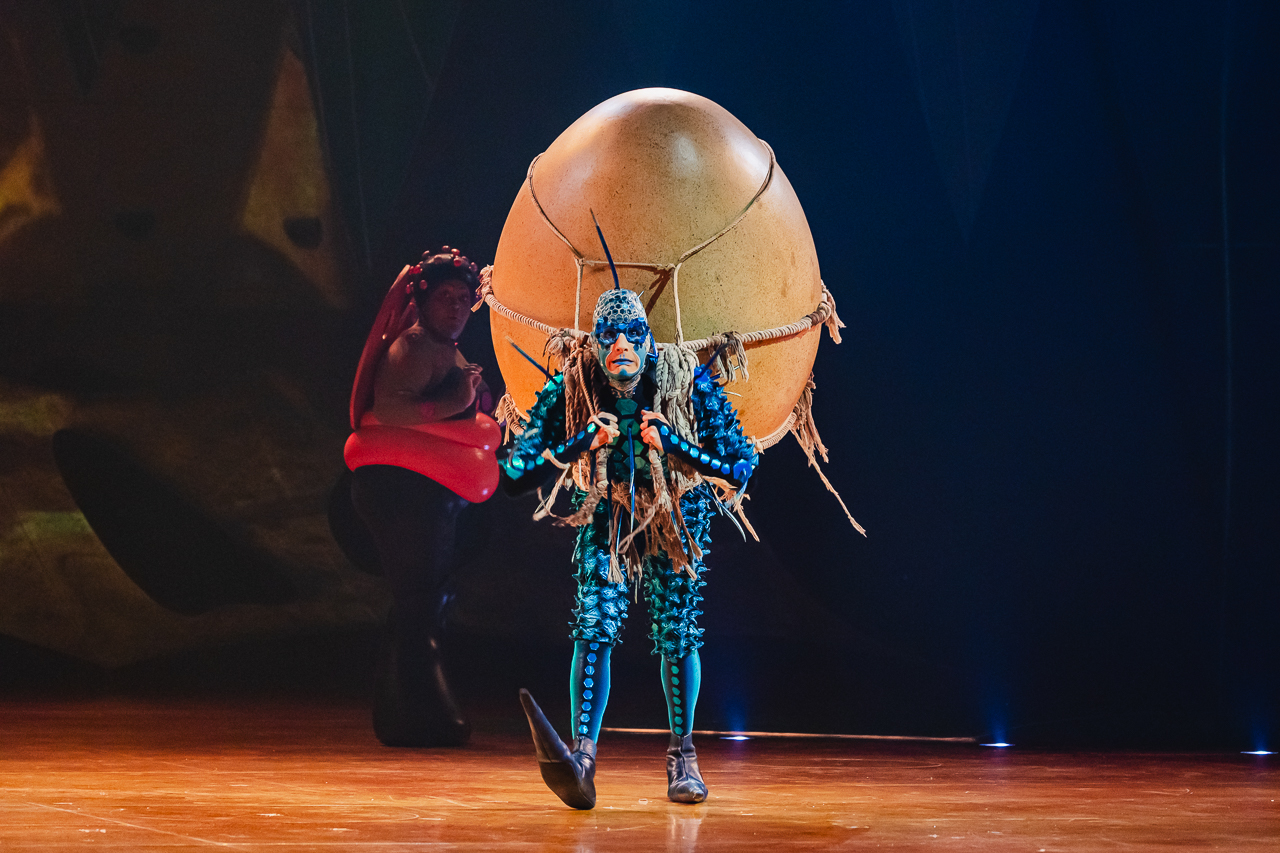 Ovo is essentially a collection of impressive individual circus performances from slackwire to aerial cradle, tied together with a loose but satisfying narrative thread. A strange egg appears to the insects, and their world buzzes with curiosity and excitement. In between the larger acts, three clowns – a beetle, a fly and a ladybird – entertain with gibberish talk and slapstick humour.