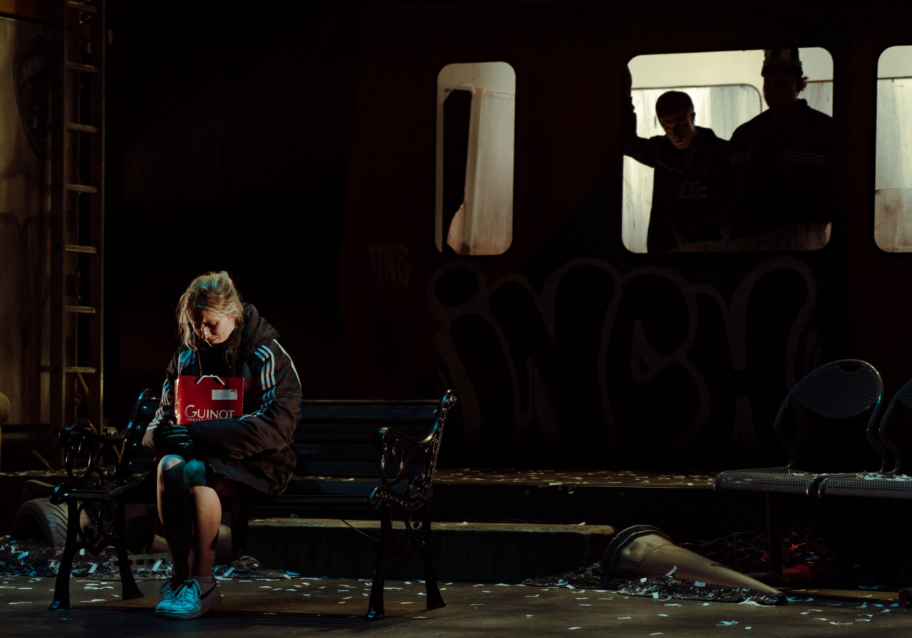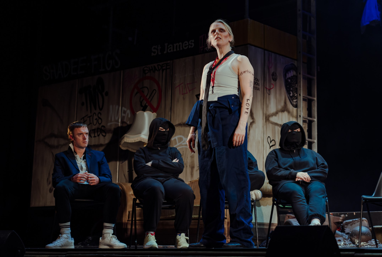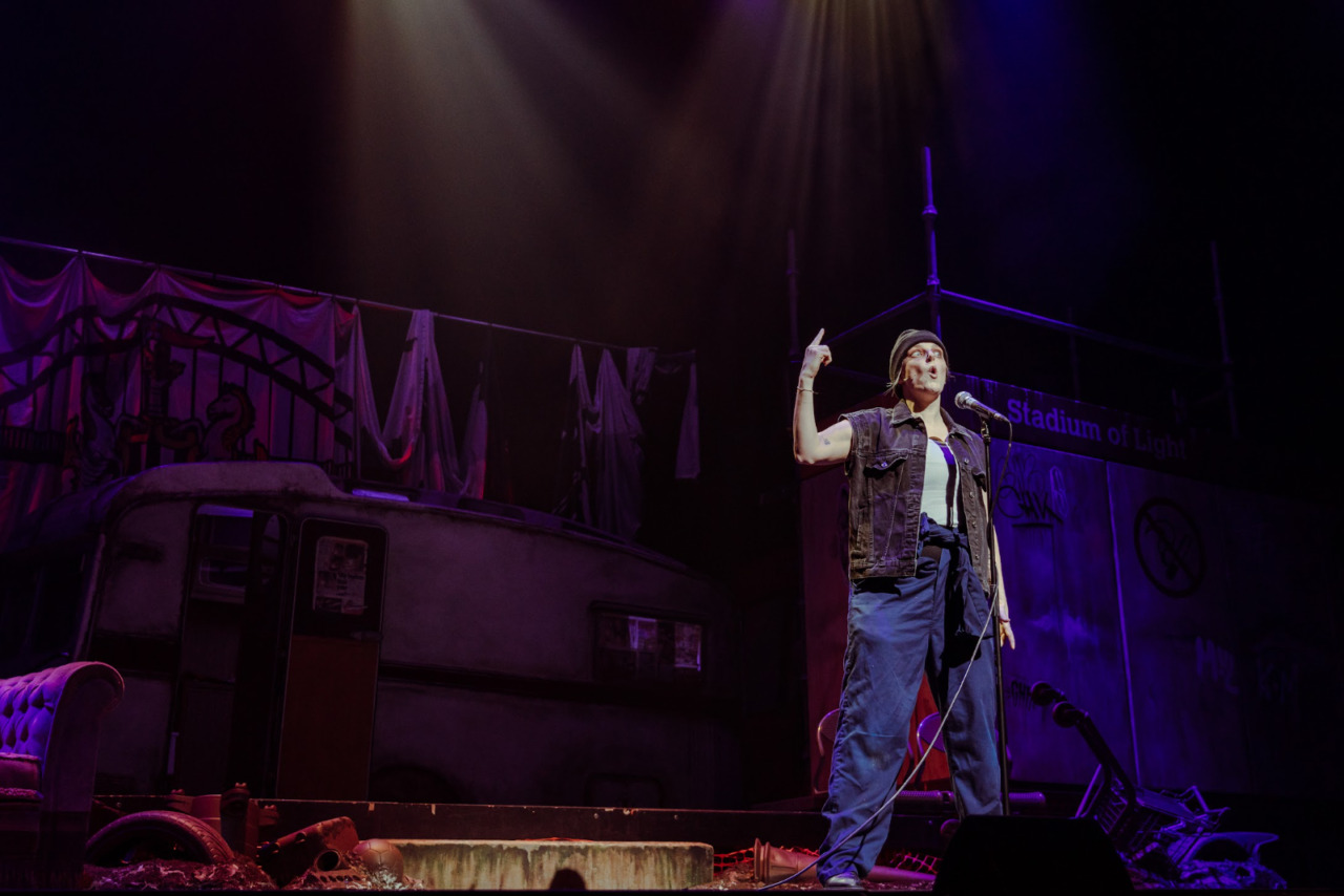 Unfortunately, however, the most prominent takeaway from Gerry & Sewell’s arrival in the West End is that it has not travelled well. While the cast remains largely the same – a particular mention for Becky Clayburn’s portrayal of Brebin, the nebulous man of the streets/haunting poet/vague nemesis to the show’s protagonist pair – there was a troublingly unpolished quality to this production’s delivery. Sound design and balance issues were a pervasive threat, and there was an apparent unfamiliarity on behalf of the company with the amended stage design. Gerry & Sewell in London may make for an uneasy spectacle, but it is a raucous comic riot nevertheless.