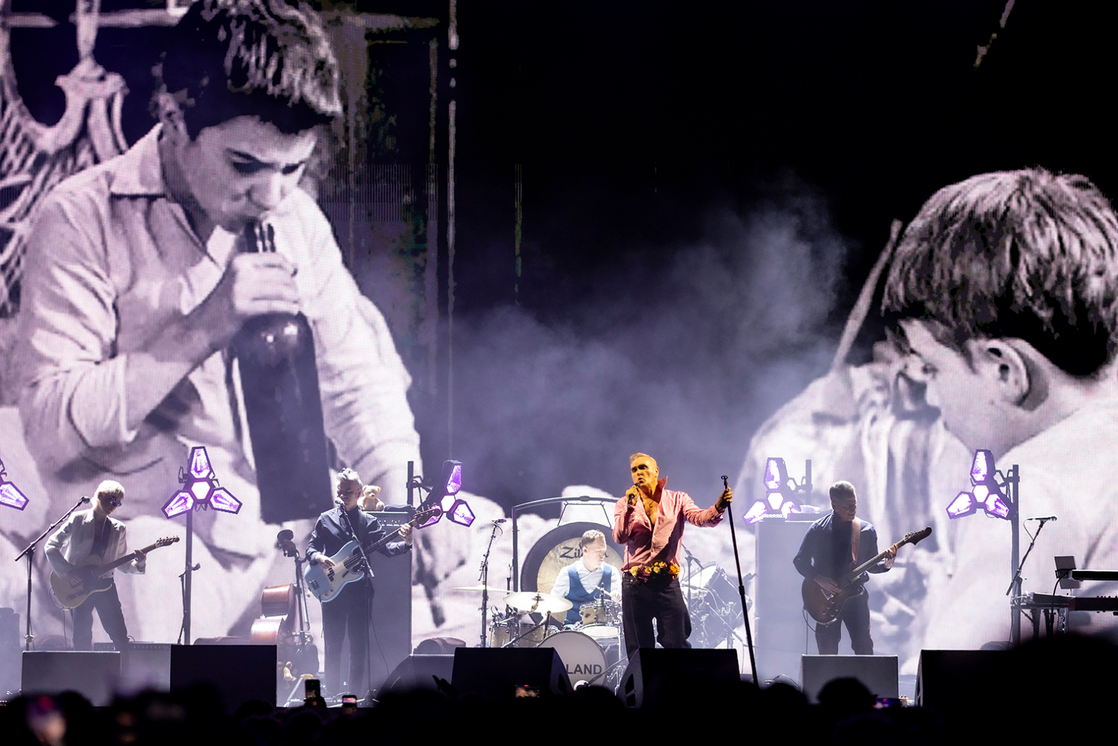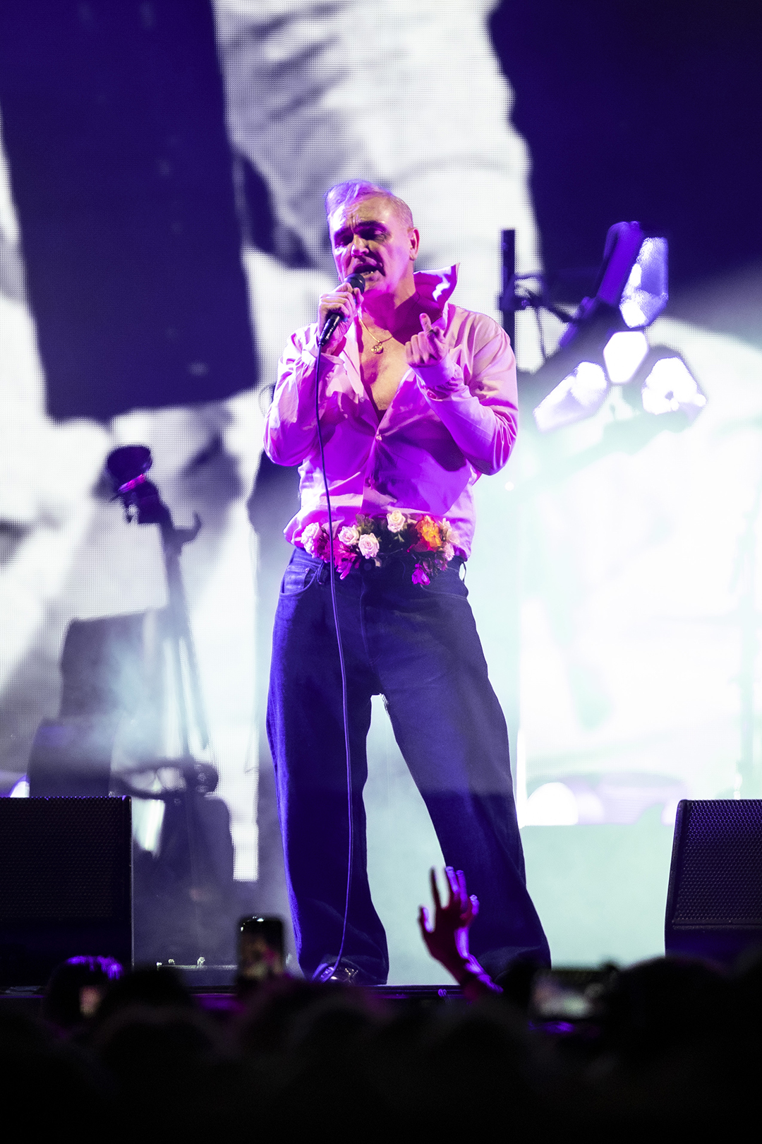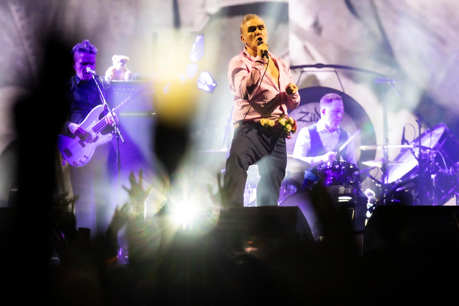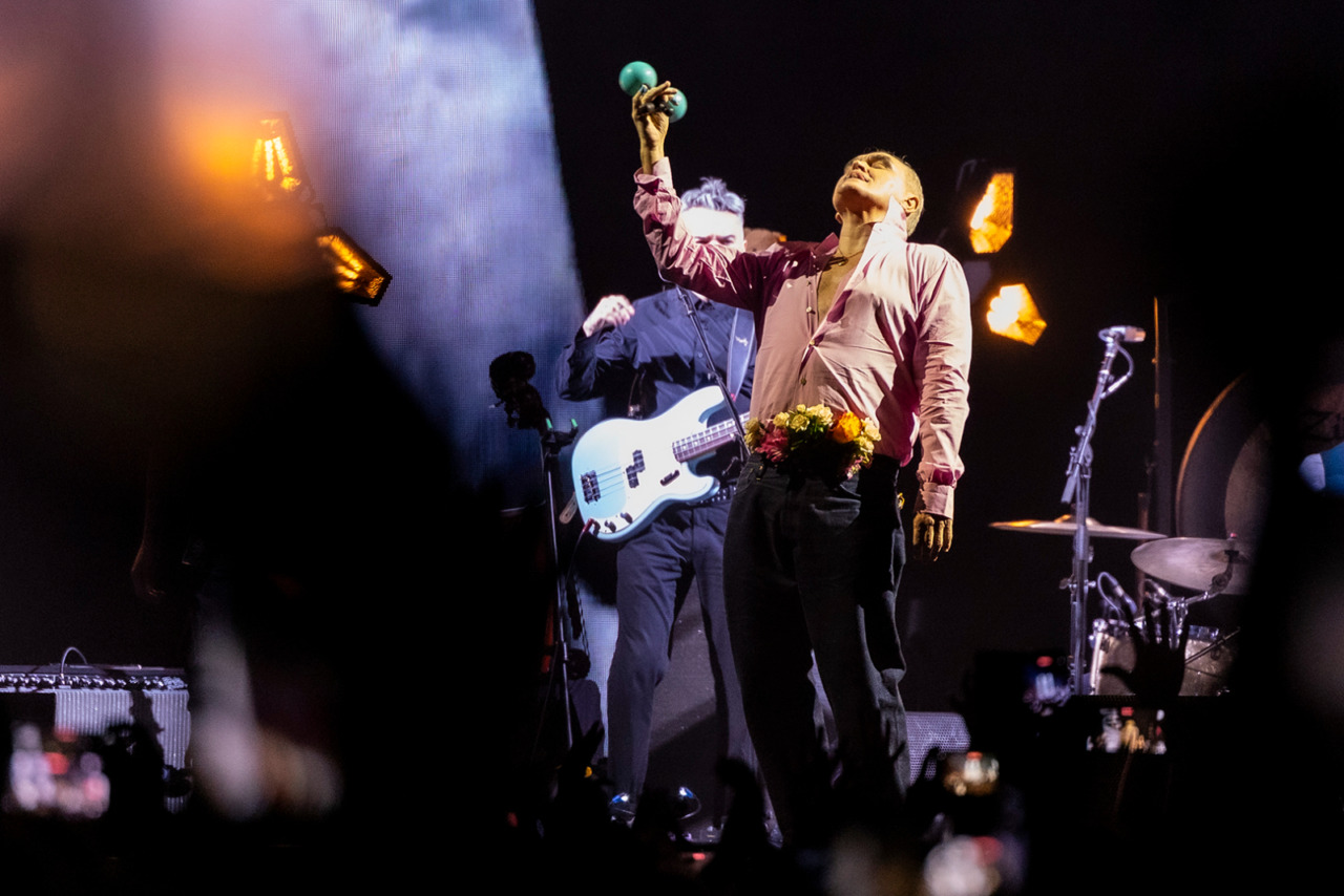 Arrive he does, and the night begins with Morrissey shaking some maracas for Billy Budd, which the crowd approves of as the opening number. He tosses them backwards with a flourish at the song’s end and declares, “Thank you! I grow older, but I will never die!” as his band launches into I Just Want to See the Boy Happy.