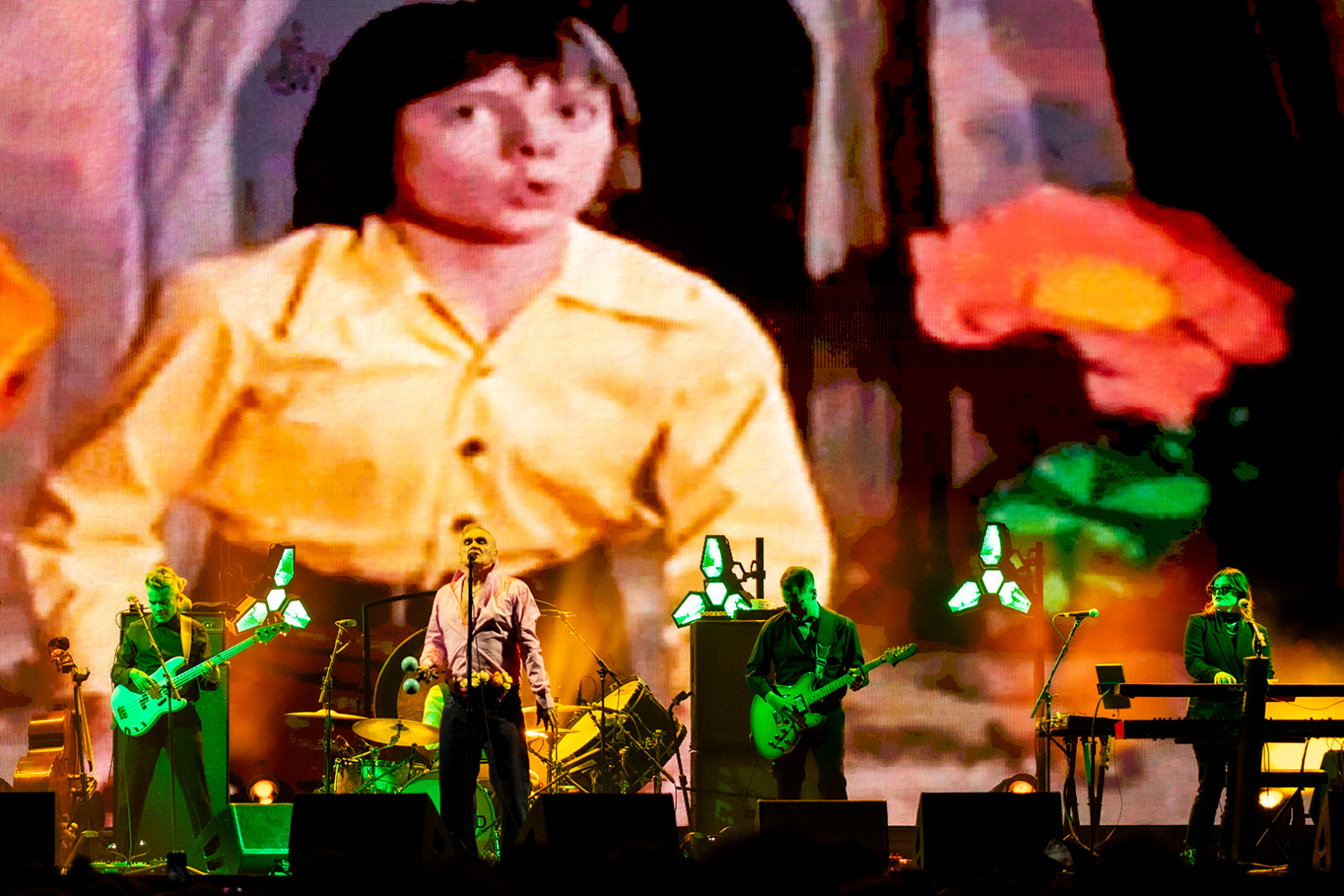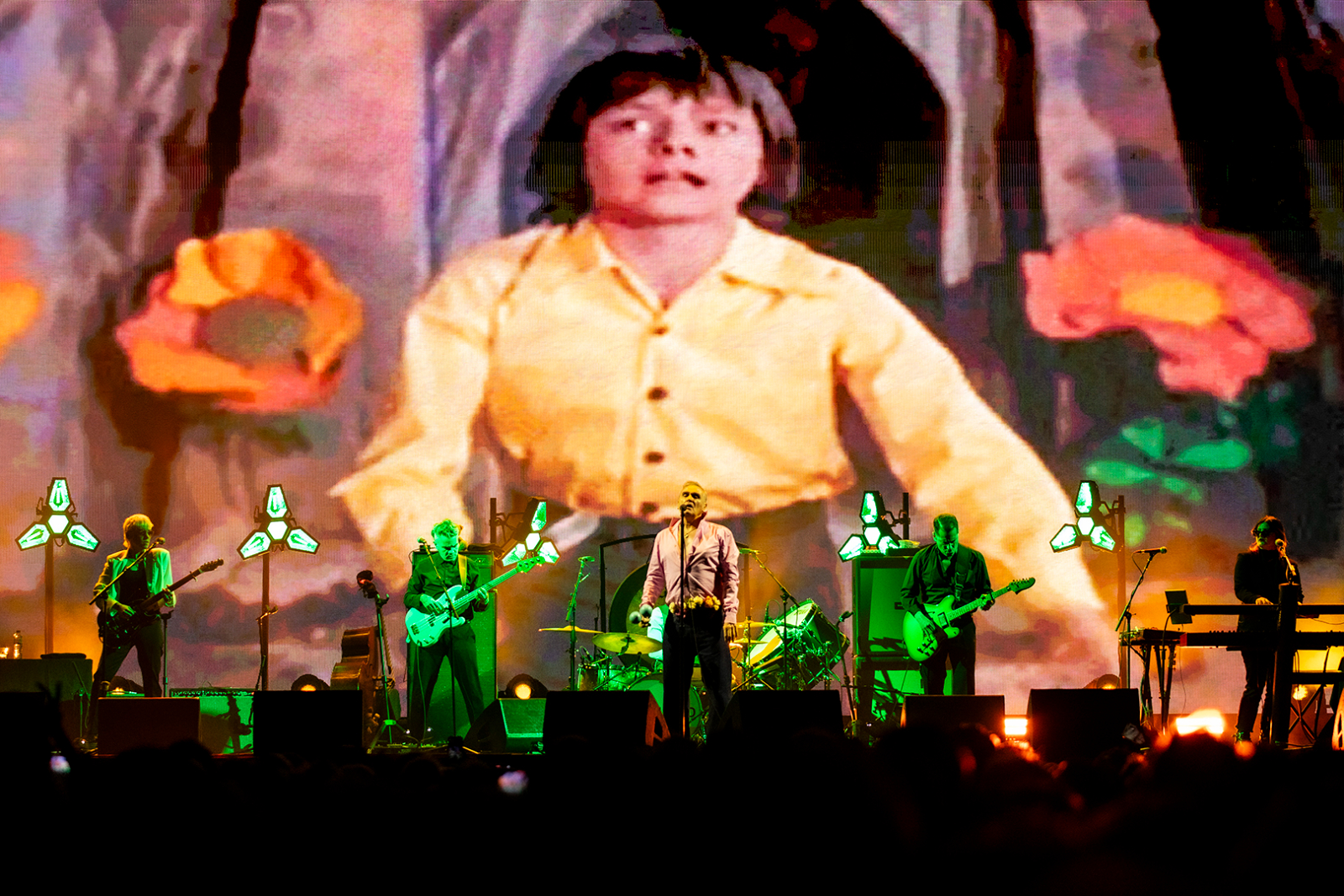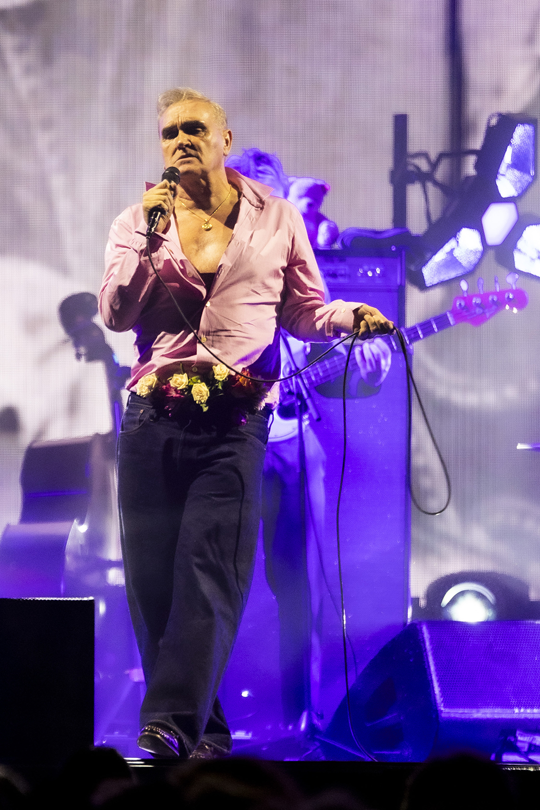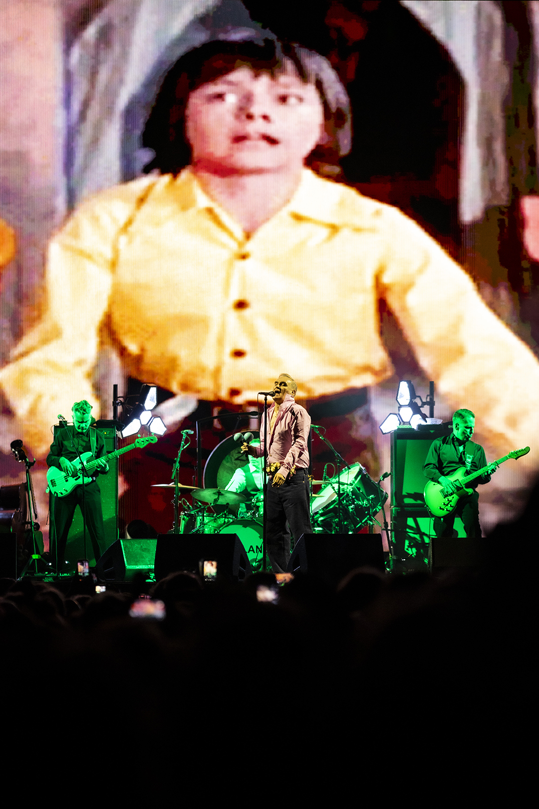 Arrive he does, and the night begins with Morrissey shaking some maracas for Billy Budd, which the crowd approves of as the opening number. He tosses them backwards with a flourish at the song’s end and declares, “Thank you! I grow older, but I will never die!” as his band launches into I Just Want to See the Boy Happy.