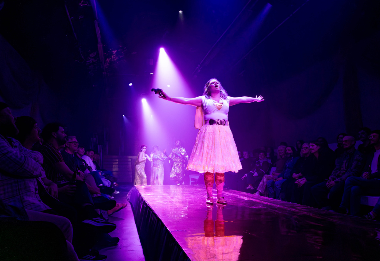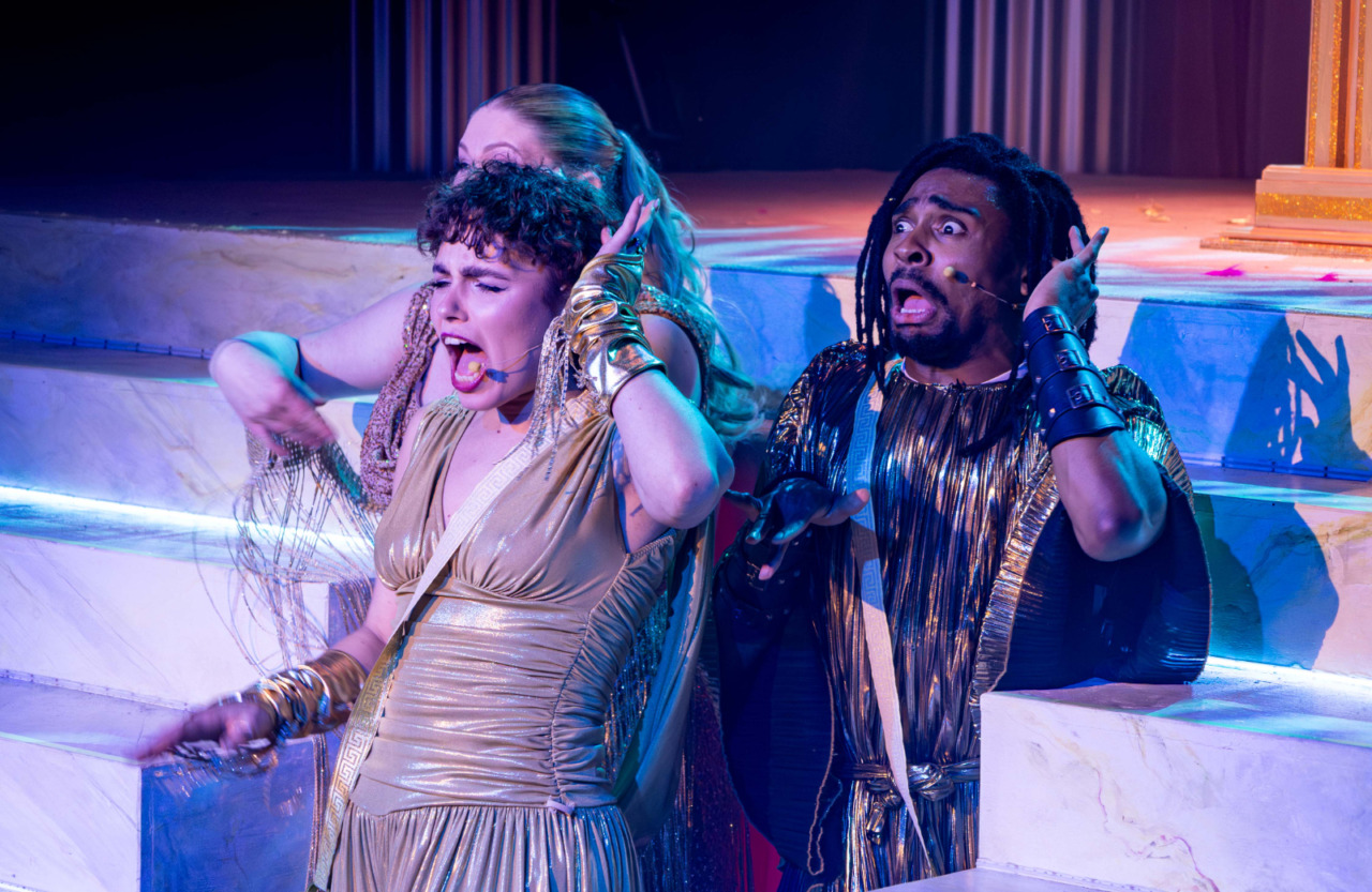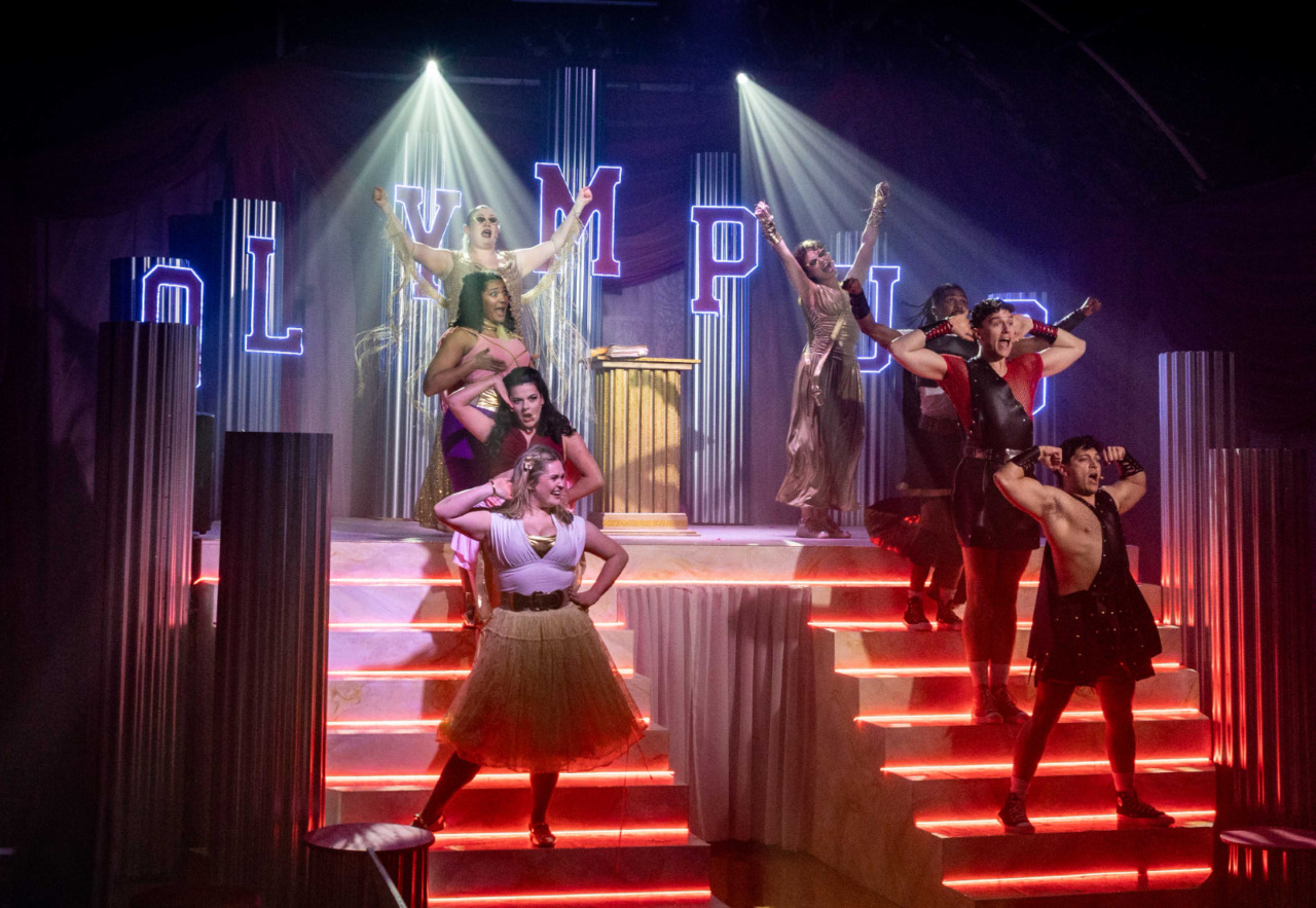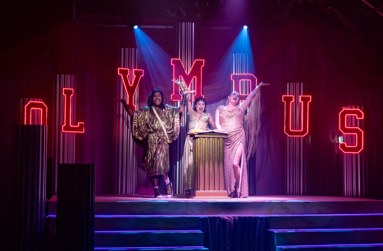 From disco nymphs, leather-bound satyrs, and slow-motion lightning bolts, Lucinda Lawrence’s choreography crackles with heat and humour. Isabella Van Braeckel’s set merges temple and nightclub: marble columns meet mirrorballs, while Clancy Flynn’s lighting washes the space in purples and golds that make the air seem perfumed with ambrosia. It’s as though the centuries have become one, and yet it all seems to make perfect sense. Music supervisor Olivia Zacharia crafts a pulsating soundtrack of original numbers and mythic remixes that push the parody into its own gleaming world.