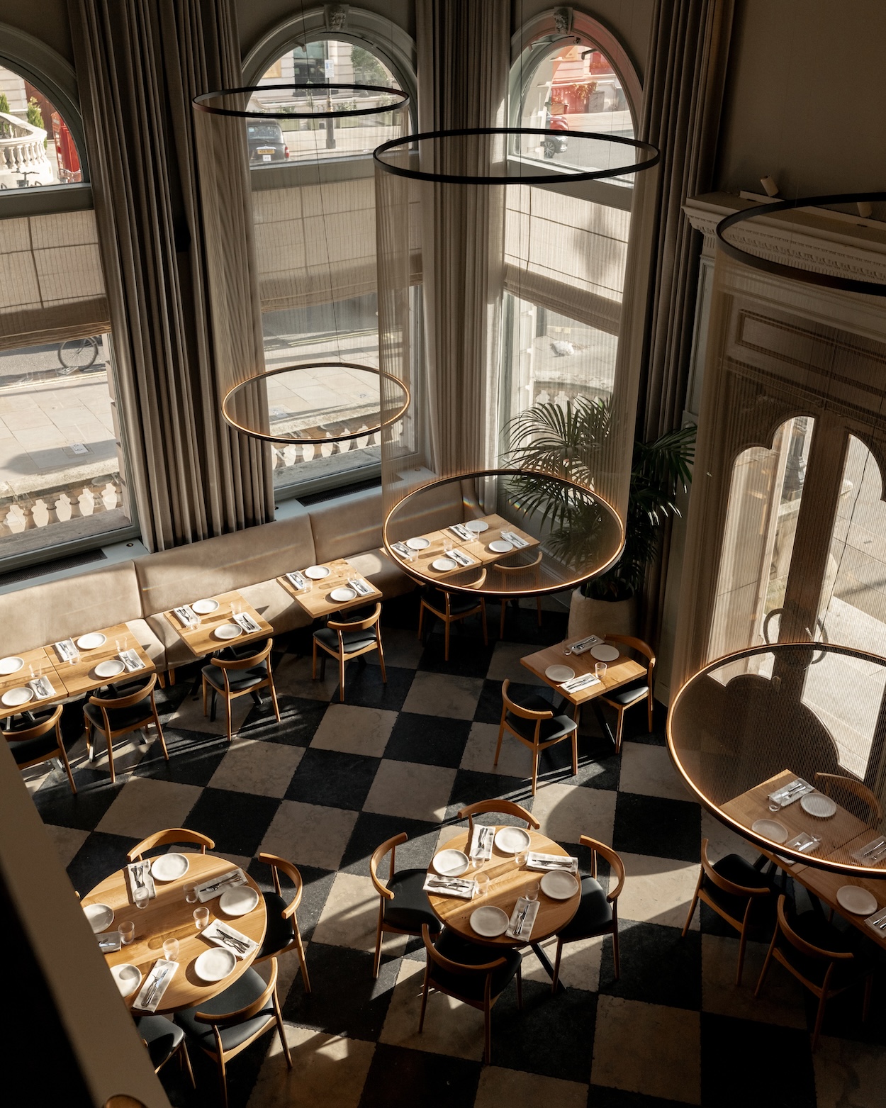 The Grade II-listed site, a former bank, lends itself well to the evocative, echoing space designed by DLSM Studio: high ceilings, sturdy window frames and huge walls defining squared-off areas. There’s a grand display of colourful flowers at the entrance, dark wood panelling in the bar area, banquette sofas in the centre of the room, and a brick-walled corner that softens the tone for a more relaxed setting.