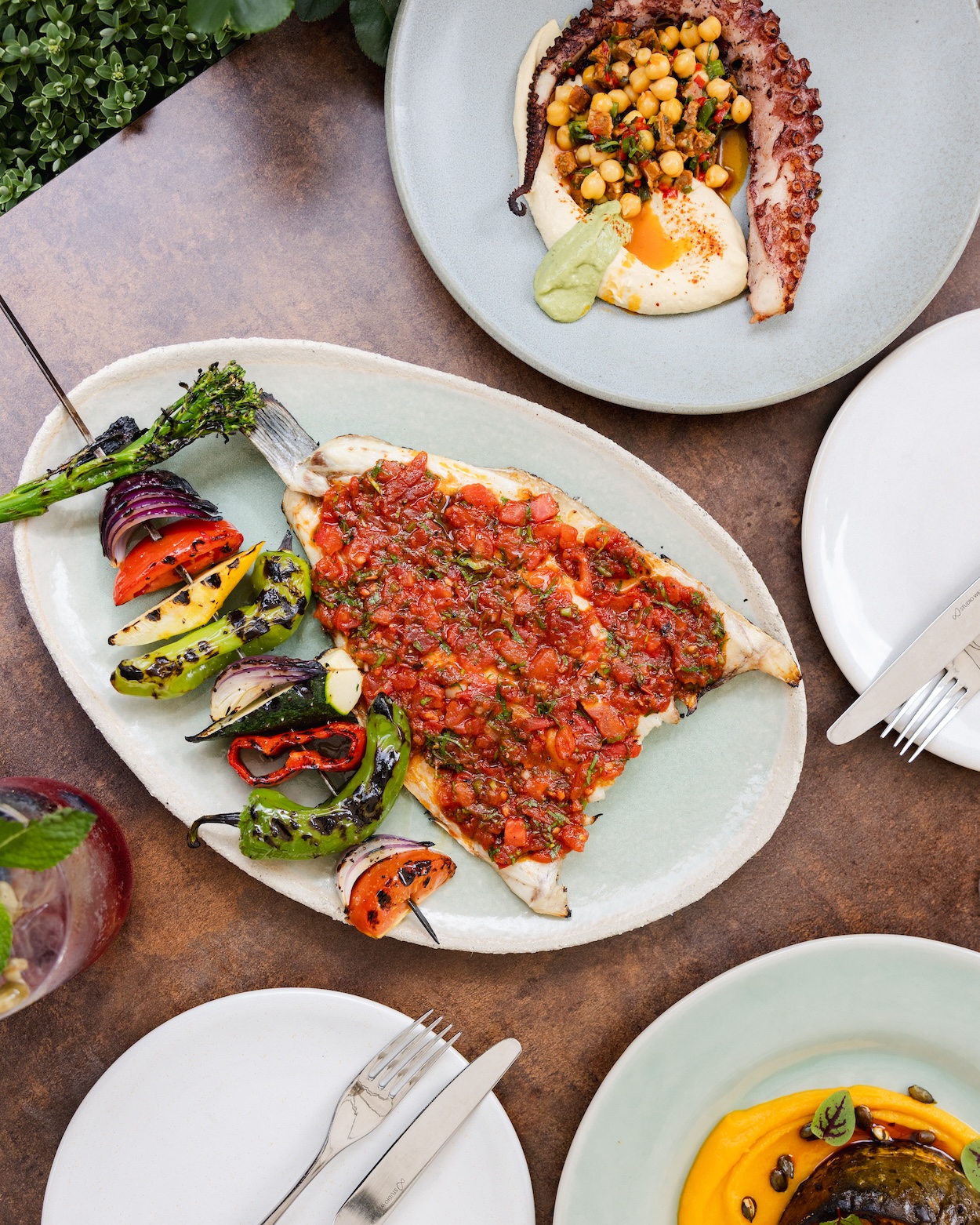 When it comes to the menu, choices are best made by ordering a feast to share. The cuisine is Mediterranean in the broader sense (with North African and Middle Eastern influences) and there is a strong focus on the provenance of the ingredients. During our visit, it’s Berkshire month, so the menu is dotted with specials that celebrate the best produce from the area. We start with cocktails, and the drinks in general (particularly the non-alcoholic options) favour herbs and infusions. From among the specials we opt for the Forest Whisper, prepared with Hawkridge Single Malt Whisky, berry sherbet and lemon (offering a slightly acidic note without being excessive), topped with a foam of vegan egg white.