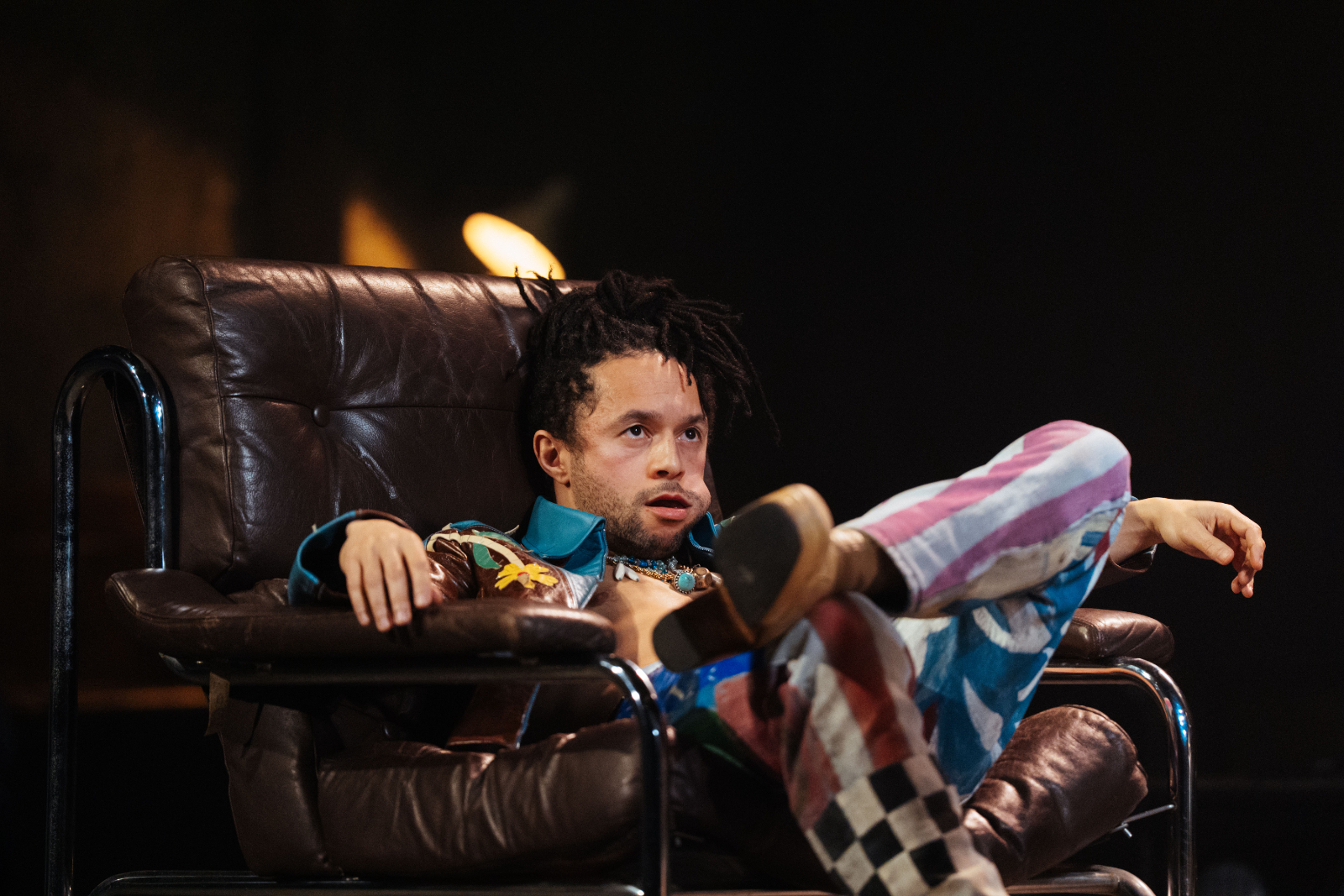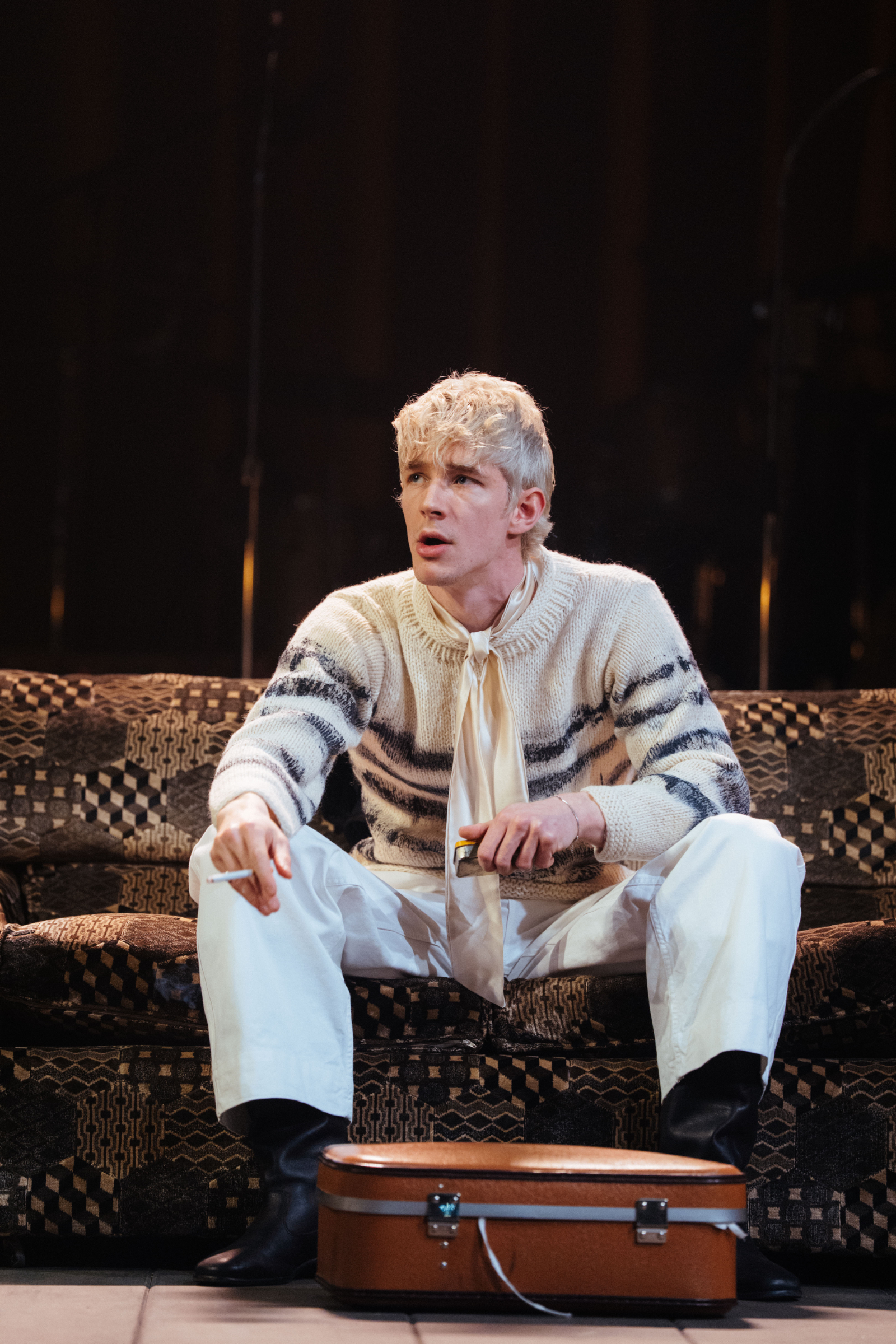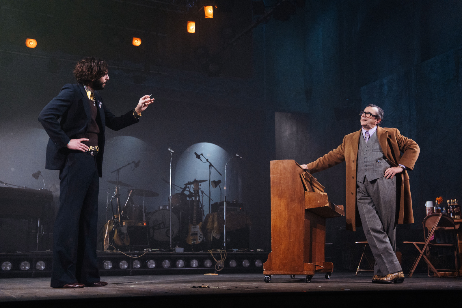 As for Nick and Tony Bicât’s songs, they excellently reflect the band’s conflicting identity as a 60s band looking towards the 70s (but might not get there) – highlights include Don’t Let The Bastards Come Near You and the glorious swansong Last Orders. Raggett’s direction has the cast bolting every which way as mayhem erupts, with the songs performed on a raised platform, and hazy stage lighting and orange lightbulbs adding to this setup of yesteryear. Throw in flames and an actual dog, and the suitably chaotic staging completes the image.