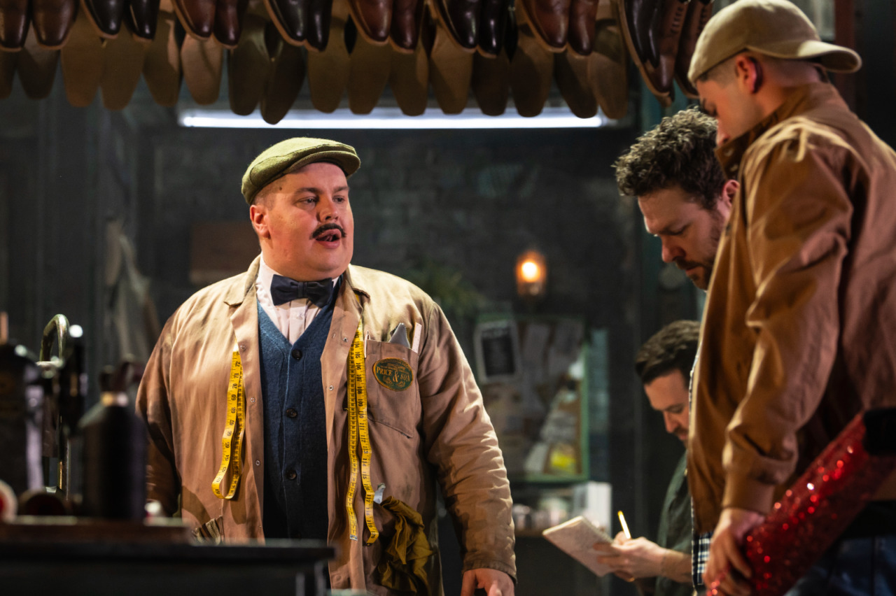 The costume designs by Robert Jones and Tom Rogers are a feast, and no small part of what makes this production special, together with the set design by Robert Jones. Whether it be the all-different hot red dresses of Lola and the Angels, the dazzling black attire of the finale, or the modest suit and aprons at Price & Son, they hit with sass. The leather brogues hanging from the ceiling, the table works smoothly turning into backlit platforms, the scenery inside the factory detailed to the walls and the neon lights framing the dark curtains covering everything up for a scene change: the curation of props and backdrops transports the characters and the audience across rooms, streets, cities.
