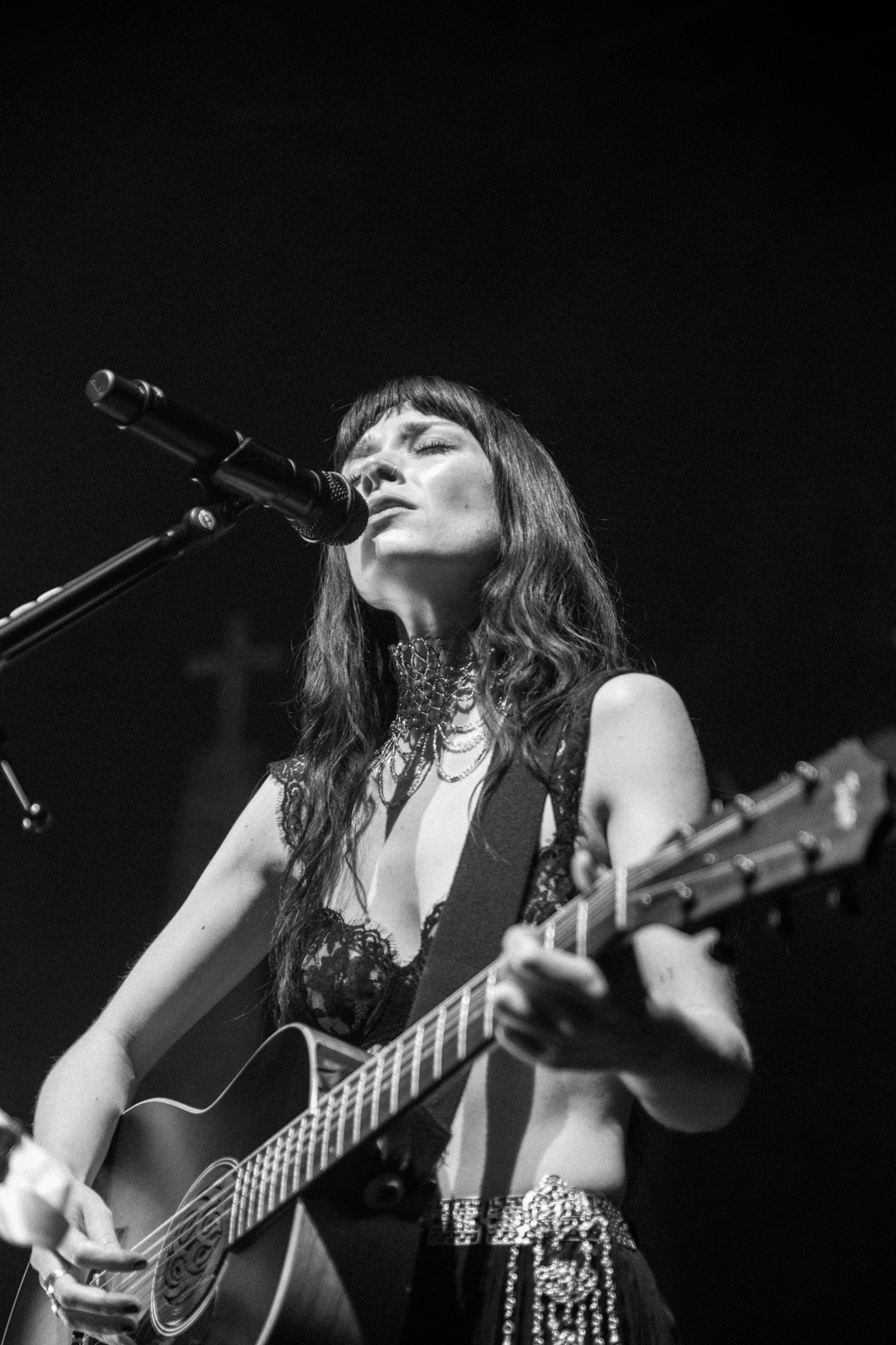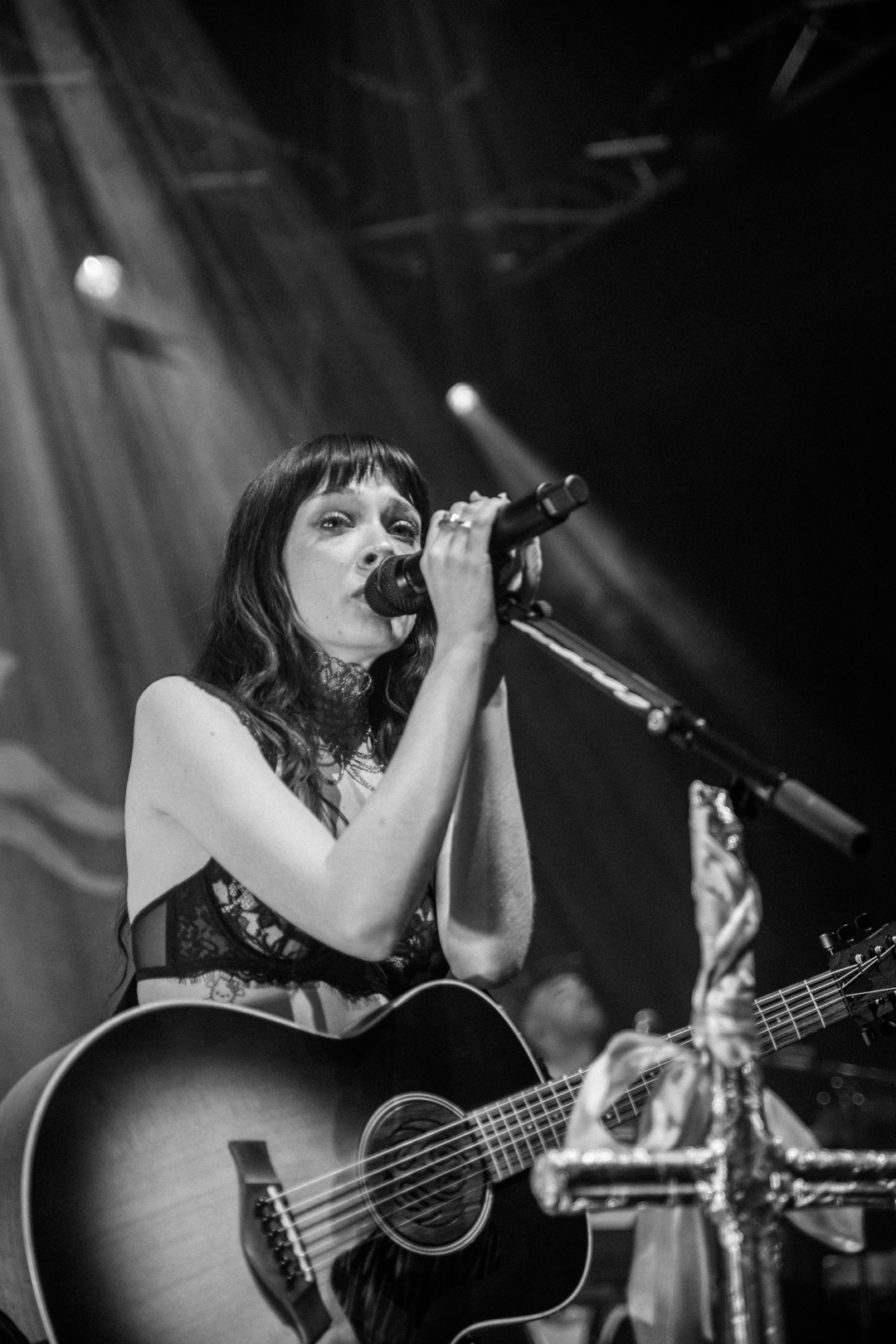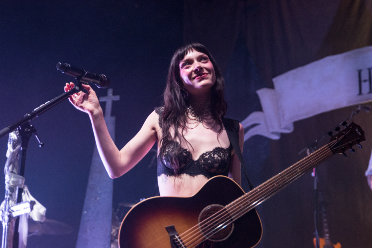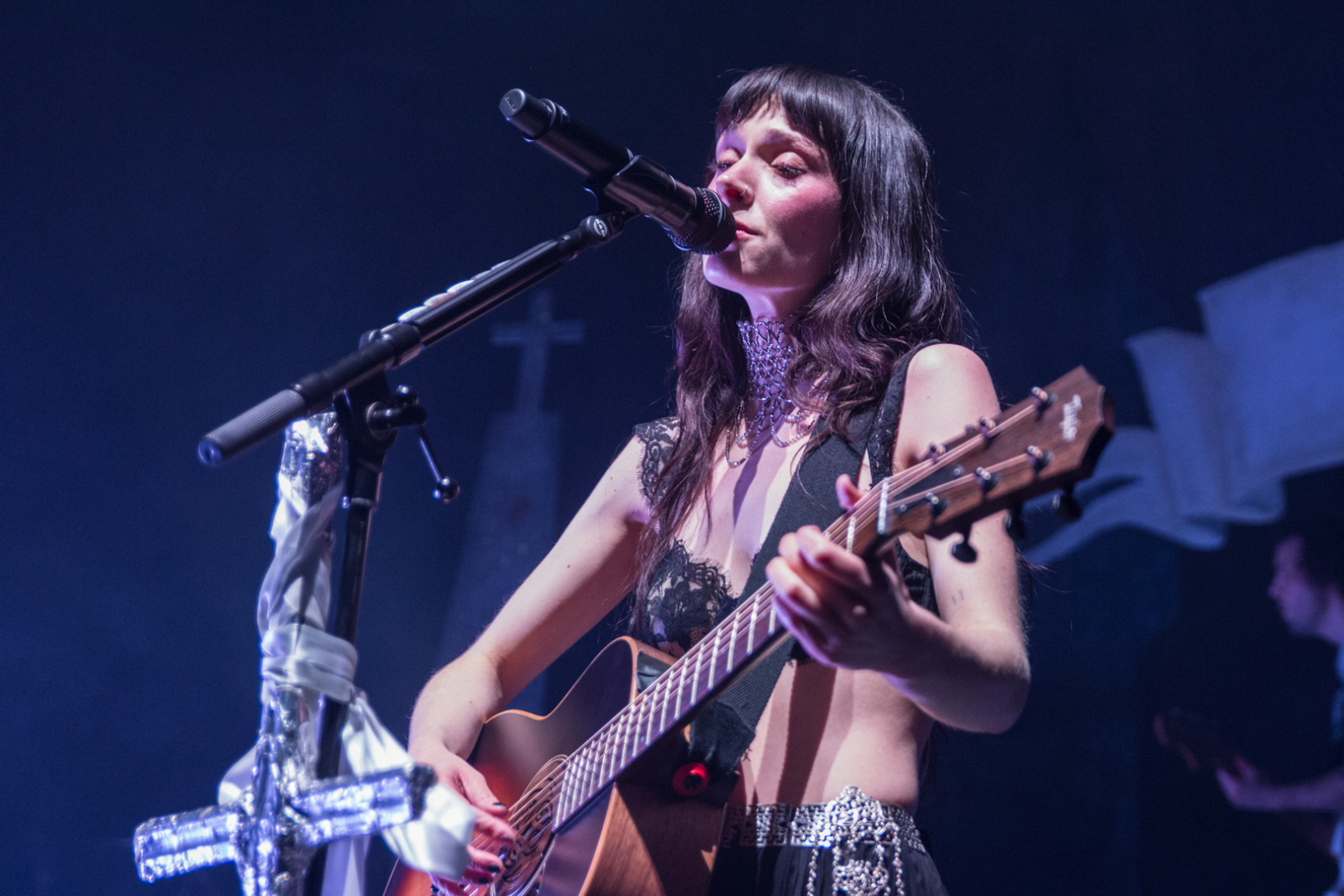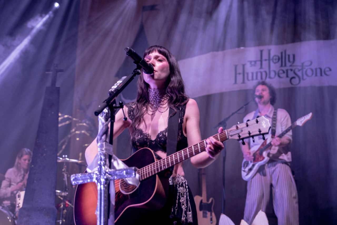 The show opens to the clanging of a clock articulated with white strobe lights. The stage is decked out in her recently adopted medieval-gothic aesthetic, complete with theatrical paper cutouts of cross headstones, barren trees and flowers (as seen in the Cruel World music video). After her three bandmates take to their places, Humberstone steps out nonchalantly in sheer black hareem trousers and a lace bralette to perform one of the opening tracks off the new record, Make It All Better. Rocky drums by Lauren O’Donnell Anderson, shreddy guitar by Jack Louis Rennie and steady bass by Seth Tackaberry seep into every crevice of the building, washing over the warm, intergenerational sea of smiles and sways. Without missing a beat, the band transitions into To Love Somebody, one of the upcoming album’s hooky singles. Lights shine on the audience for the “It always does” call and response section of the song, illuminating groups of friends holding each other as they sing.