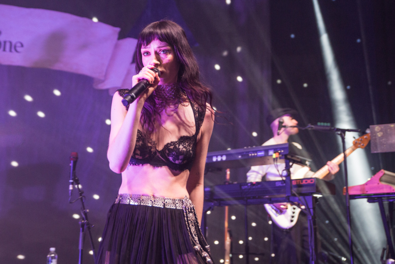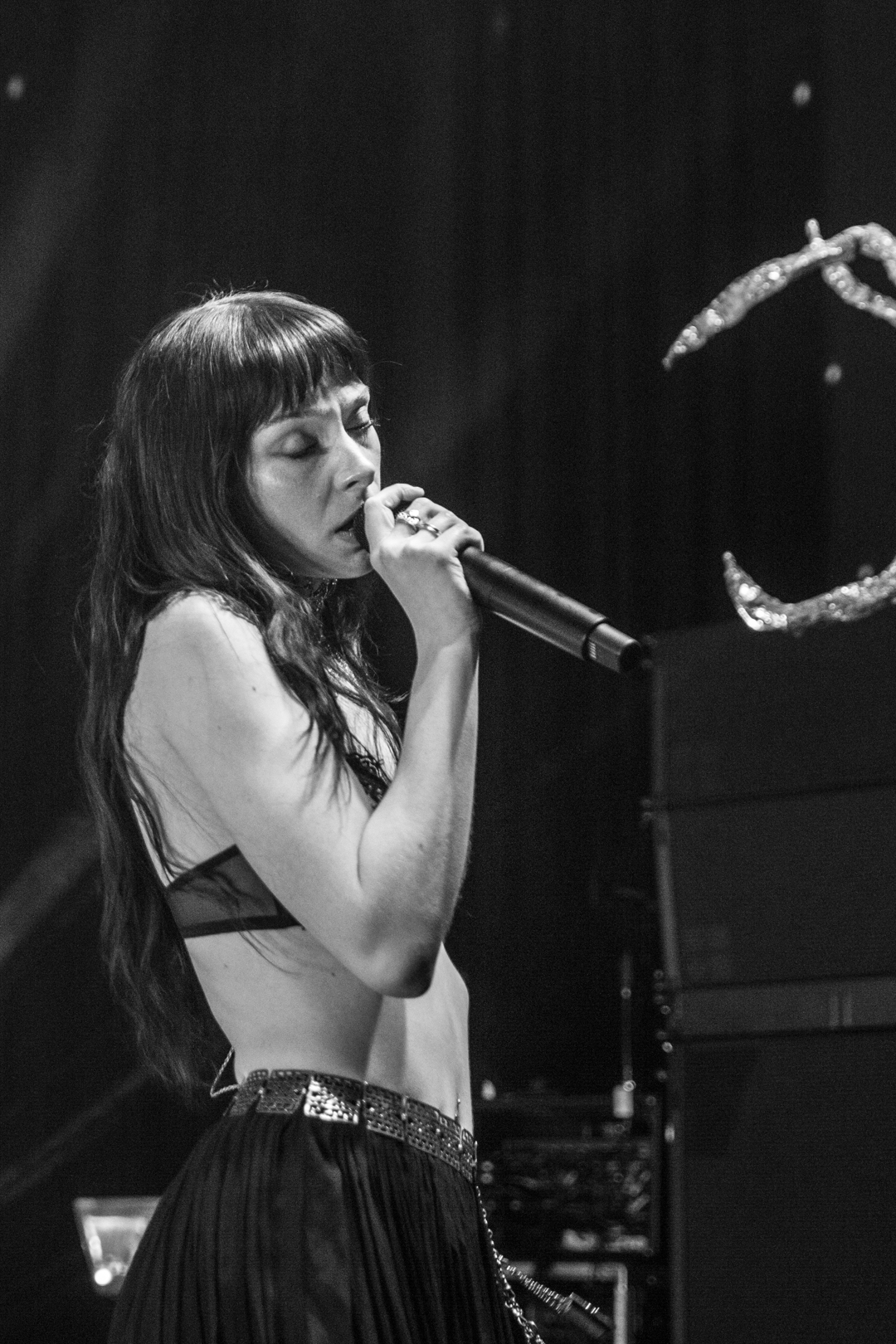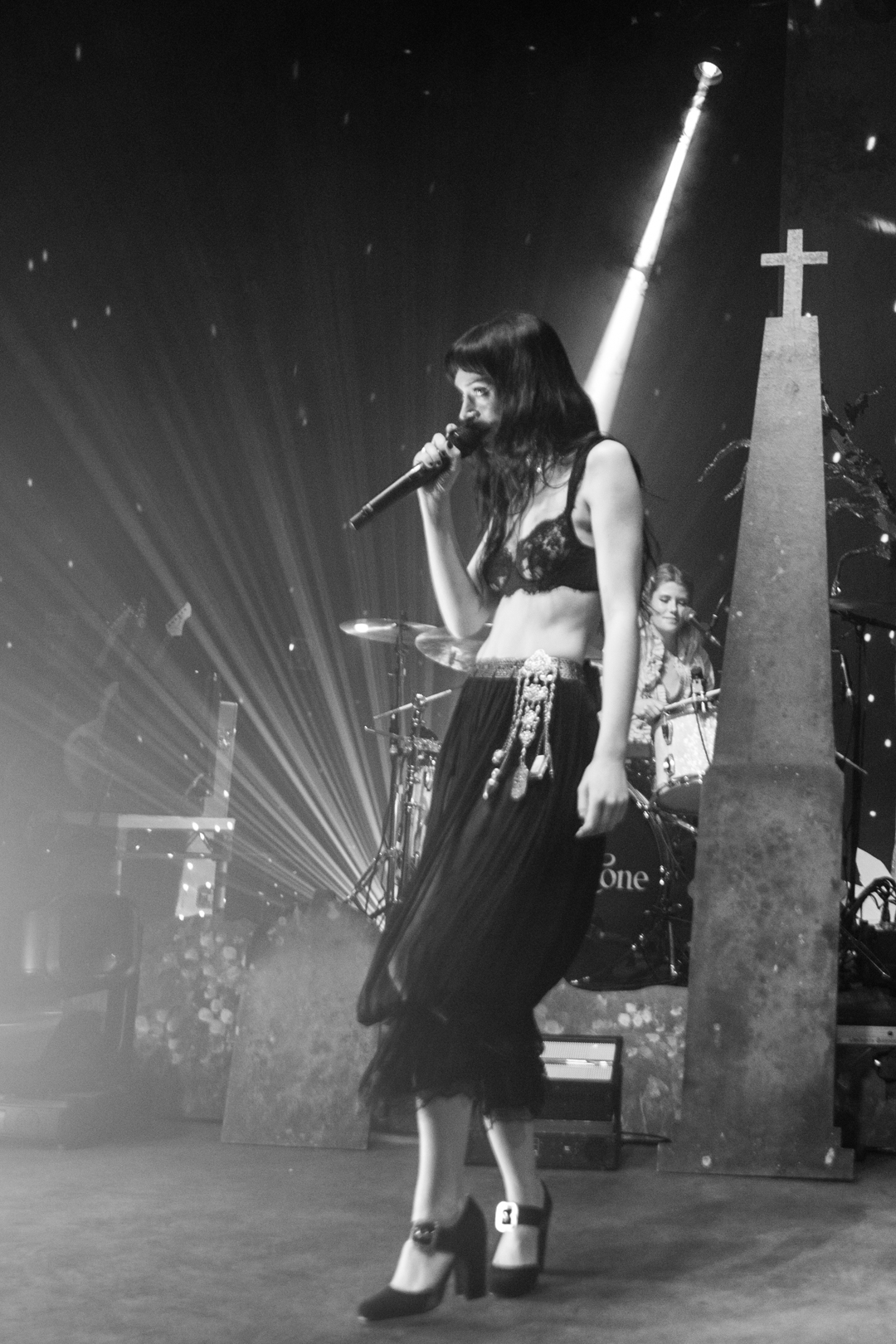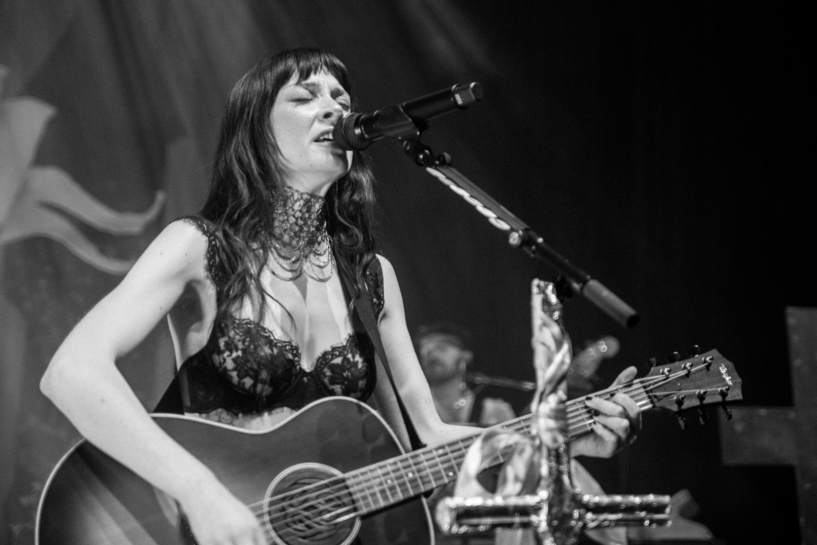 The show opens to the clanging of a clock articulated with white strobe lights. The stage is decked out in her recently adopted medieval-gothic aesthetic, complete with theatrical paper cutouts of cross headstones, barren trees and flowers (as seen in the Cruel World music video). After her three bandmates take to their places, Humberstone steps out nonchalantly in sheer black hareem trousers and a lace bralette to perform one of the opening tracks off the new record, Make It All Better. Rocky drums by Lauren O’Donnell Anderson, shreddy guitar by Jack Louis Rennie and steady bass by Seth Tackaberry seep into every crevice of the building, washing over the warm, intergenerational sea of smiles and sways. Without missing a beat, the band transitions into To Love Somebody, one of the upcoming album’s hooky singles. Lights shine on the audience for the “It always does” call and response section of the song, illuminating groups of friends holding each other as they sing.