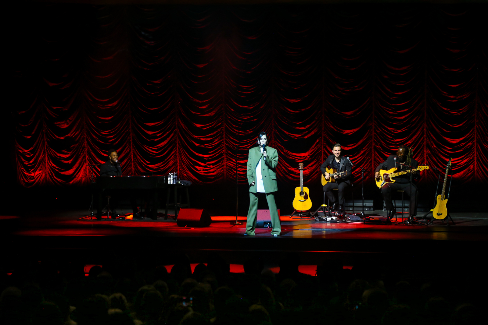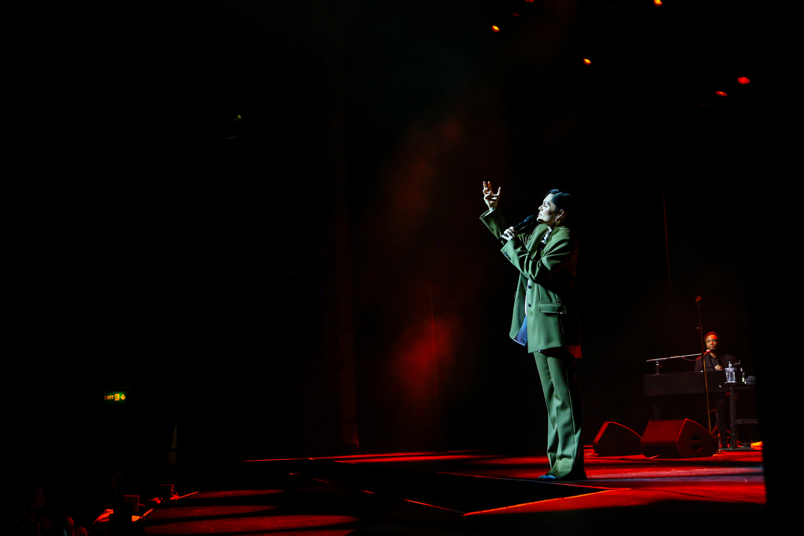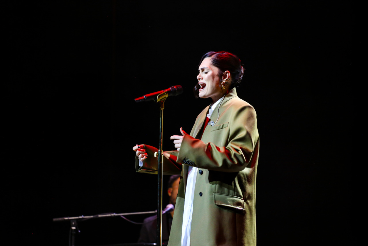 Opening the show in near-darkness, Jessie J’s voice arrives before she does, with the lights coming up to reveal the singer performing from one of the Royal Boxes rather than centre stage. The entrance choice signals the evening’s intention: a focus on the vocal – clear and controlled – while also hinting at the unpredictability to come. She introduces her band almost immediately, positioning them as an integral part of the performance, while the production itself is notably restrained. Against a simple curtain backdrop and a largely empty stage, emphasis is placed firmly on musicianship.