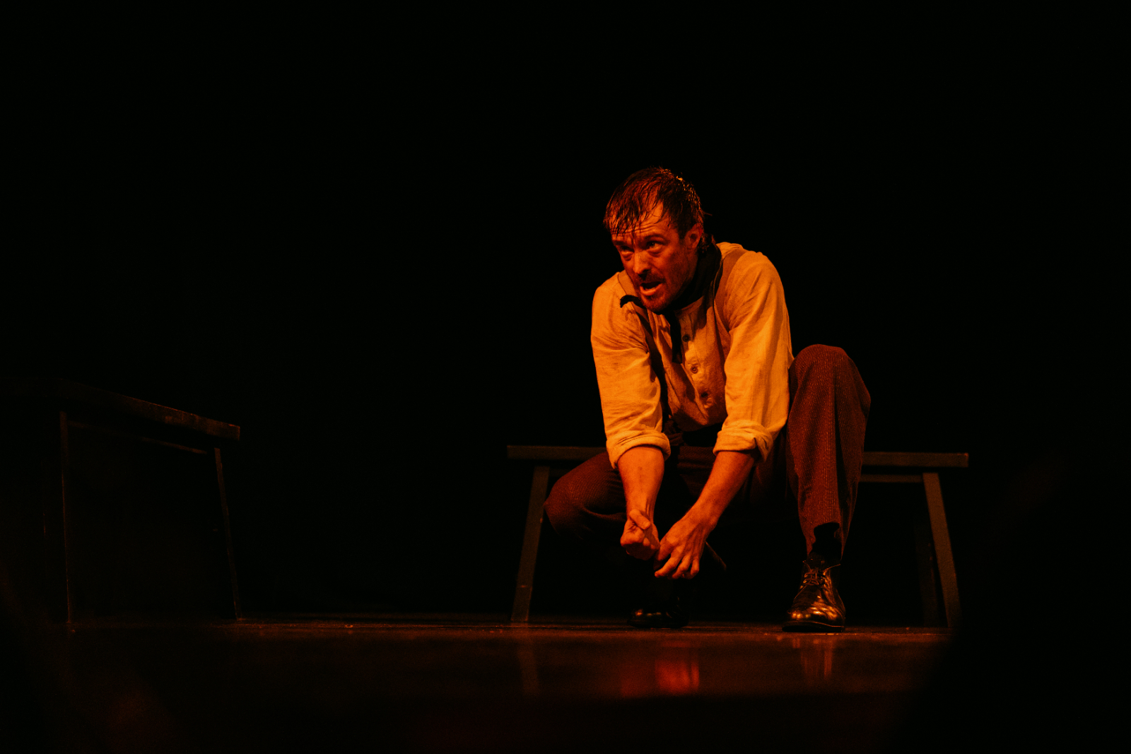 The set is extremely minimal (just two wooden benches), but the sound and lighting design very effectively convey the chaos of the sinking ship. The din of the boiler room and later, the screams of the passengers, heighten the tension of key dramatic moments. The lighting is used cleverly to imitate the fictional world, from the glow of the furnaces to the cold night over the Atlantic.