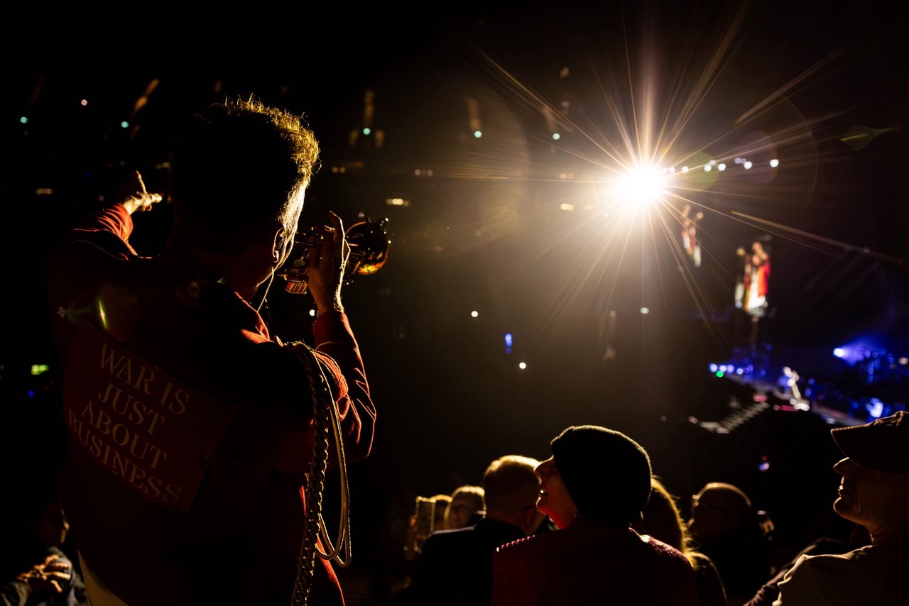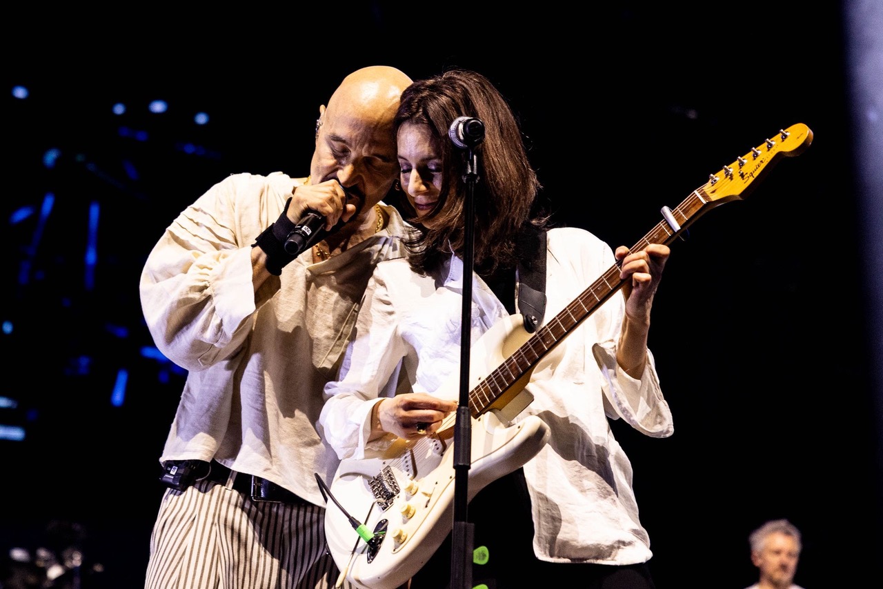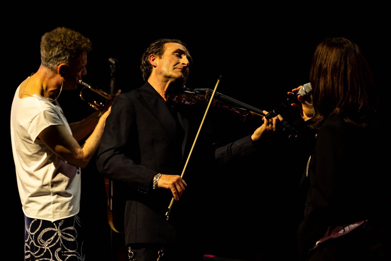 Opening with a bang, the crowd roars with delight, hearing the chugging opening chords of Sound. Frontman Tim Booth deploys his megaphone for the song’s joyful psychedelia, while trumpeter Andy Diagram begins playing under a spotlight way up in the audience and gradually journeys down to the stage. Five-O is next, with Saul Davies switching his guitar for the violin, Adrian Oxaal effortlessly playing ethereal slide guitar, and some stunning three-part harmonies between Booth, Diagram and Chloe Alper.
