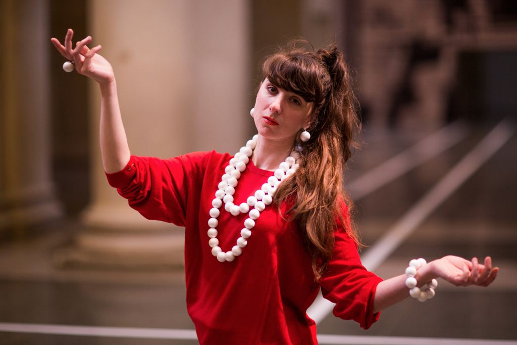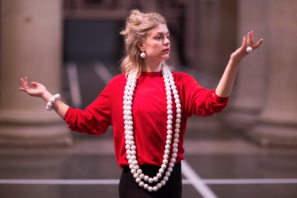 The dancers make studied movements within areas marked off by white tape on the floor that recall the forms of baroque gardens. Their stylised hand movements and dignified steps are inspired by “sprezzatura”, a concept derived from 16th century Italy where courtiers were expected always to act with an air of understated grace and elegance. They wear the leggings and dance shoes of classical ballet, but their red sweatshirts and bespoke oversized jewellery recall the fashions of the 1980s, encouraging the viewer to think about the strange, anachronistic mixes present in the exhibition. Similarly, the choreography bears a resemblance not only to baroque courtly dances but also to experimental performance pieces by artists such as Bruce Nauman.