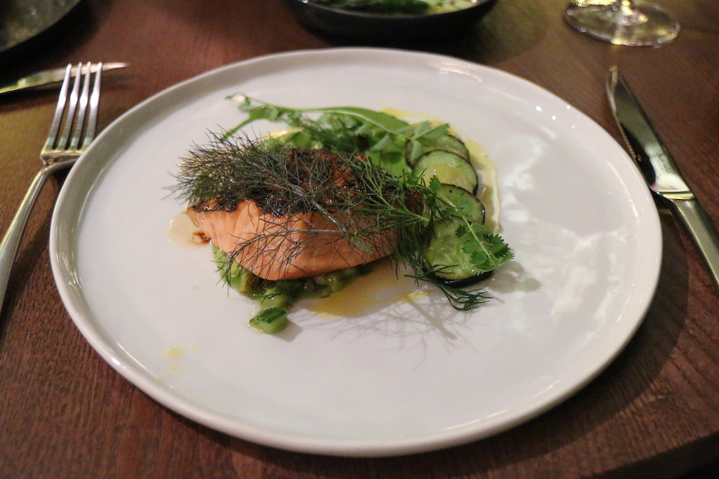Even the mains territory will take a few stops to explore adequately. Tempted by the lamb, I let the waiter convince me that the Wagyu-style Galician Beef Sirloin Sauce Béarnaise was the right choice for me. On paper, the ludicrous-sounding Our Chips, Pecorino, Foie Gras are its obvious counterpart: there isn’t enough foie gras to actually taste but, let’s face it, it’s a brilliant name. The Salmon 50/50, Cucumber, Dill might seem more of a healthy choice but it’s cooked in an intriguing way: one side is grilled and then it’s finished under the salamander, leaving the other half full of juices. As much as I appreciate raw fish, this dish creates an expectation of something a bit more cooked. It’s nevertheless exquisite.
