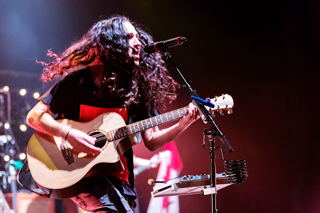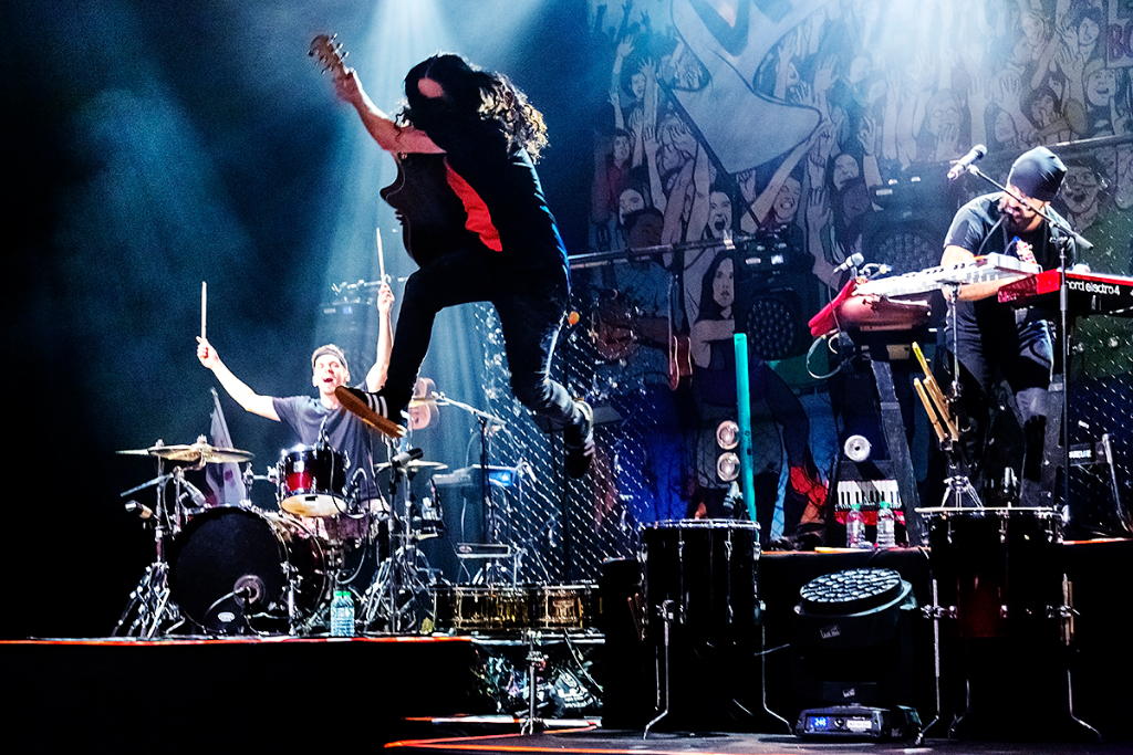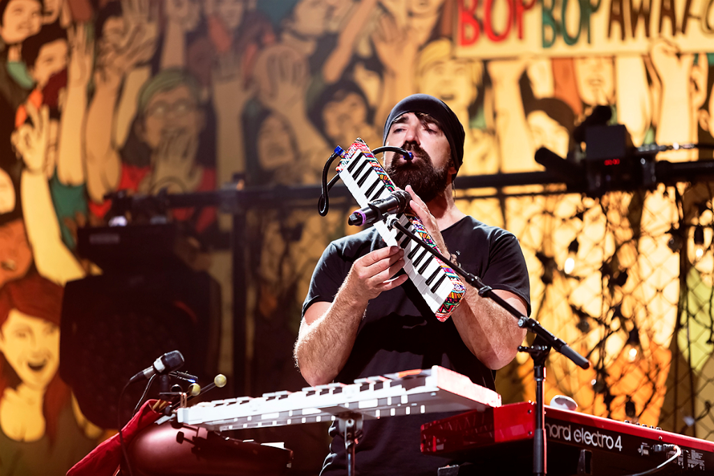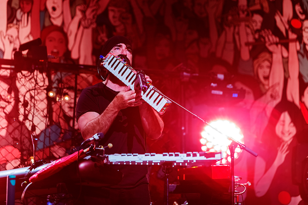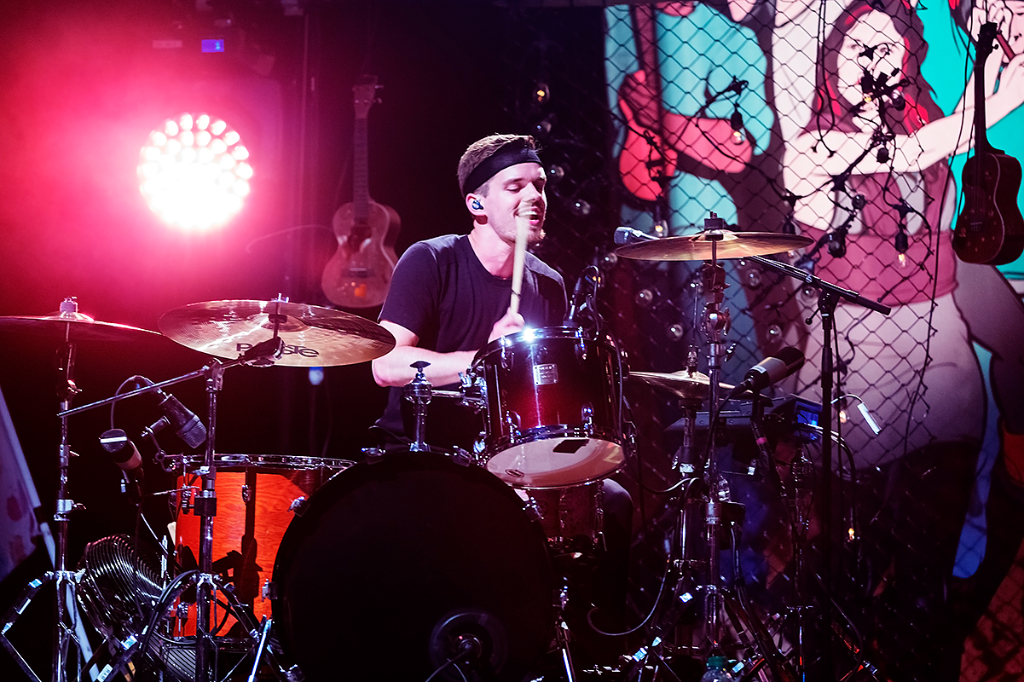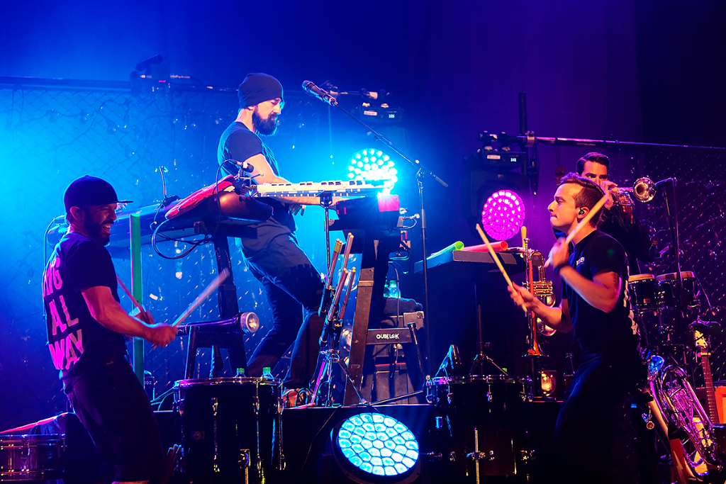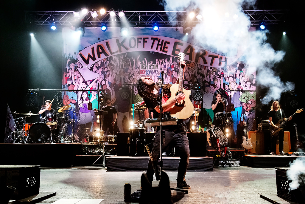 Versatile Canadian band Walk off the Earth made its entrance as a huge, explosively eager crowd clapped and cheered. The powerful group sound like warriors on battle drums, and with a multitude of coloured lights and massive shooting smoke, the ambience was very theatrical. The lively performance included several drum sets, three trumpets, keyboards and guitars, and was amplified by explosive special effects such as huge bursts of sparkling confetti and multi-coloured blasts of smoke.