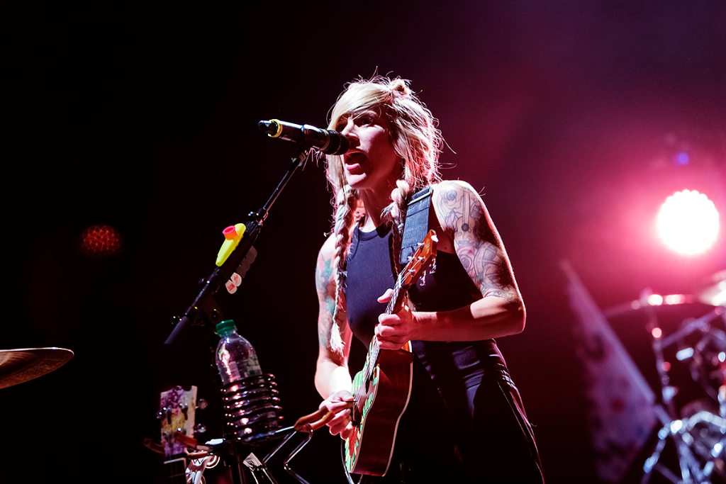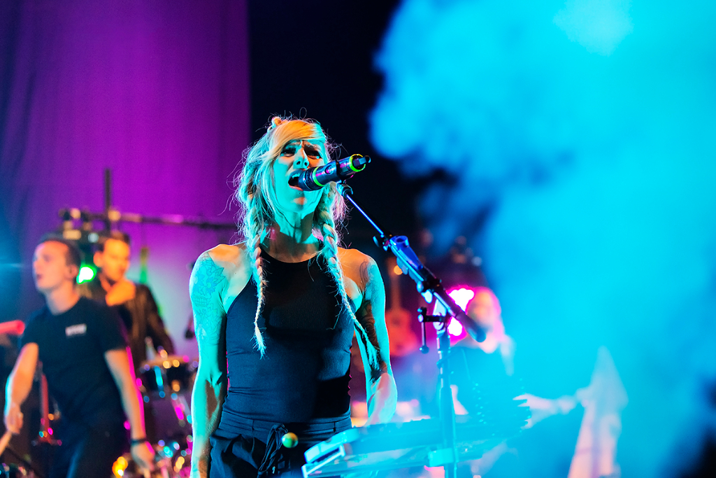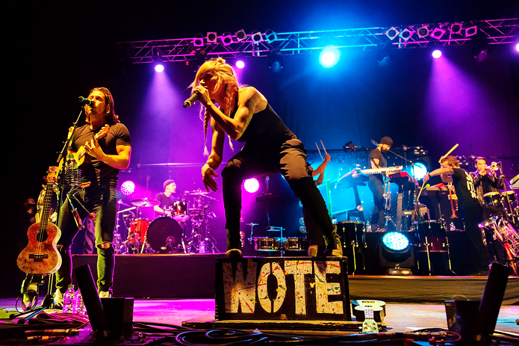 Gold lights shimmered with Sing It All Away, cheers erupted for the favourite Happy and the emotional Hold On. The musicians twirled balloons to Speeches, and after Hello and Cheerleader, guitarist Gianni Nicassio threw a shirt into the audience. Sounding like early Madonna, maybe better, Sarah Blackwood crooned Material Girl, later followed by Shake It Off and Cheers (Drink to That), which were accompanied by abundant arm waving and a guitar tossed across the stage by Nicassio. The super metal rock I Knew You Were Trouble and REVO inspired much jumping by the audience and the artists.