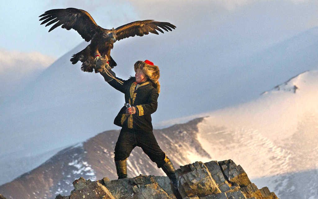 The girl in question is Aisholpan, a 13-year-old nomadic Kazakh who lives in the Altai Mountains. Her father, Nurgaiv, introduces her to eagle hunting; he teaches her how to call the eagle, feed the eagle, and steal the eagle’s babies so that she, too, can have an adorable critter to call her own. She demonstrates such obvious talent that they attend a local contest, with encouraging results; she eventually ends up in the snow-covered mountains hunting a fox – the final test of an eagle hunter’s skill.