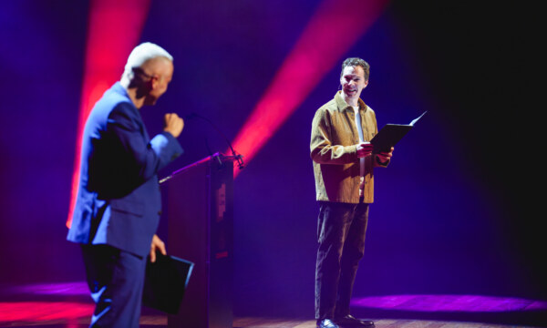 The setting – and the role of the stage in the narrative – is very well curated. With neat projections – and the background wall disappearing in order to open a window into the past, or a devastated Xbox world – the actors are free to interact with the space and move in time as the story develops or memories are recalled. The sound design also doesn’t leave anything to chance, from the subdued volume of the music coming from the headphones to the crowd’s choruses in the distance.