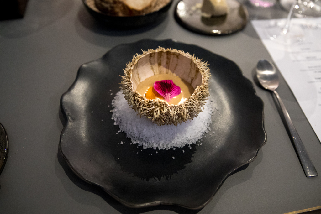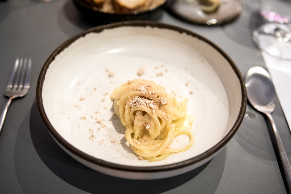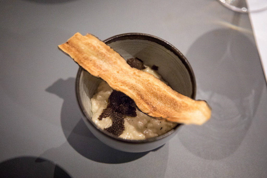 The chef’s flair erupts with a Sea Urchin, served with bagna càuda (a traditional Piedmontese hot dish made with extra-virgin olive oil, butter and anchovies for dipping purposes), quail egg and fermented milk. While it might seem daring from the sound of it, it’s actually very well balanced and – more importantly – exquisite. It’s followed by a safer dish, Wild Enoki, which is a (non)risotto made with mushroom instead of rice – and covered with Alba black truffle.