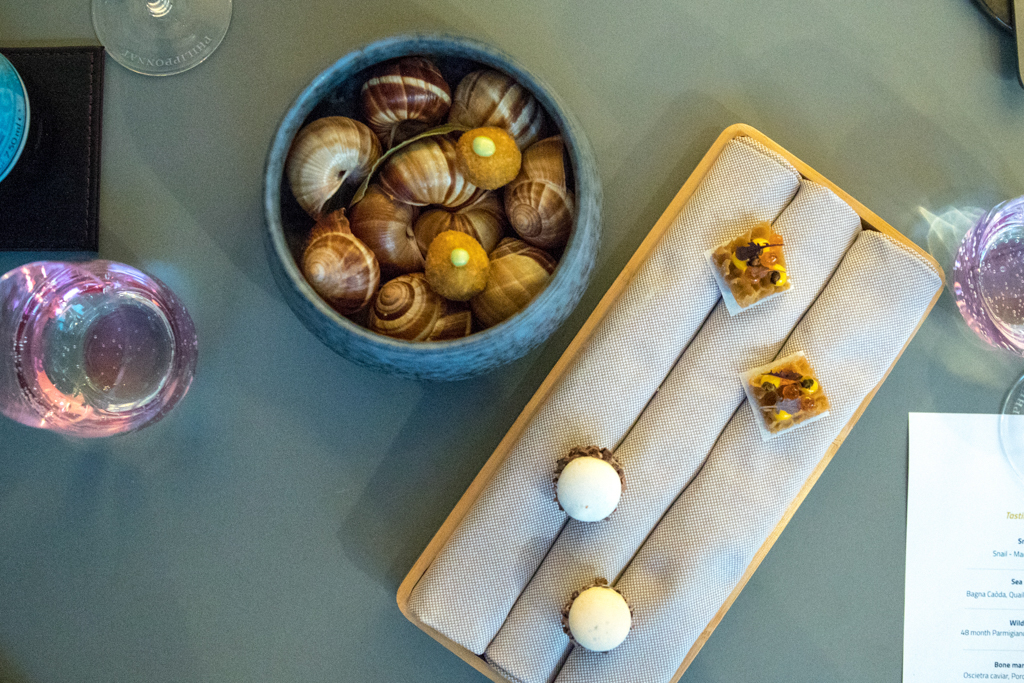 Luzarraga has a complex background; born in Chile and brought up in Piedmont, he honed his cuisine mixing the influences of his Basque father, Ligurian grandfather and Piedmontese mother. This blend of cultures – and the three years at Alain Ducasse’s celebrated Le Louis XV in Monaco – are immediately reflected in the snacks from the tasting menu: snails, pigeon macaroons and tripe. We have them with a glass of delightful Philipponnat Royale Réserve Non Dosé.