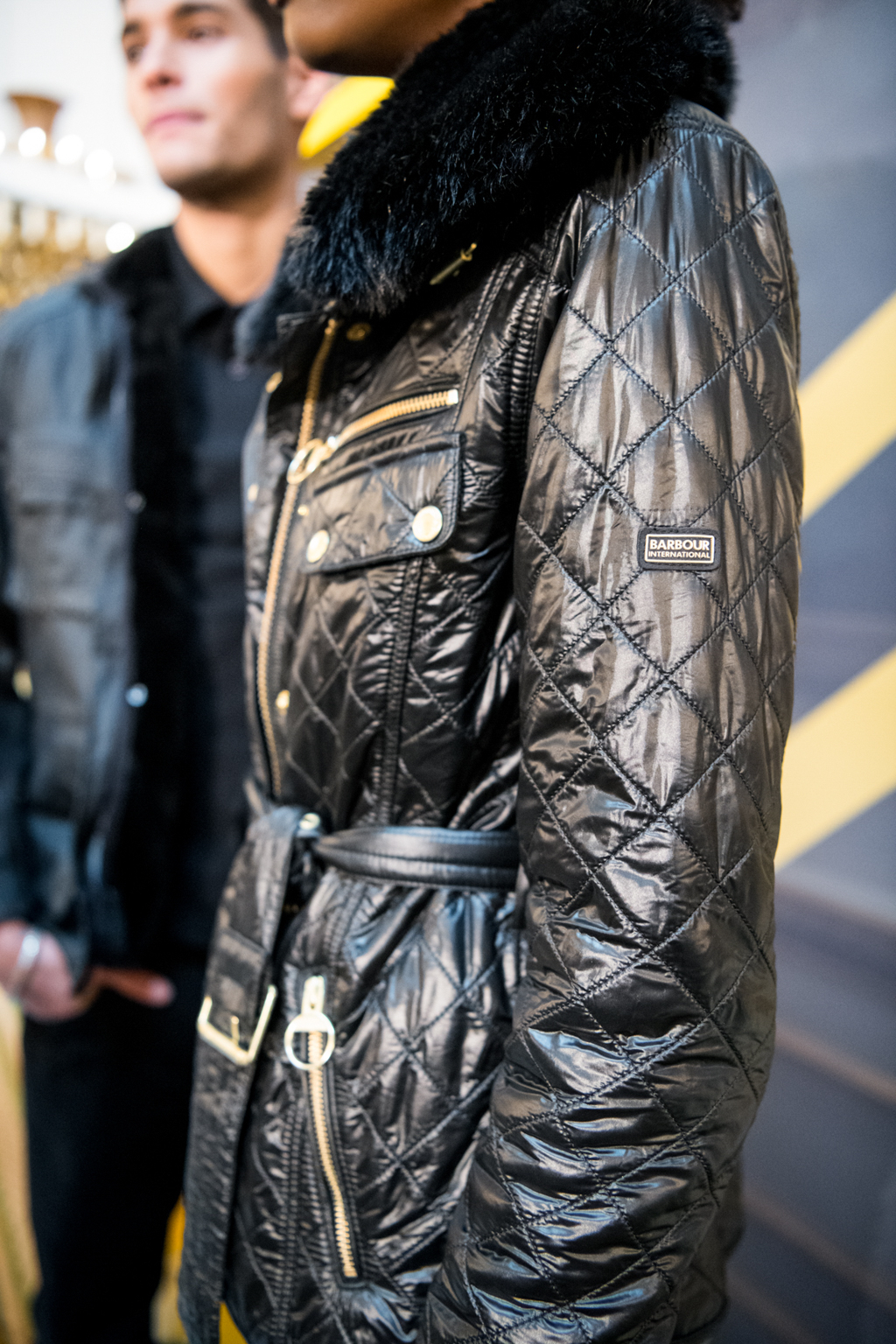 The Barbour narrative continues by introducing Barbour International, under which the motorcycle suit was invented specifically for the International Six Day Trials, with a contemporary female version that captured viewers’ attention the most thanks to its diamond quilted pattern, golden details, waist belt and shearling collar.