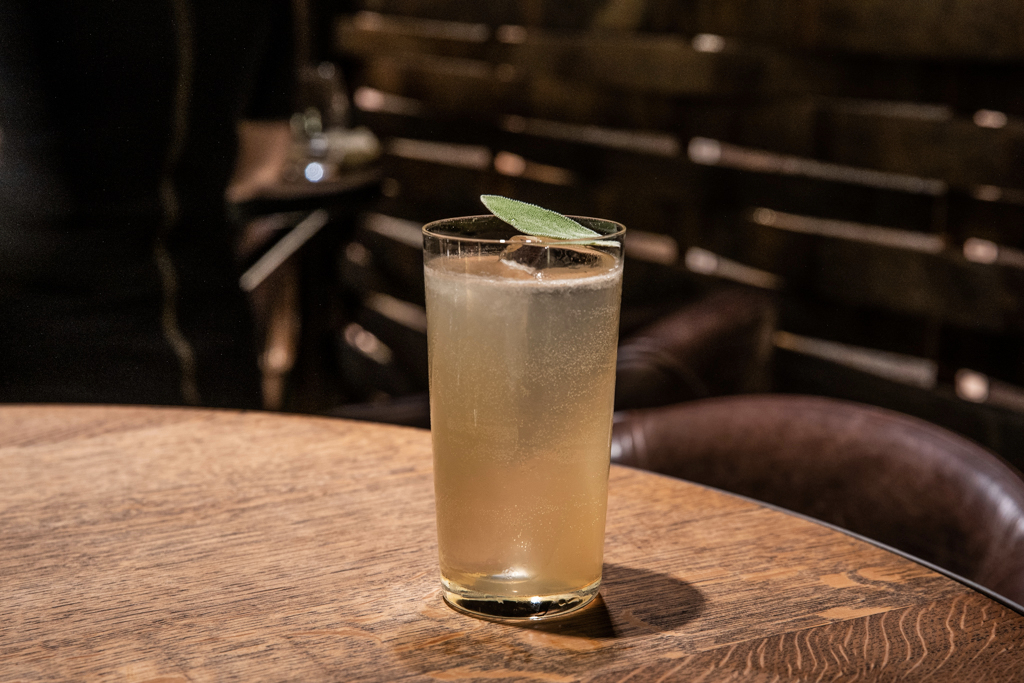 Panacea is a slightly less dazzling option, with H by Hine cognac and pear soda. However, Kinberg’s intention of playing with less common ingredients is evident again through the addition of sage.