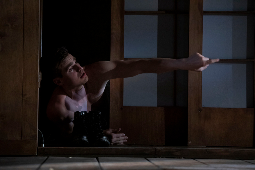 Visually arresting, the play has a cinematic approach but also pays tribute to theatre, for instance via a play-within-the-play and references to Japanese performance traditions. There are often homes or interior spaces containing the action, with the outside structure clearly outlined and doors or windows included. This gives the feeling of peeping in from the outside and discovering a melancholy secret behind every closed door. By peering in, we see more authentic identities emerge in intimate spaces.
