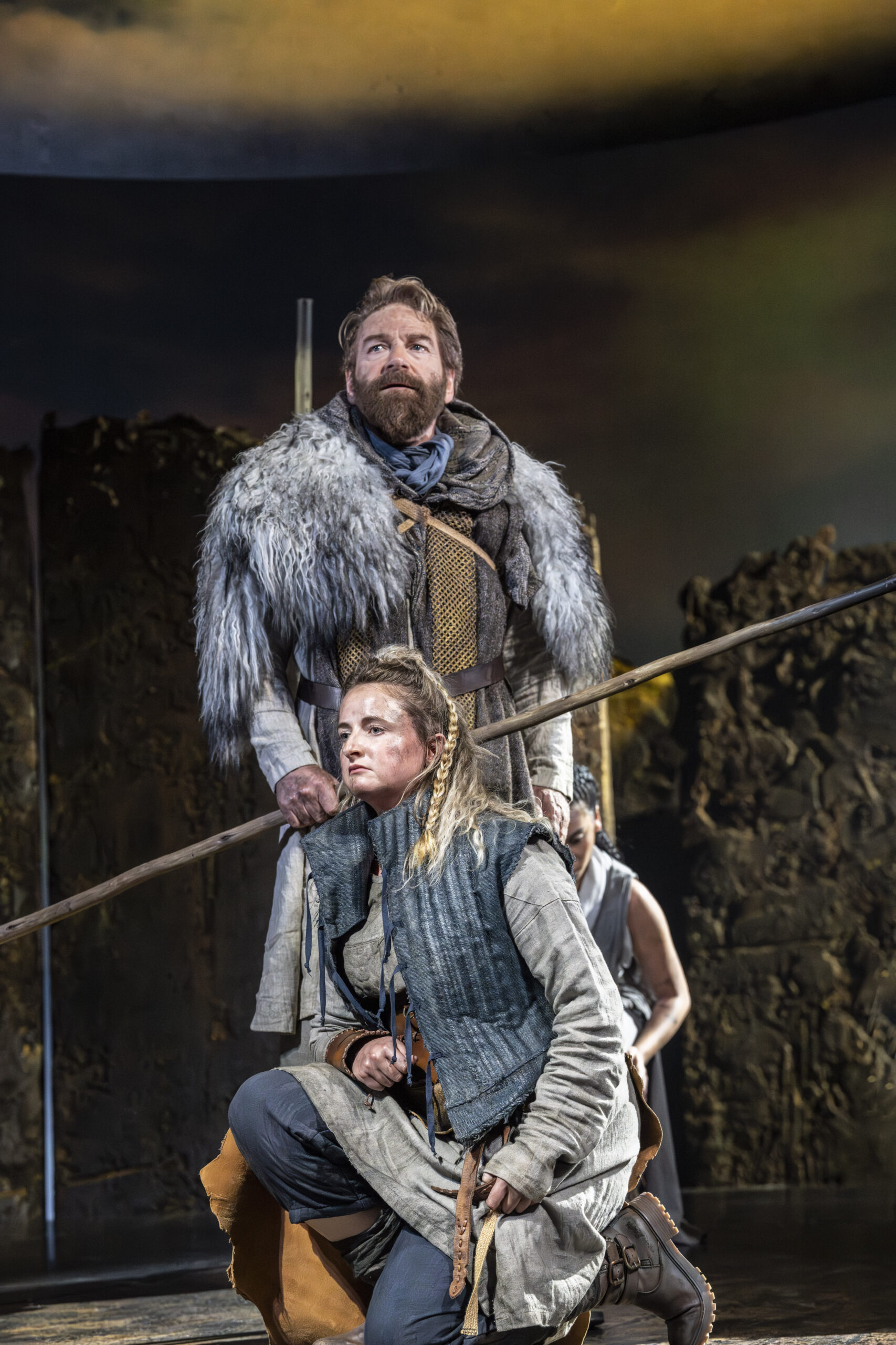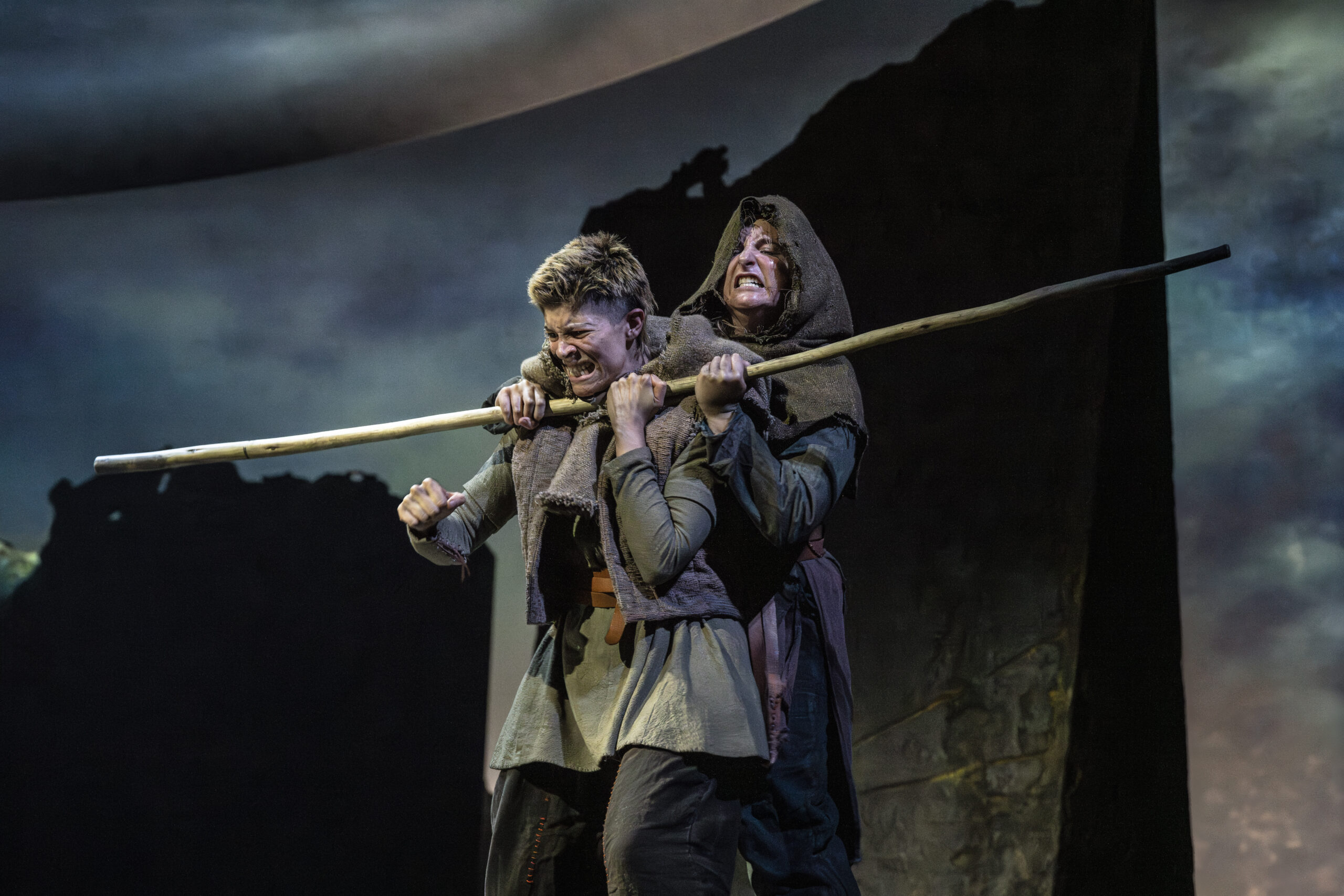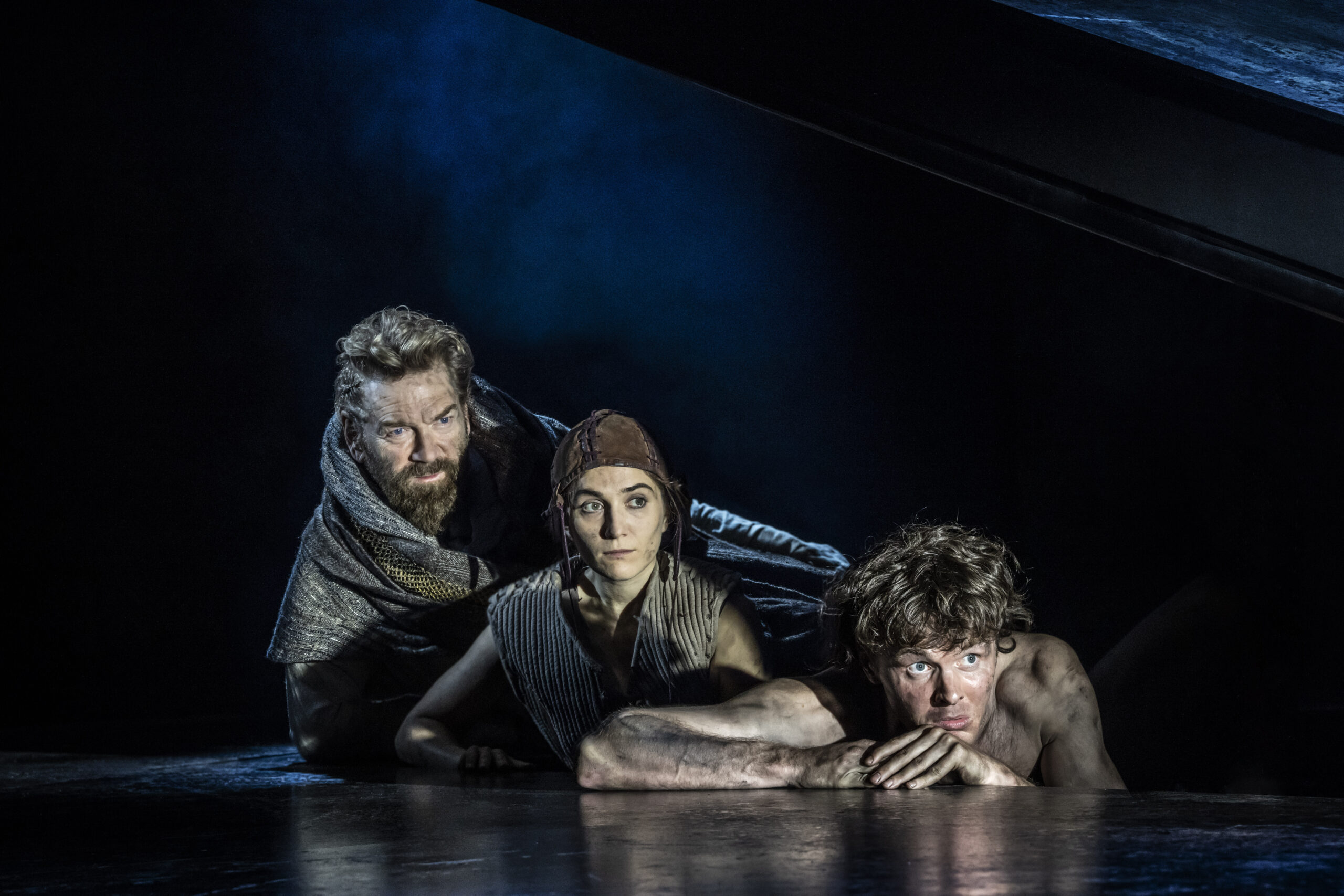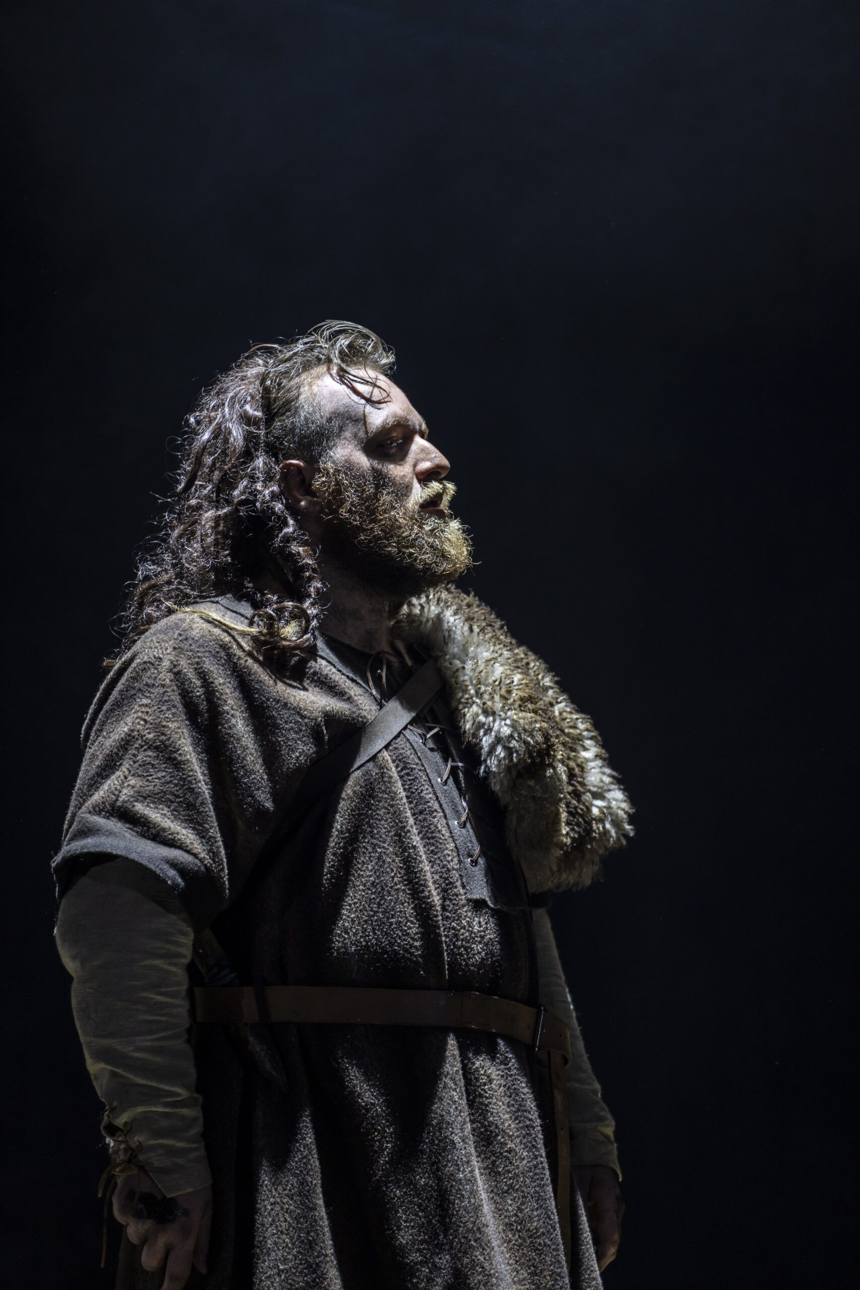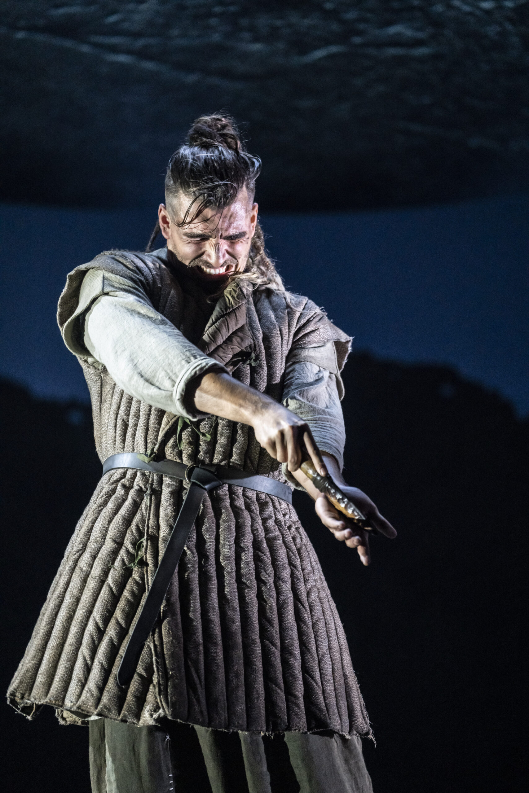The primitive setting highlights the cruelty and bloodthirstiness of the tribes. Yet, the strong, positive moments, such as those from the banished Cordelia and the disguised philosopher Edgar (Doug Colling), stand out, not only as beacons of hope and tenderness amid the darkness, but also in their performances. The moving set design is kept natural, almost rough, and free from any traces of human development, with rocks that expand or contract to define indoor and outdoor spaces. The circular ceiling with an oculus, opening to the sky to cast light or shadows, is particularly striking. However, the close-up projections of faces add little to the context and ambience. What actually enhances the atmosphere are the sounds, from the drums to the distant waves, which are a constant presence (especially in the latter part), coupled with the dramatic lighting. The setting then leaves centre stage to the acting and dynamics, although at times these lack cohesion and intensity (such as in Gloucester’s fall into ruin), except for the final battles where the coordination of movements and dialogue sequences is tight and captivating.
