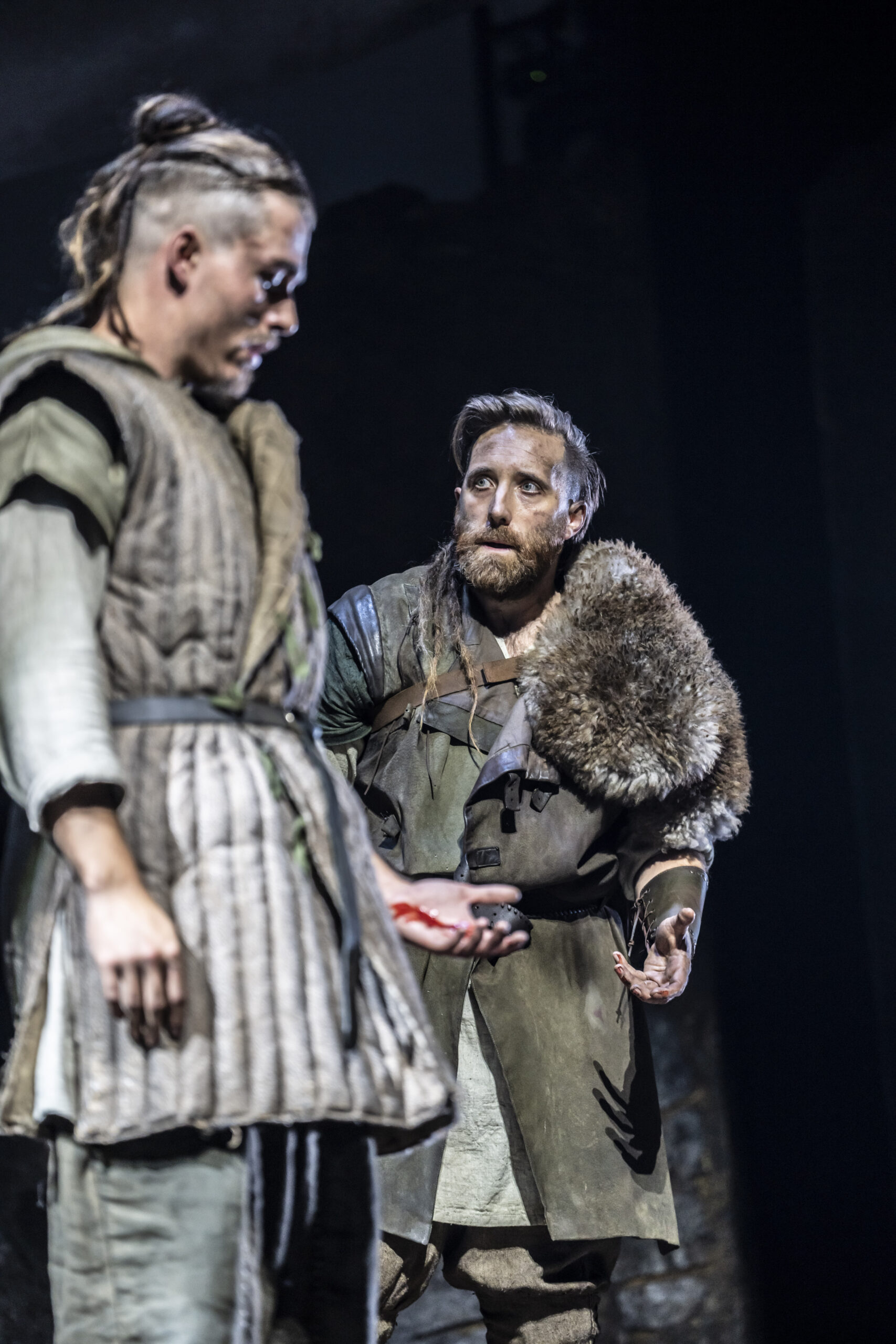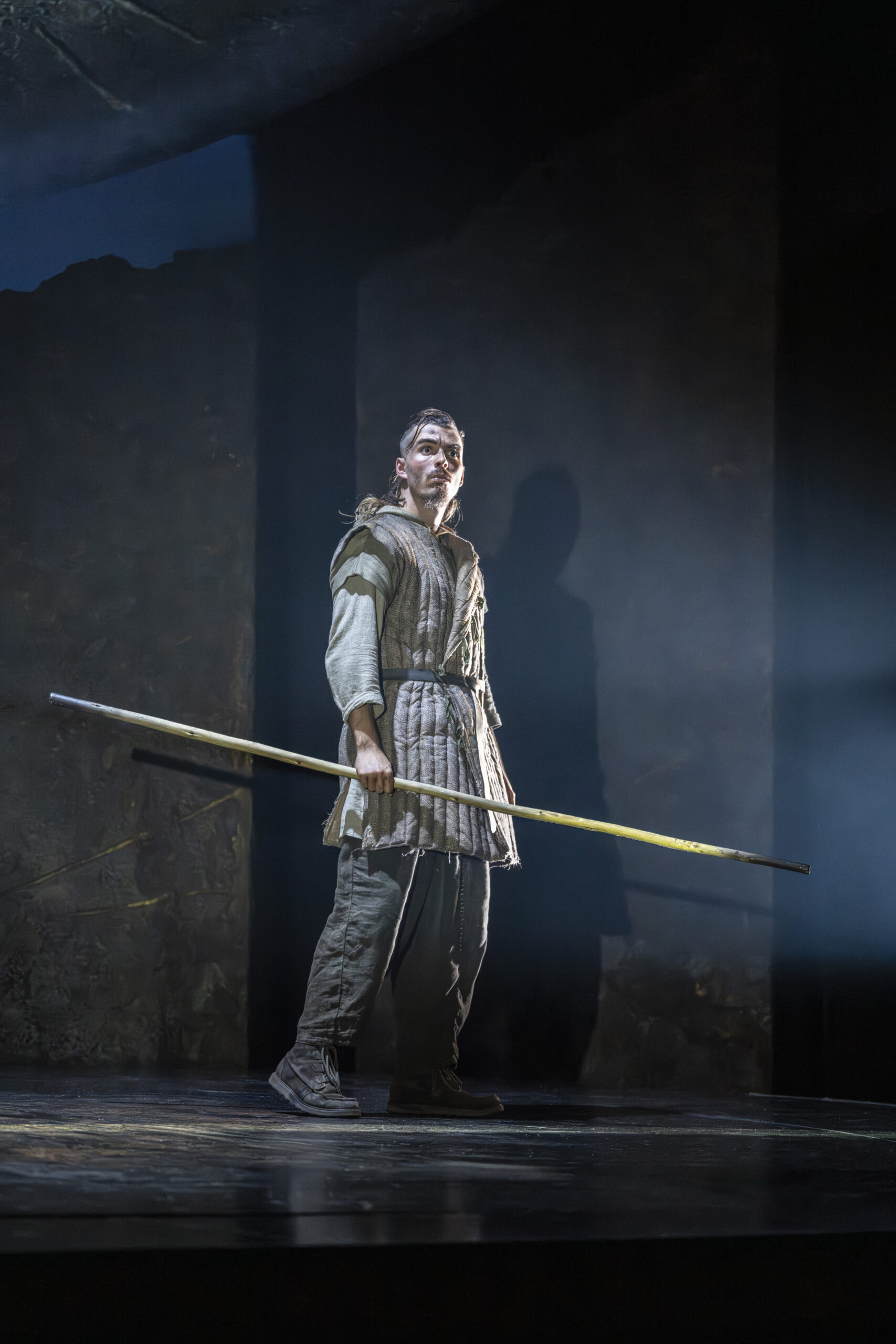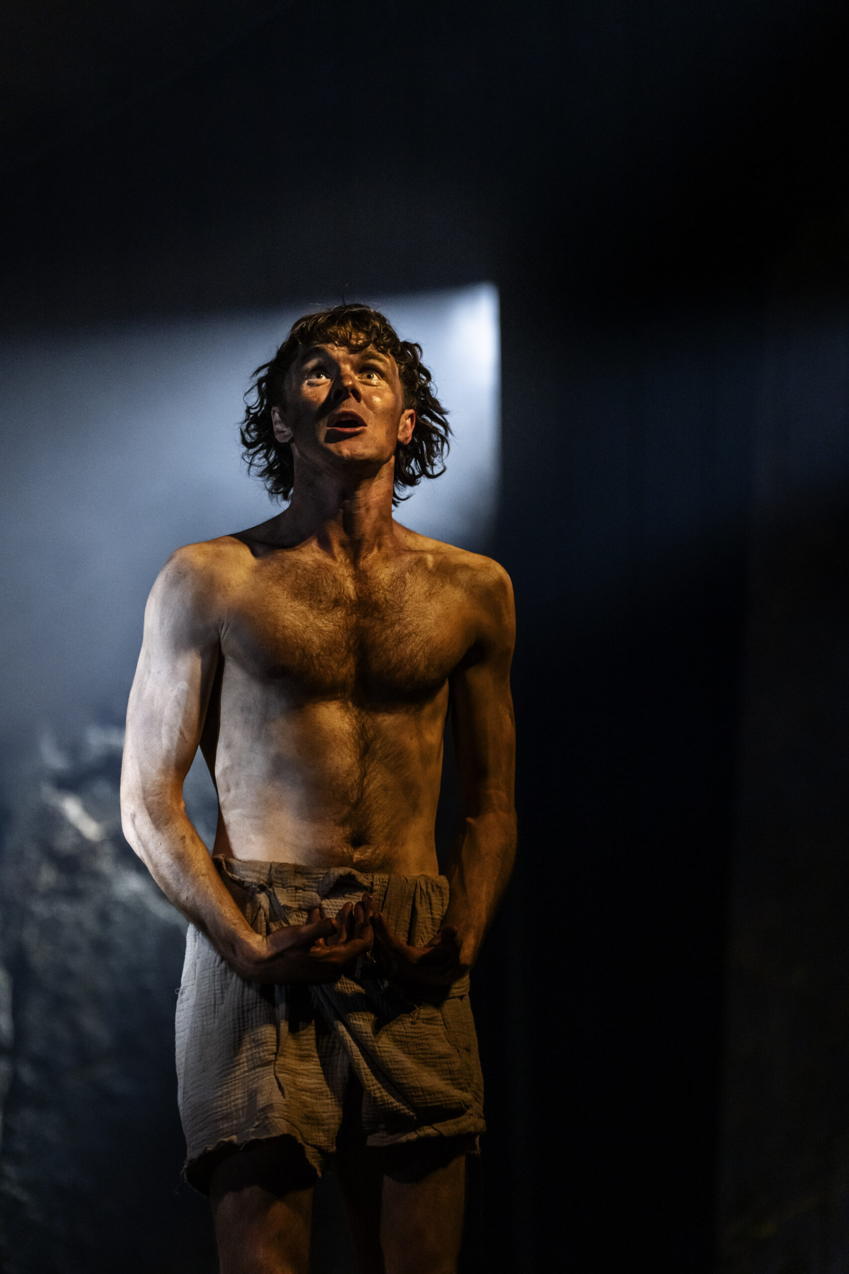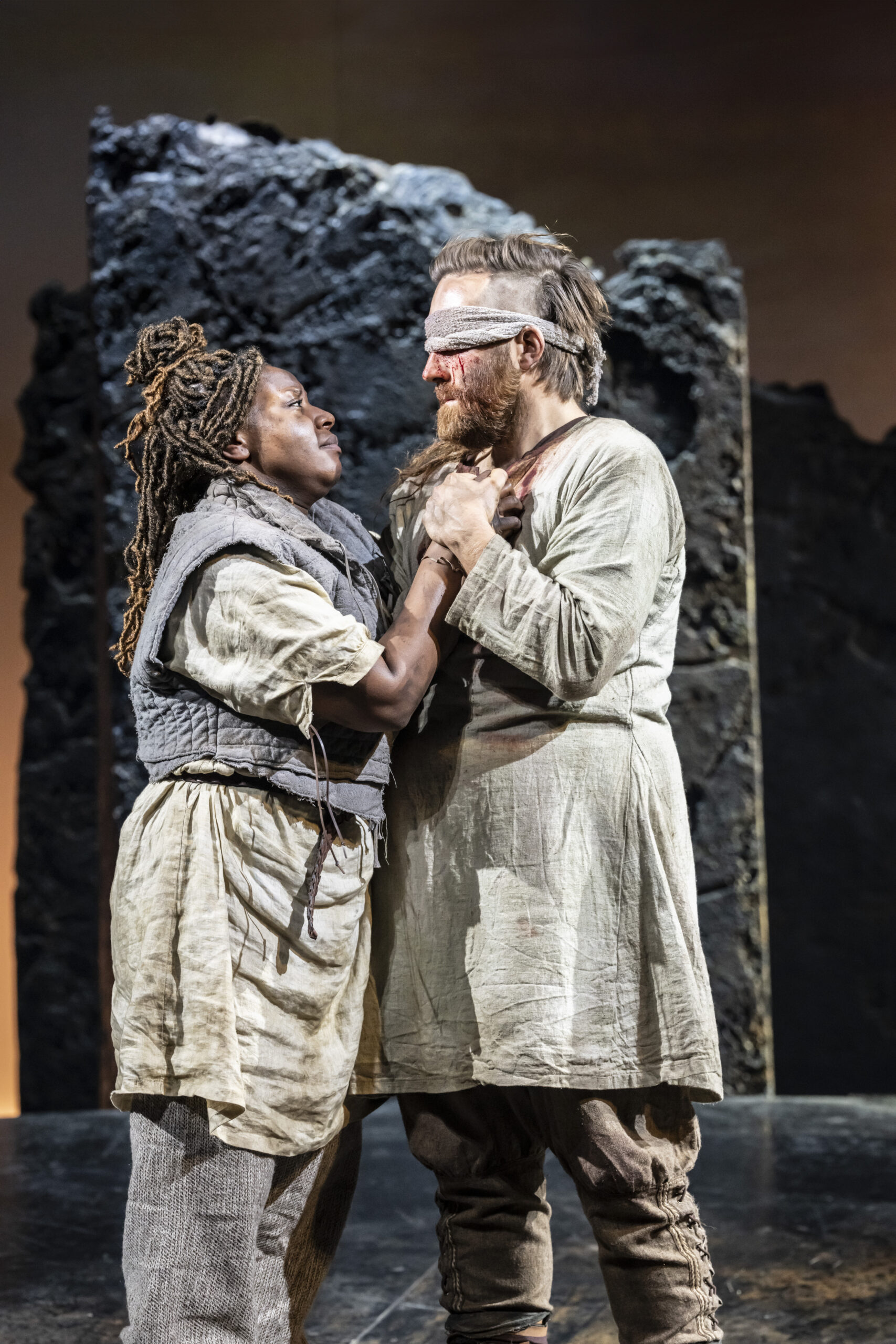 The primitive setting highlights the cruelty and bloodthirstiness of the tribes. Yet, the strong, positive moments, such as those from the banished Cordelia and the disguised philosopher Edgar (Doug Colling), stand out, not only as beacons of hope and tenderness amid the darkness, but also in their performances. The moving set design is kept natural, almost rough, and free from any traces of human development, with rocks that expand or contract to define indoor and outdoor spaces. The circular ceiling with an oculus, opening to the sky to cast light or shadows, is particularly striking. However, the close-up projections of faces add little to the context and ambience. What actually enhances the atmosphere are the sounds, from the drums to the distant waves, which are a constant presence (especially in the latter part), coupled with the dramatic lighting. The setting then leaves centre stage to the acting and dynamics, although at times these lack cohesion and intensity (such as in Gloucester’s fall into ruin), except for the final battles where the coordination of movements and dialogue sequences is tight and captivating.