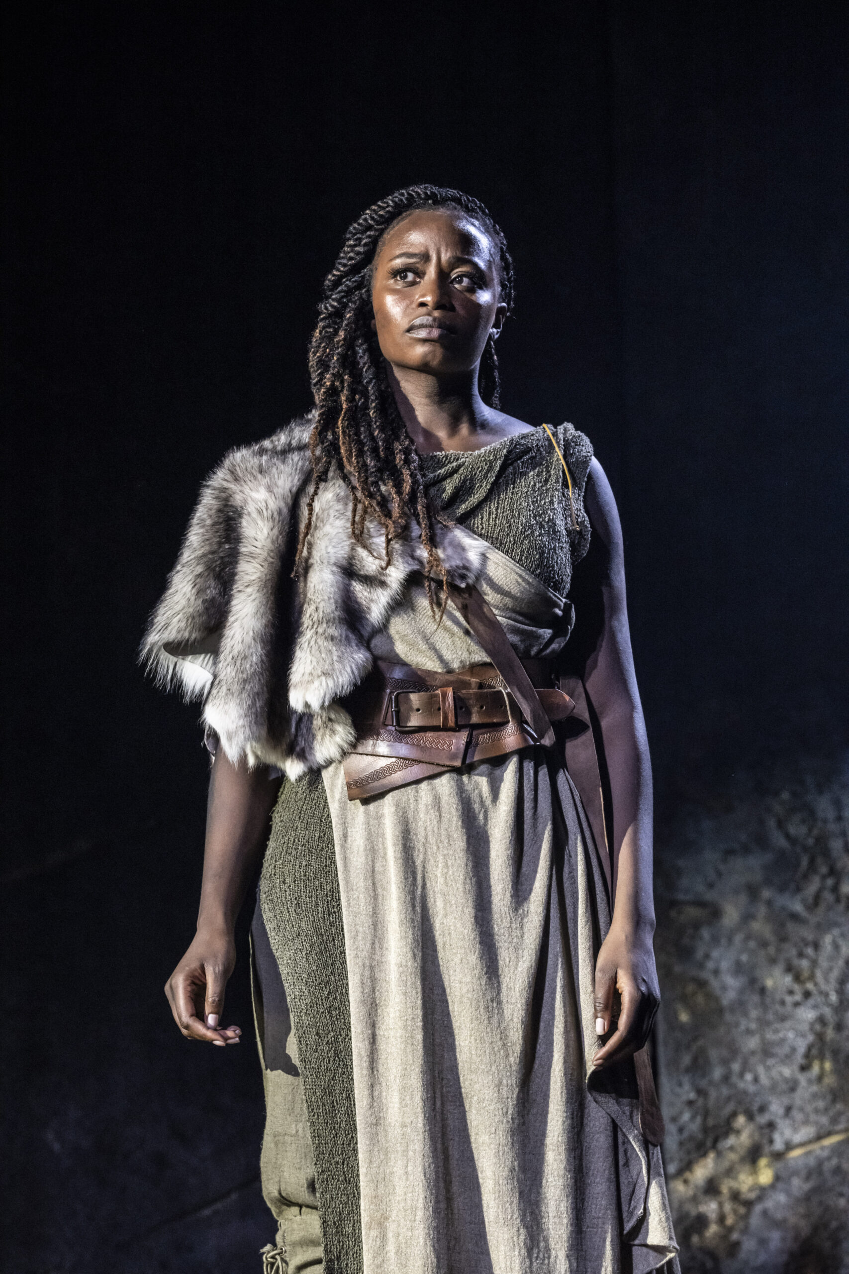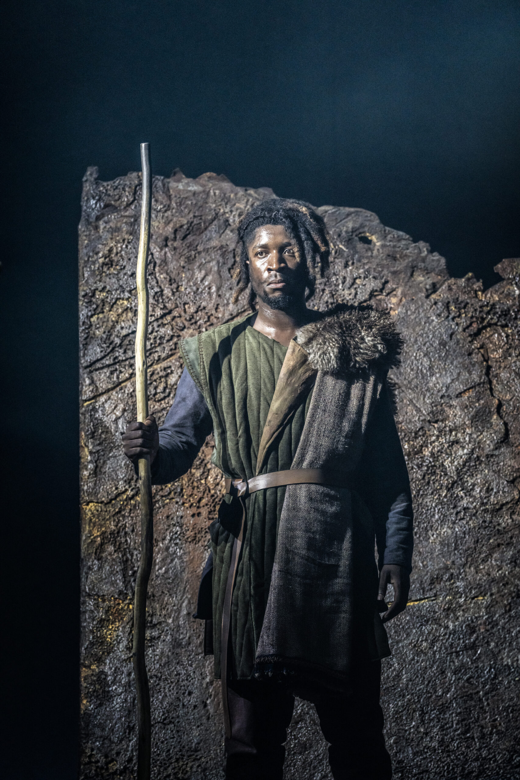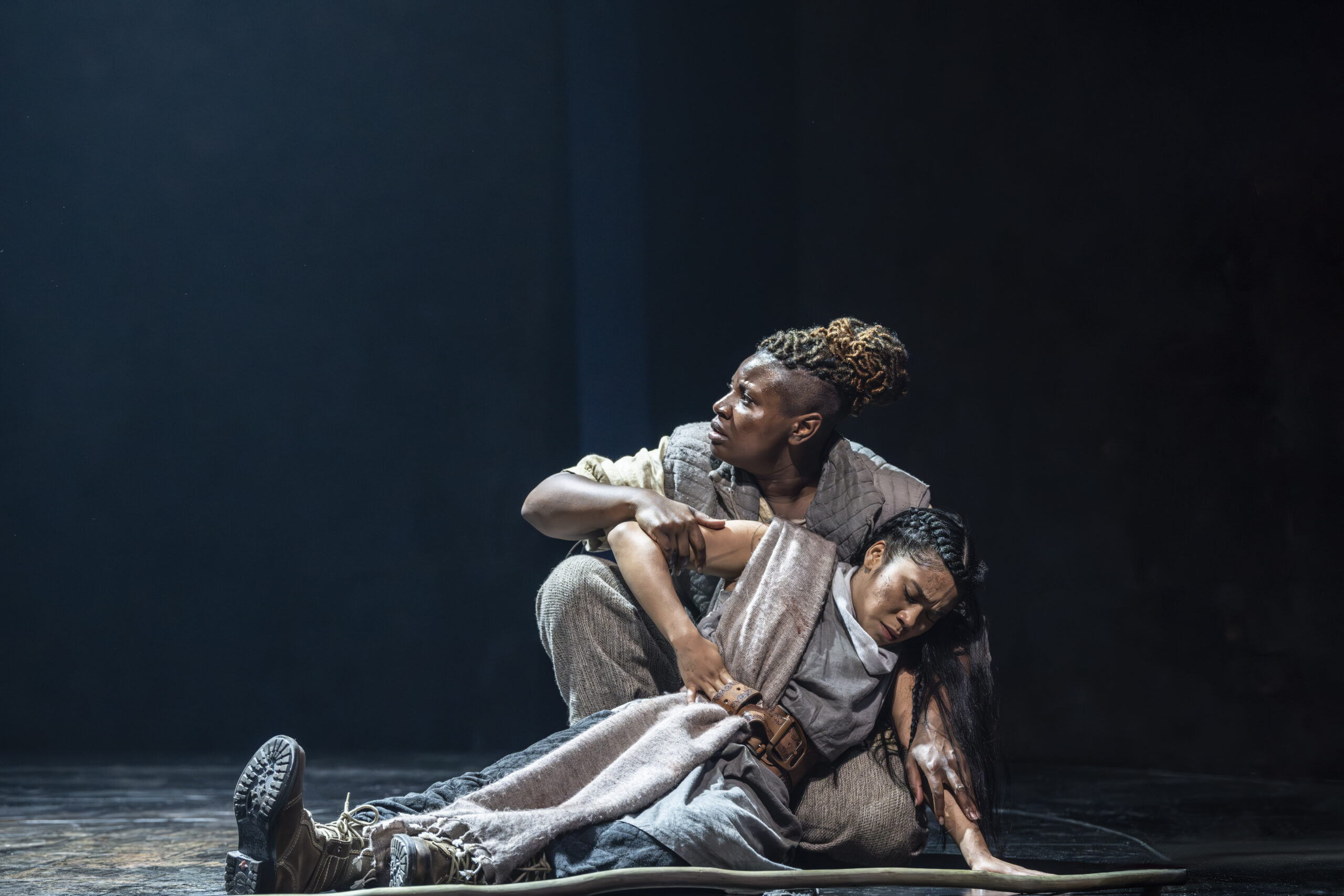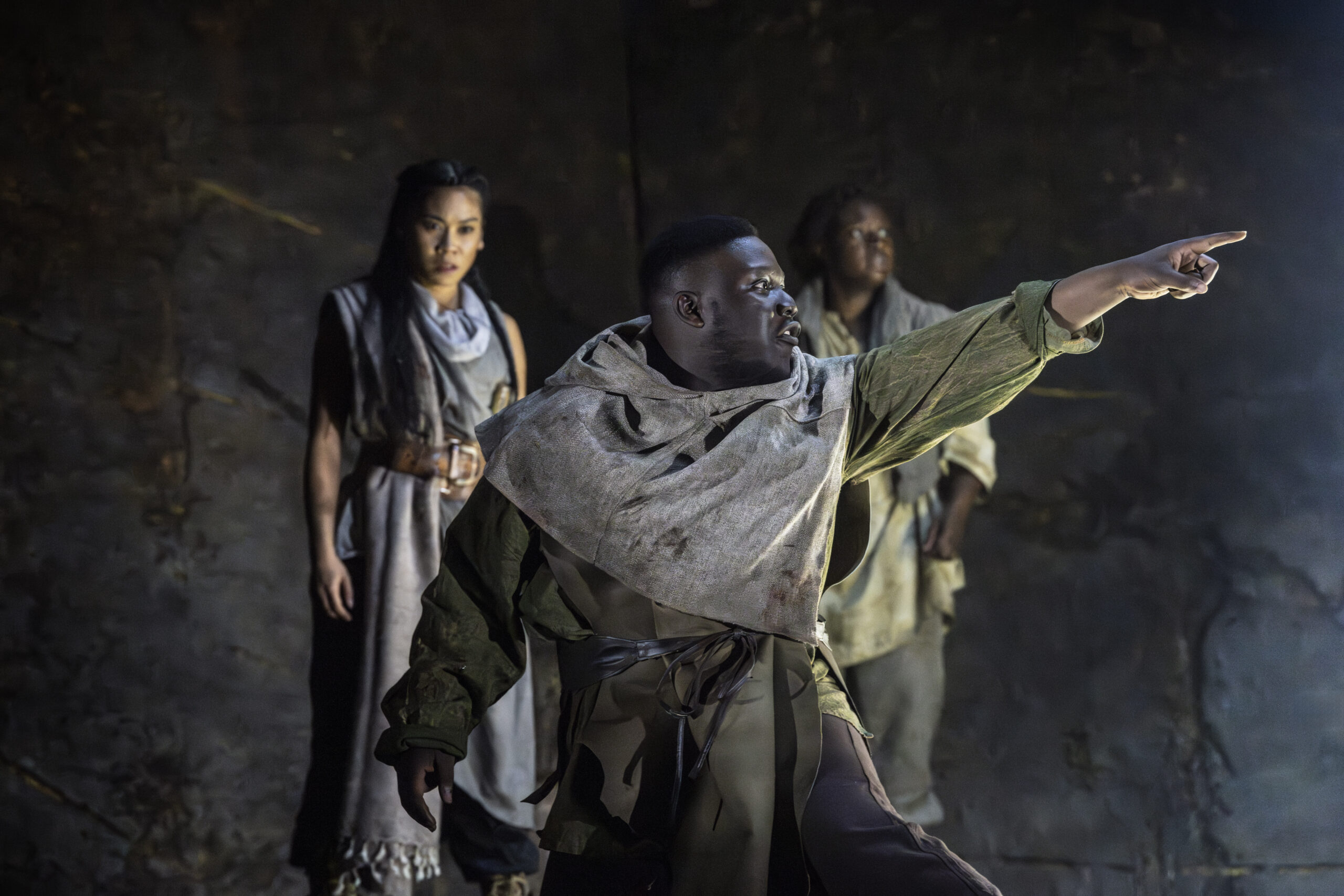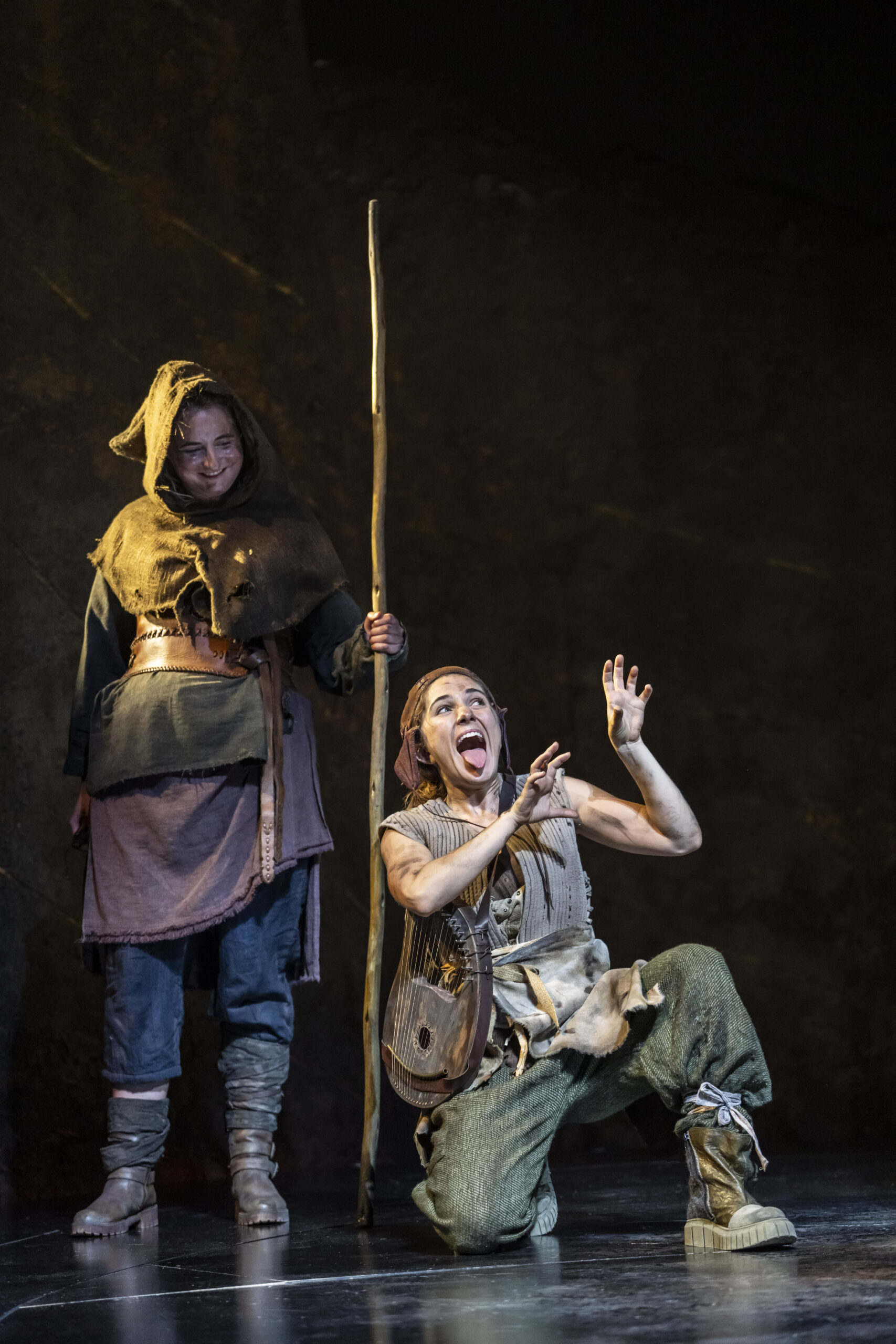The primitive setting highlights the cruelty and bloodthirstiness of the tribes. Yet, the strong, positive moments, such as those from the banished Cordelia and the disguised philosopher Edgar (Doug Colling), stand out, not only as beacons of hope and tenderness amid the darkness, but also in their performances. The moving set design is kept natural, almost rough, and free from any traces of human development, with rocks that expand or contract to define indoor and outdoor spaces. The circular ceiling with an oculus, opening to the sky to cast light or shadows, is particularly striking. However, the close-up projections of faces add little to the context and ambience. What actually enhances the atmosphere are the sounds, from the drums to the distant waves, which are a constant presence (especially in the latter part), coupled with the dramatic lighting. The setting then leaves centre stage to the acting and dynamics, although at times these lack cohesion and intensity (such as in Gloucester’s fall into ruin), except for the final battles where the coordination of movements and dialogue sequences is tight and captivating.