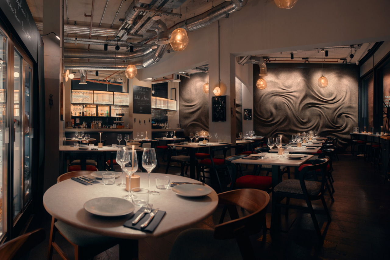 An intimate sub-level dining room,...